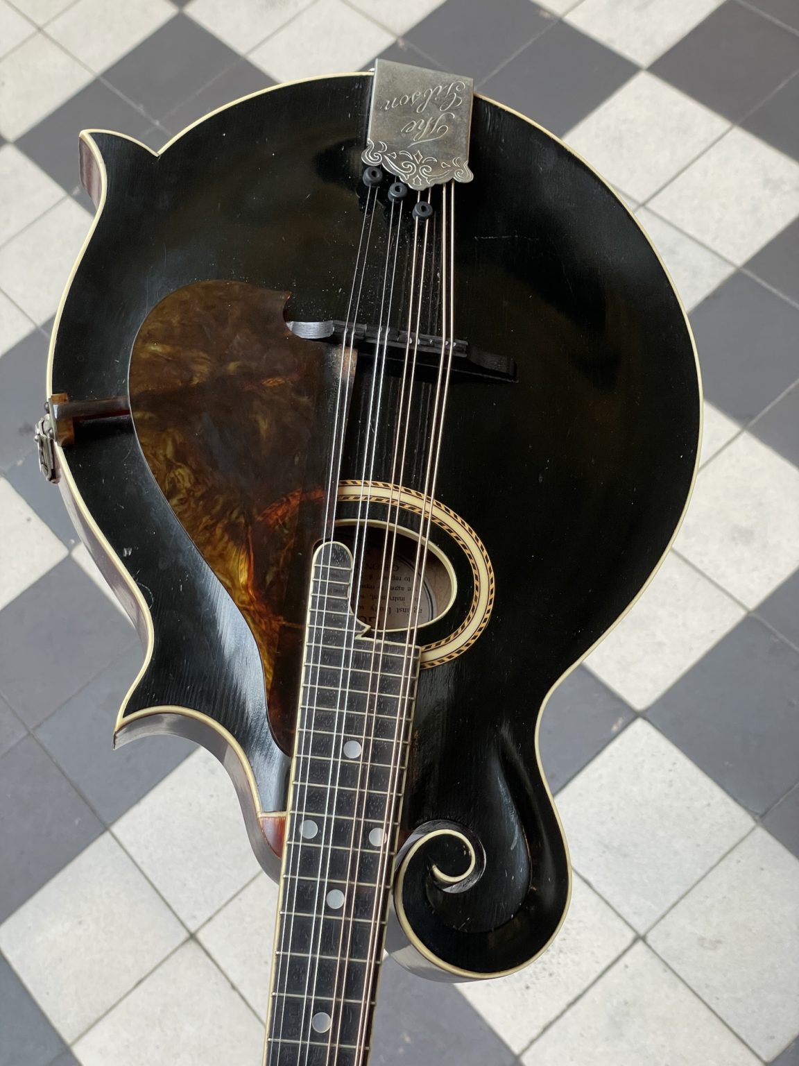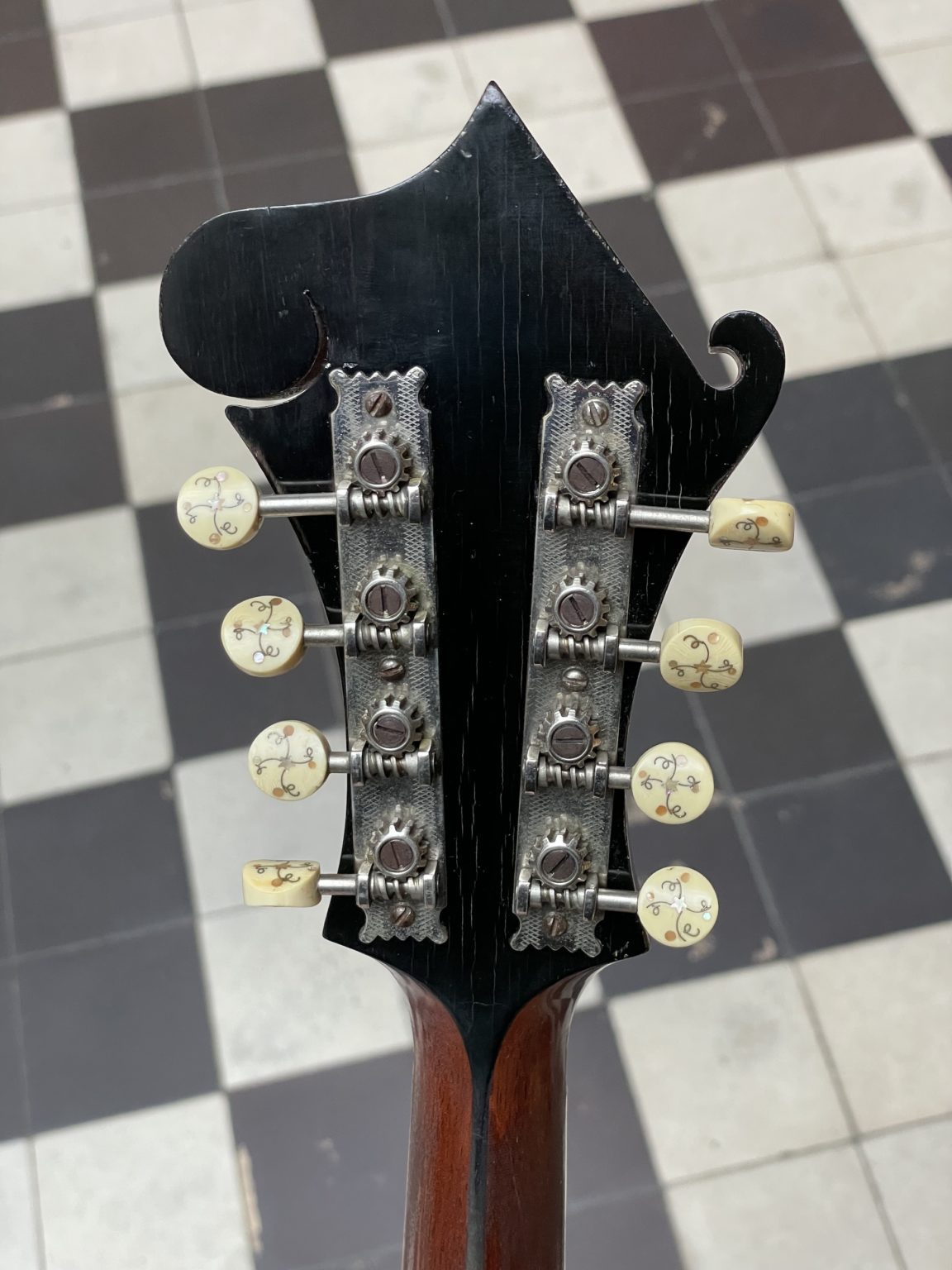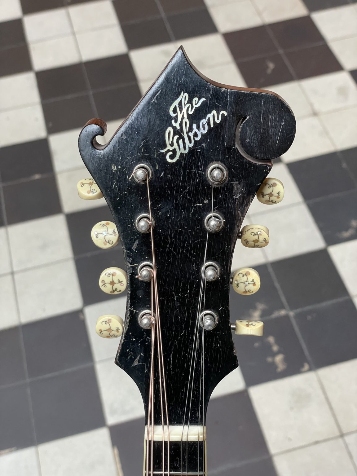 At the time of its manufacture almost 112 years ago, this Artist model was right near the top-of-the-line among Gibson’s offering, short of being an F-4 model – the two styles are very similar in construction, differing only in the degree of decoration and the use of birch on the back and sides of the F-2 instead of maple on those of the F-4. Incidentally, the F-2 mandolin was sold for $75.00 in 1912, which represented a significant sum for the time. The original hardware is present in its entirety and in very good condition, including the raised celluloid pickguard fixed by a metal clamp allowing the height to be adjusted, Handel tuners, named after the New York company who produced these finely crafted pieces with ivoroid buttons inlaid with pearl and silver thread (they are also found on period instruments from other manufacturers such as Martin or Lyon & Healy), the tailpiece cover engraved with the name of the The Gibson brand and an ebony bridge with individual compensation for each pair of strings. In 1912, many of these elements constituted recent innovations (evidenced by the fact that many bear patent numbers dating back to a few years at most), and the Gibsons of this period condensed, well before the advances of the 1920s, a number of determining components for the further evolution of American lutherie.