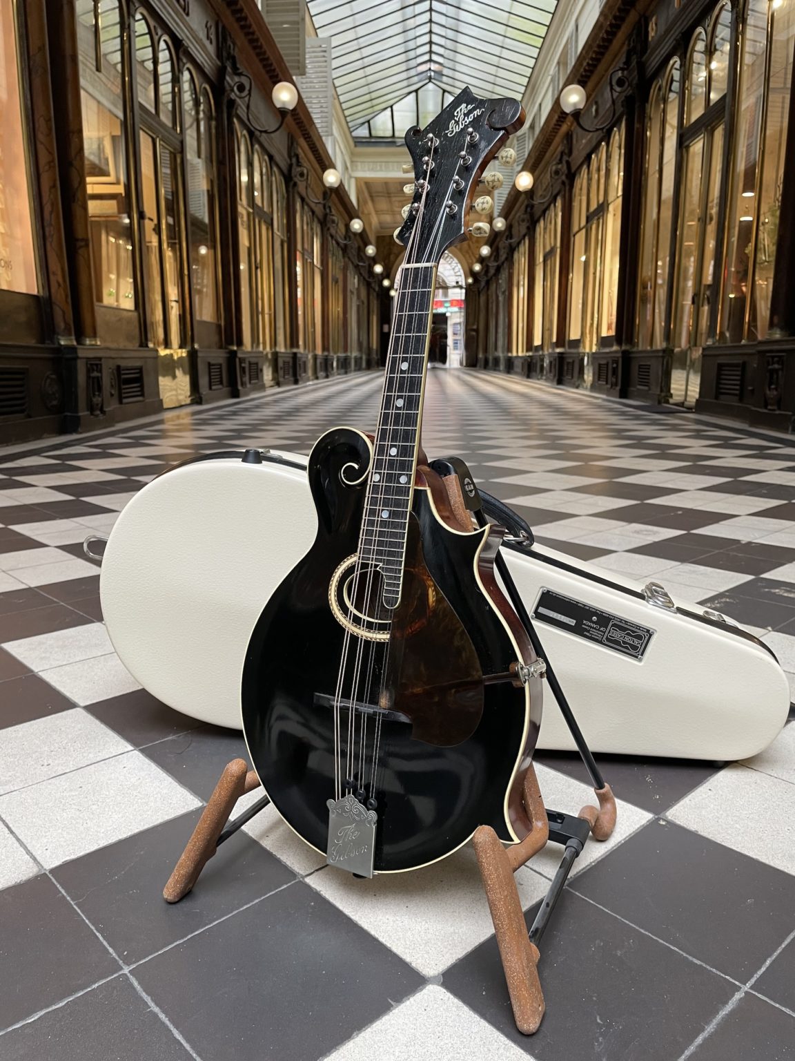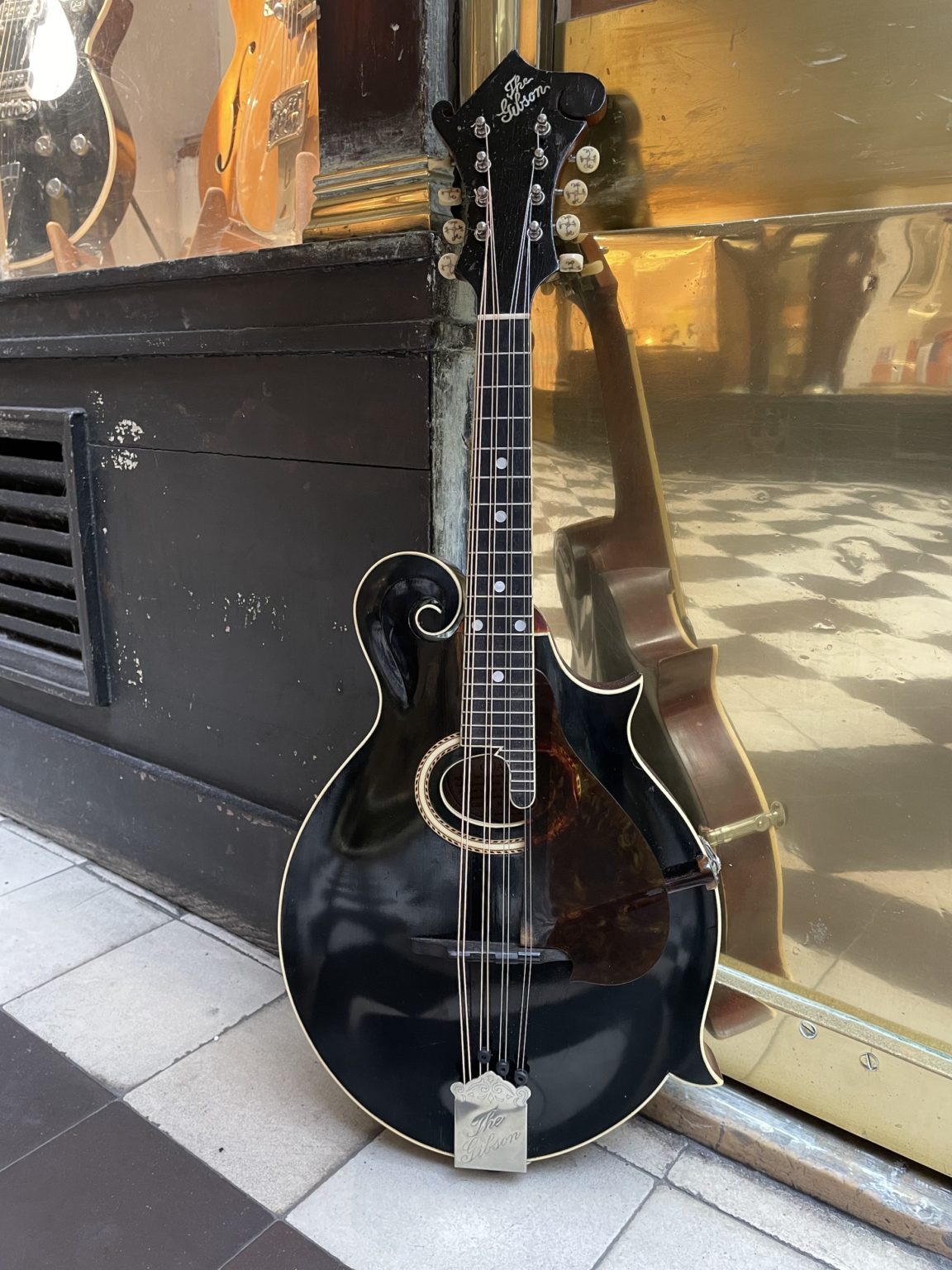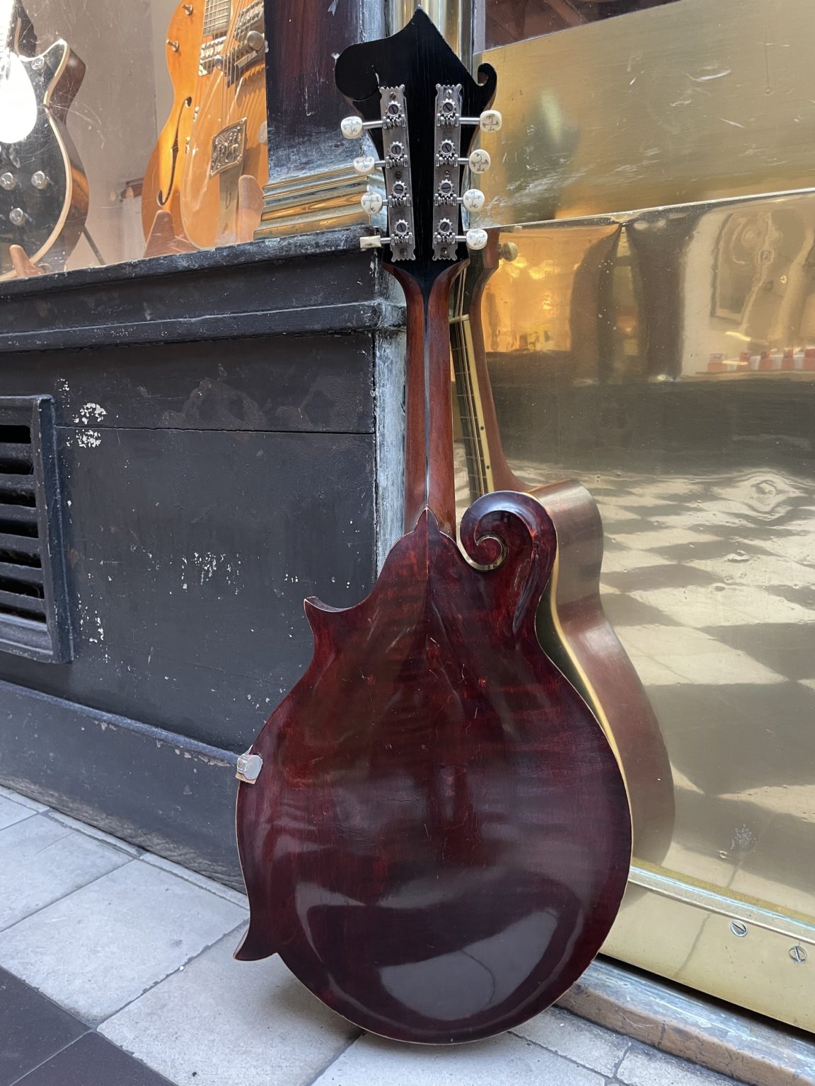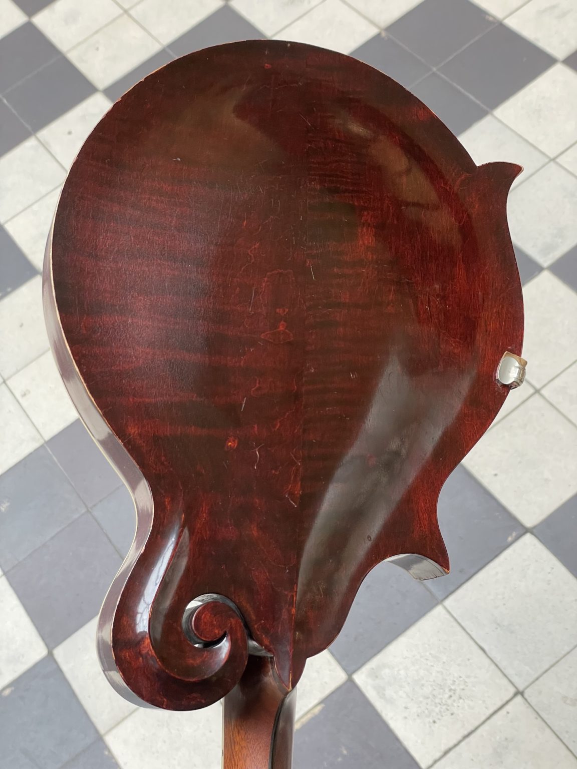 At the time of its manufacture almost 112 years ago, this Artist model was right near the top-of-the-line among Gibson’s offering, short of being an F-4 model – the two styles are very similar in construction, differing only in the degree of decoration and the use of birch on the back and sides of the F-2 instead of maple on those of the F-4. Incidentally, the F-2 mandolin was sold for $75.00 in 1912, which represented a significant sum for the time. The original hardware is present in its entirety and in very good condition, including the raised celluloid pickguard fixed by a metal clamp allowing the height to be adjusted, Handel tuners, named after the New York company who produced these finely crafted pieces with ivoroid buttons inlaid with pearl and silver thread (they are also found on period instruments from other manufacturers such as Martin or Lyon & Healy), the tailpiece cover engraved with the name of the The Gibson brand and an ebony bridge with individual compensation for each pair of strings. In 1912, many of these elements constituted recent innovations (evidenced by the fact that many bear patent numbers dating back to a few years at most), and the Gibsons of this period condensed, well before the advances of the 1920s, a number of determining components for the further evolution of American lutherie.