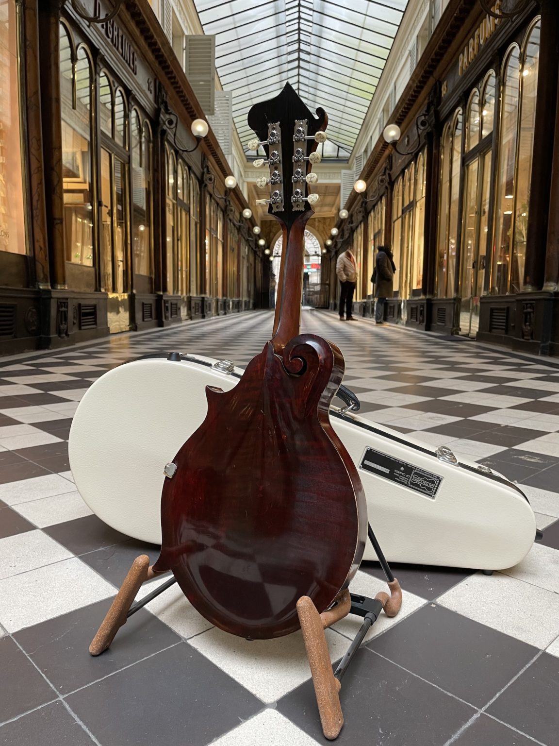 We find this mandolin superbly preserved today, with a spruce top in its beautiful original ebonized finish presenting a lovely patina linked to its use during the past century, as well as the three-pieces mahogany neck whose fading of the varnish attests to continued use. All of the carved parts on the head and body of the instrument are perfectly intact and show no signs of cracks or breakage. The instrument is sold after a complete professional setup in our workshop, including fret level and crowning, action and intonation adjustment.