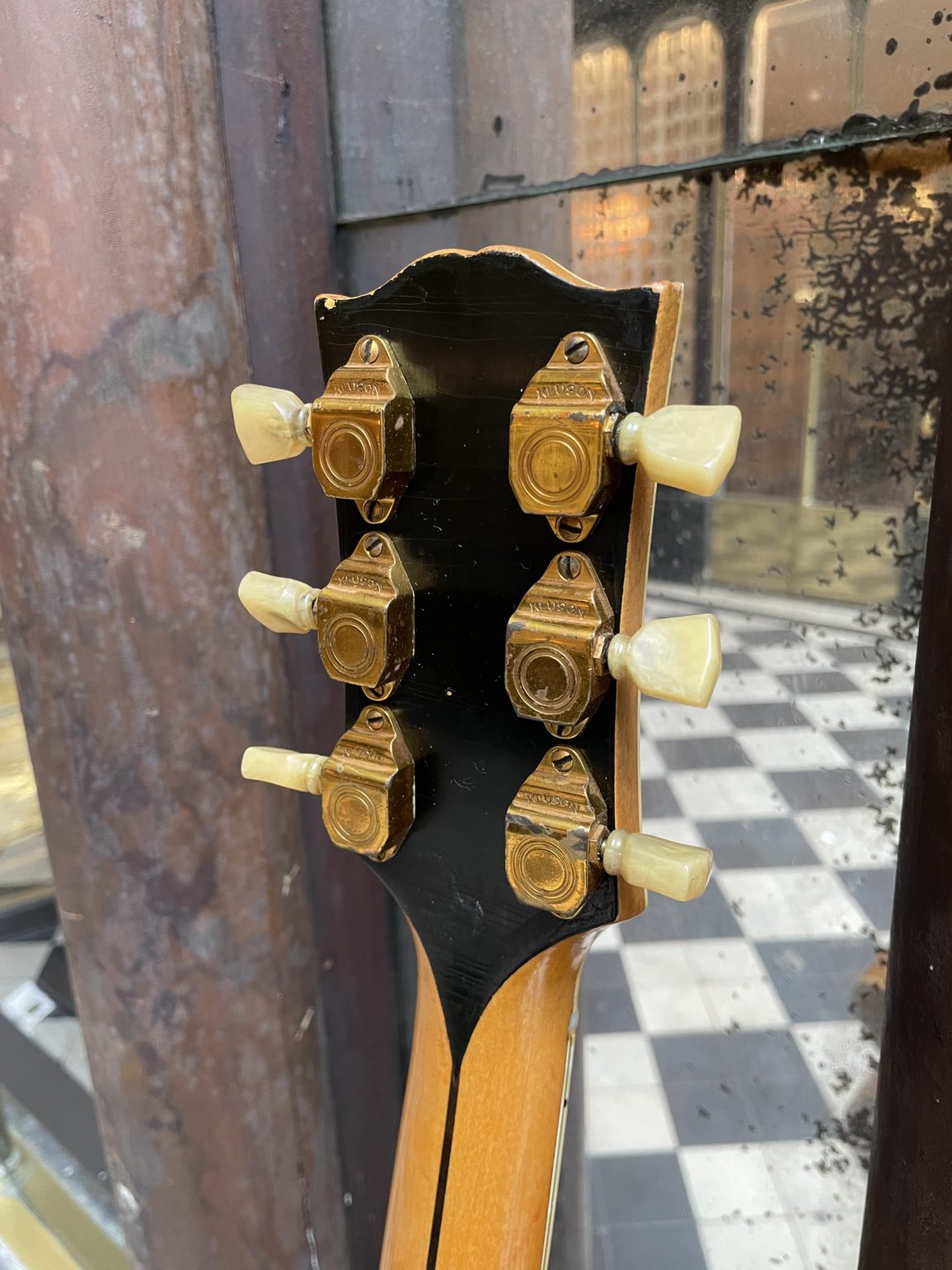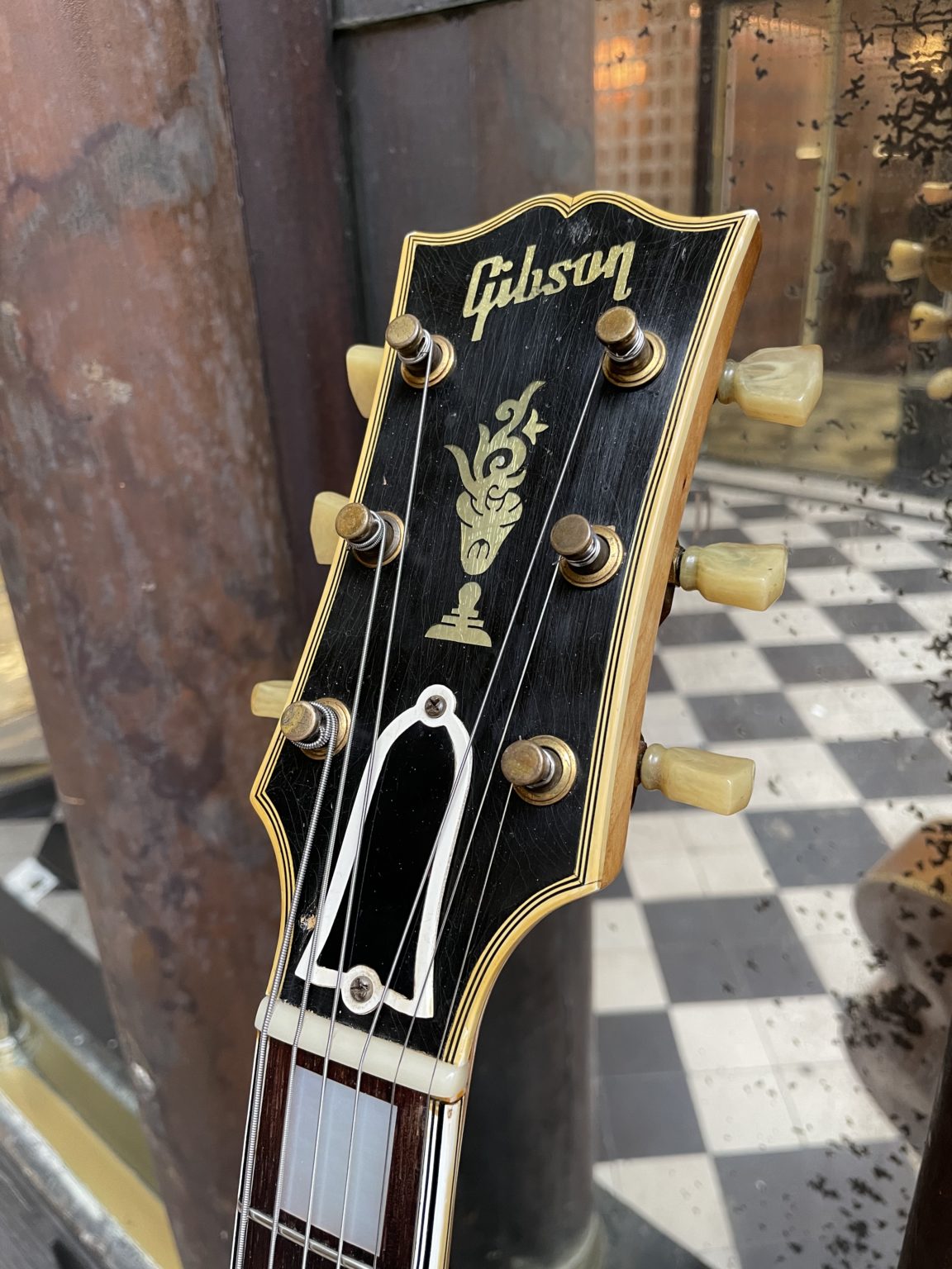 As for this instrument, there is no room for error, we are indeed in the presence of the most elegant and high-end instrument that Gibson could offer: a guitar built with choice woods – carved spruce top, curly maple back, sides and neck, fingerboard and bridge in Brazilian rosewood… as is often the case on these venerable guitars, the dappled patterns of the maple on the back are simply splendid, and under the reflection of the Natural varnish turned to amber we almost manage to visualize bubbles suspended in a glass of champagne, in perfect harmony with the refined reception parties that, one can easily imagine, this guitar could have hosted at the time. We also find the new “script” logo as well as the flowerpot pattern inlaid on the headstock, the tailpiece typically associated with the L-5 in the art deco style, the beautiful gold Kluson Sealfast tuners… the original pickguard having, as it is often the case, suffered from the natural degradation of the celluloid plastic which composes it, it was removed to be preserved in the case, and a copy of the original was installed in its place.