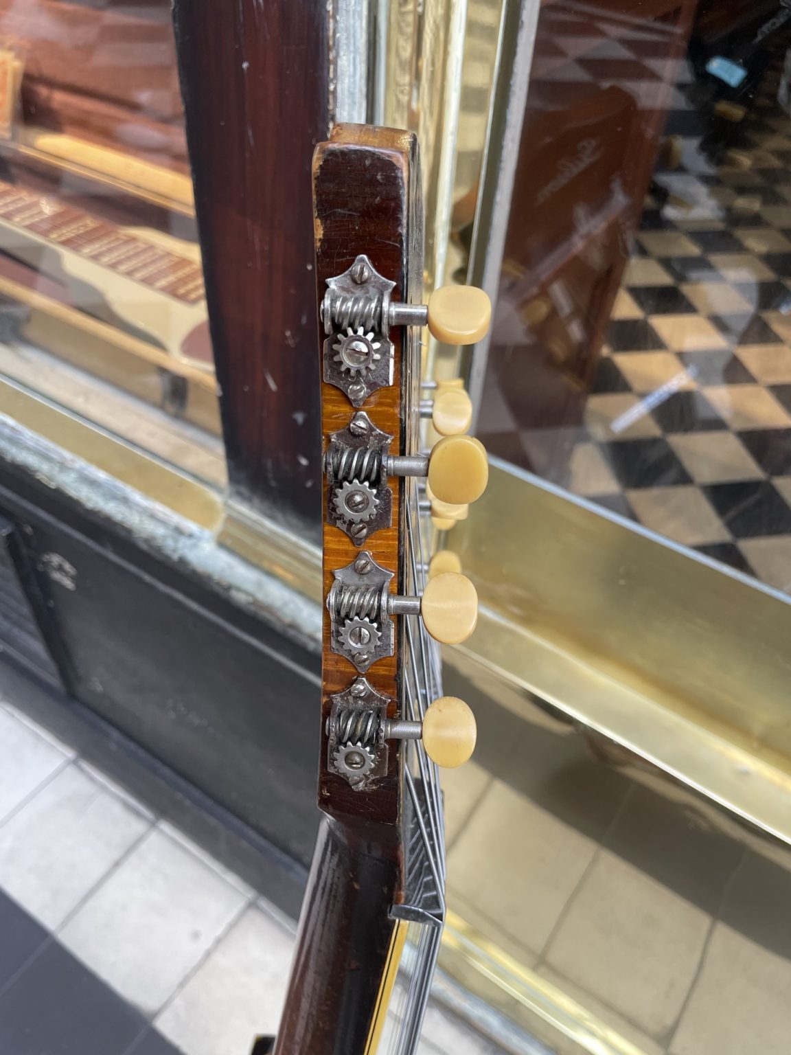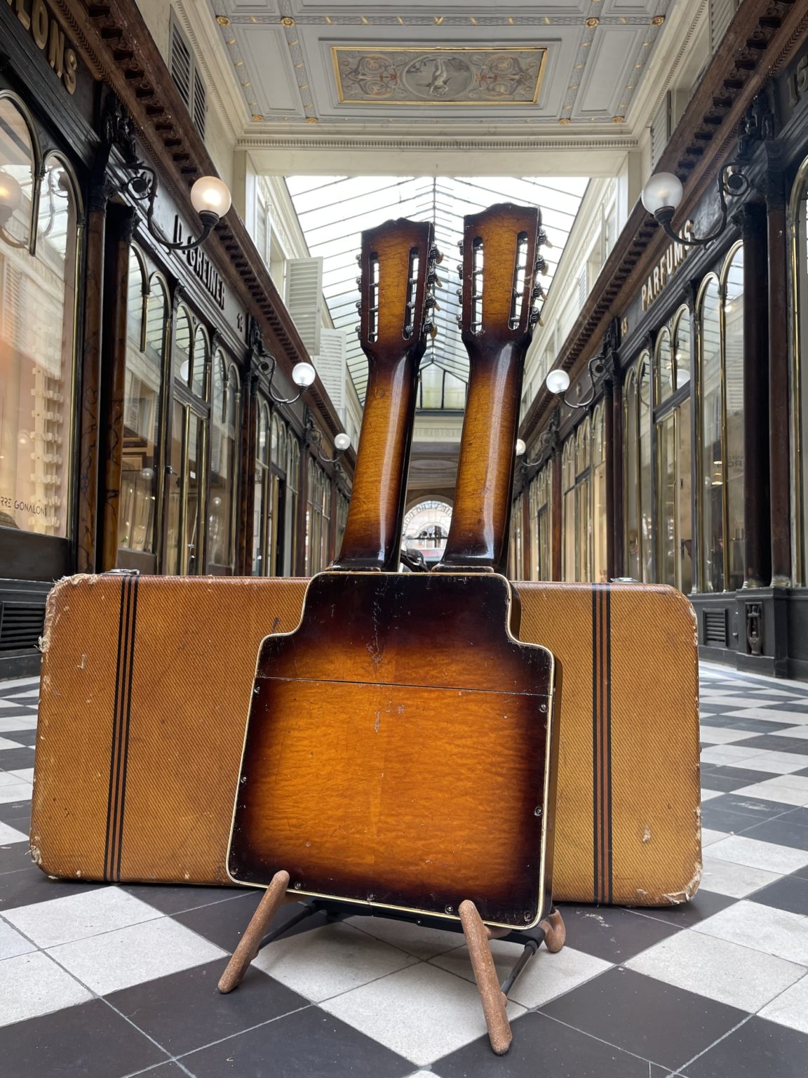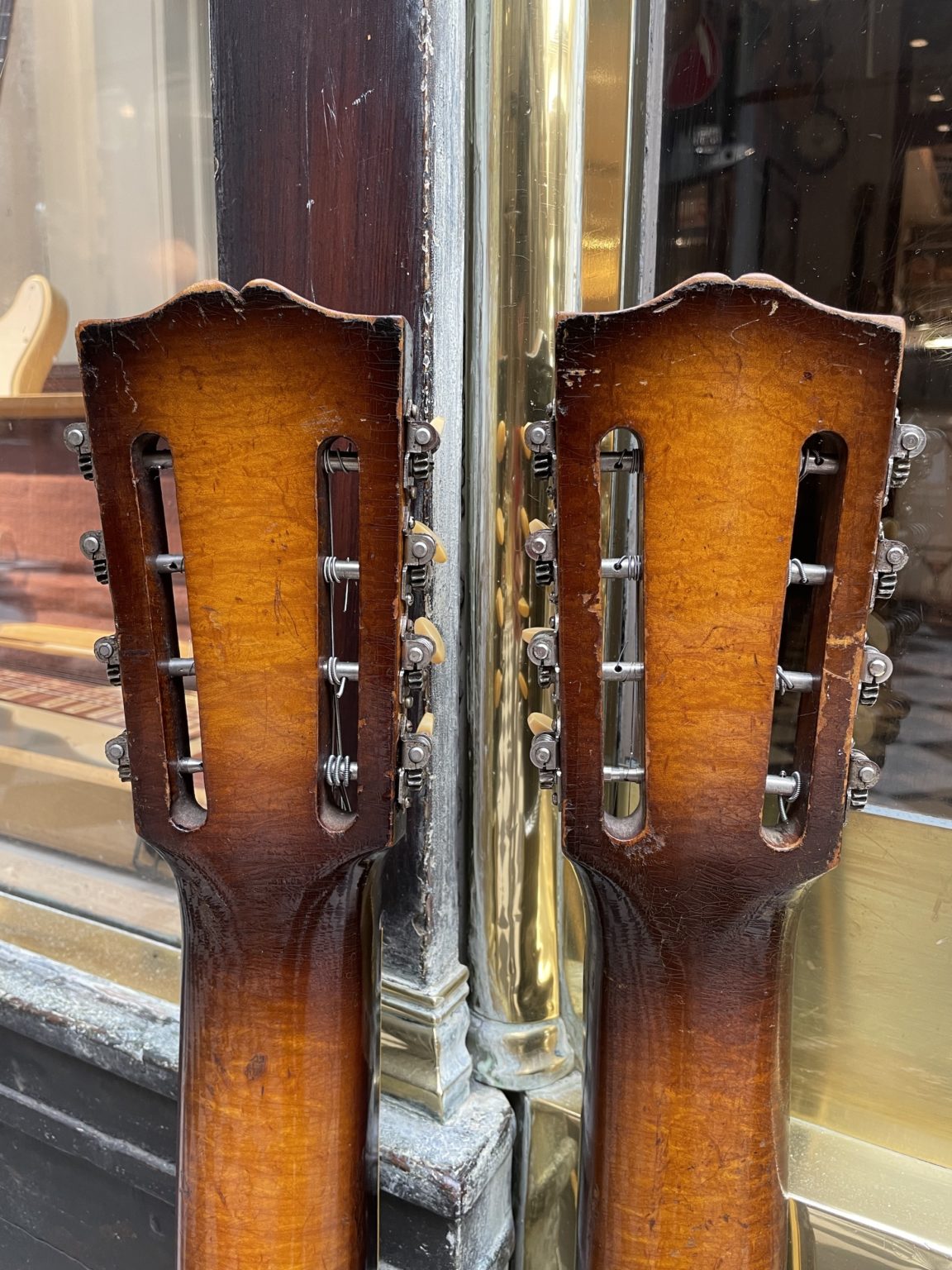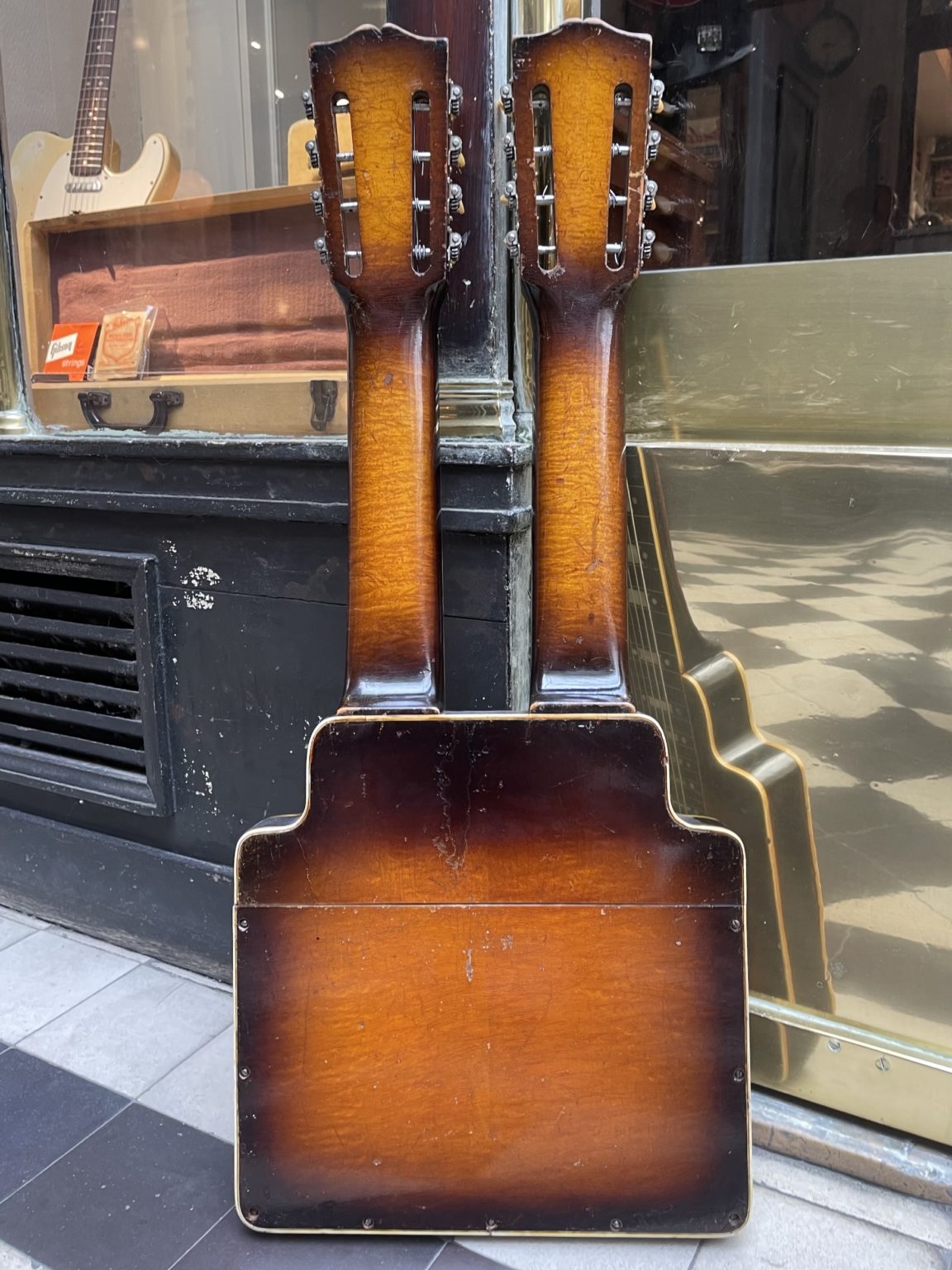 The instrument comes to us superbly preserved, complete with its two Charlie Christian bar-pickups (these are adjustable in height using two screws on the table and provided with individual poles under each string to enhance individual response), its electronics including a volume control and general tone controls, and its hardware including two chrome bridges, two Bakelite potentiometer knobs, and no less than 16 individual Grover G-18 tuners with pointed ends, typical of the second half of the 1930s. The construction of the body is maple, hollow for the body and solid for the part constituting the necks and headstocks. Double ebony fingerboard decorated with mother-of-pearl inlays. The set is finished in a beautiful black-to-amber Sunburst adorning the top, back, necks and headstocks. The pickup on the first neck has been rewound with the same DC resistance as the original, as the wires on the original coil had suffered from corrosion – the pickup now works perfectly and with an output level equal to that of the second neck. First neck strung for playing in E major, second neck strung for playing in G major – the instrument has been thoroughly checked, cleaned and prepared for playing in our workshop.
