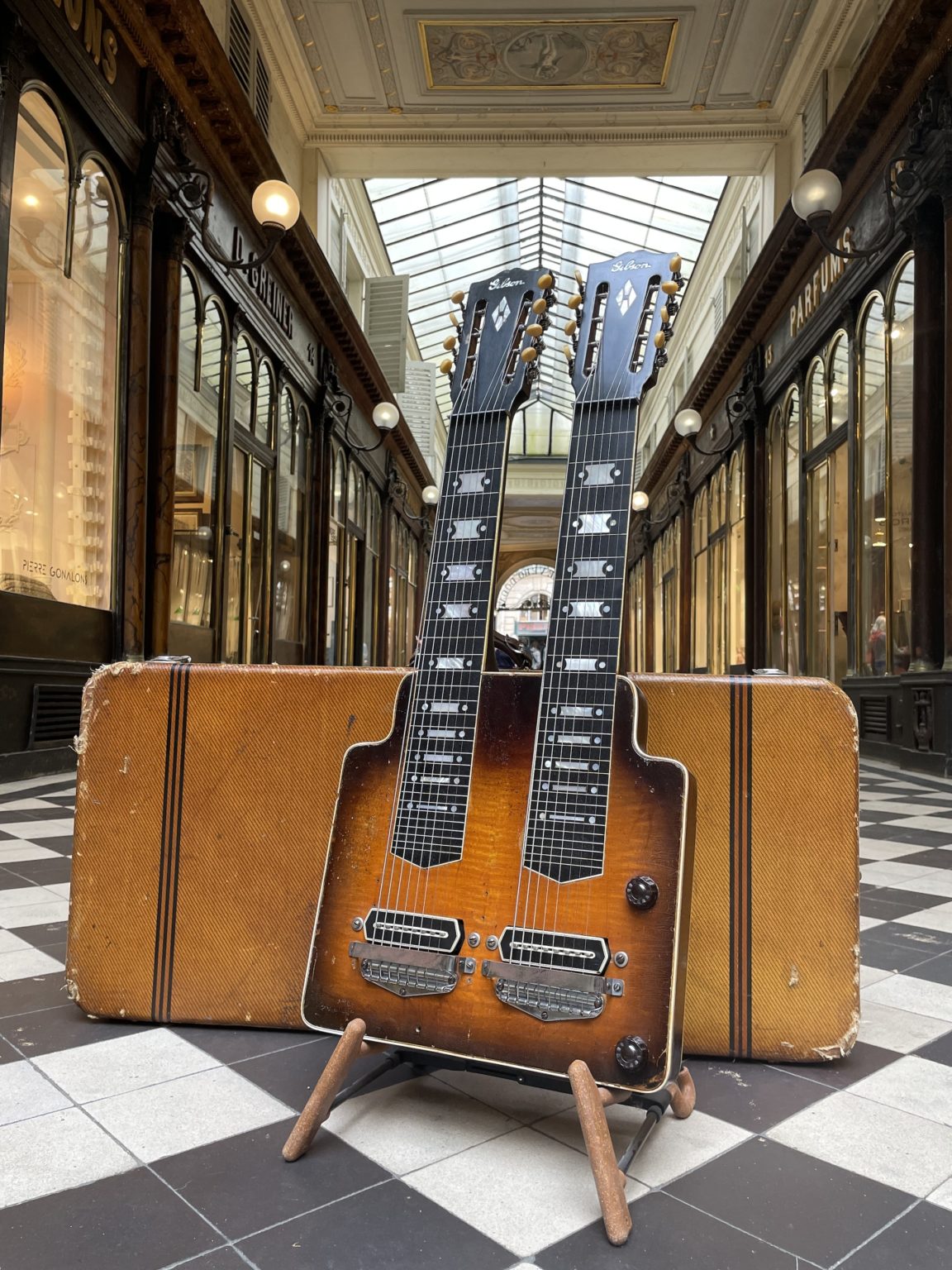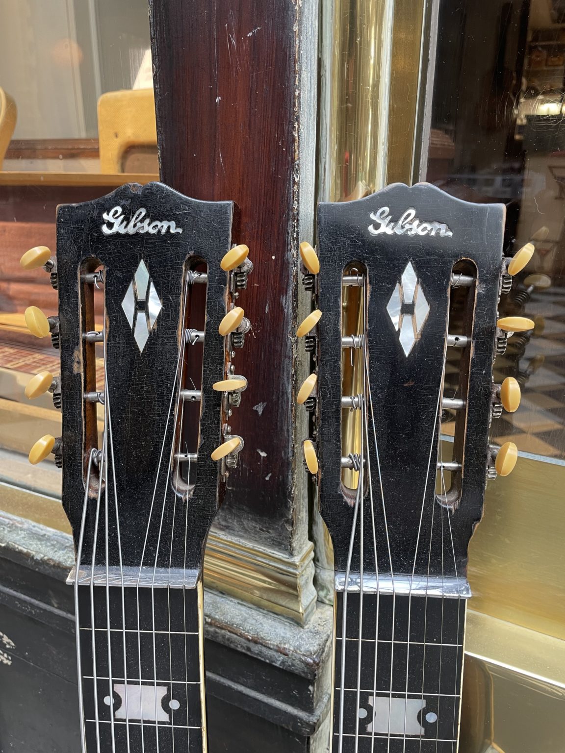 When we hear “double neck Gibson”, we are more likely to imagine an EDS-1275 model from the 50s or 60s rather than the guitar with two 8-string necks presented here… which is actually the first expression of this type of instrument, appearing around the same time as the first Gibson electrics produced around the mid-1930s. According to the history of these models traced by André Duchossoir and Lynn Wheelwright, the first orders were made as early as 1936 by musicians needing an instrument with increased flexibility compared to the standard Hawaiian models with 6 or 7 strings, already offered in the catalog.