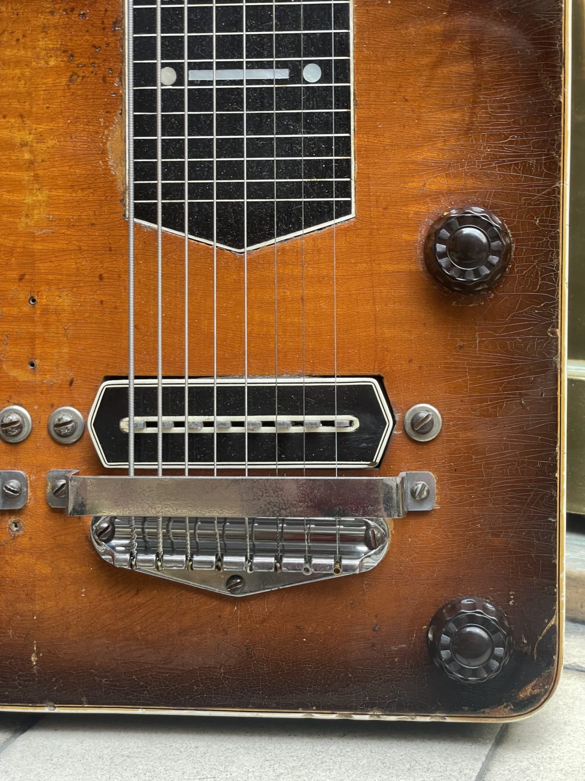 At the forefront of these developments is the musician Alvino Rey, a renowned multi-instrumentalist who played as a Spanish and Hawaiian guitarist in several orchestras since the beginning of the decade, and who benefitted from a kind ear from the Gibson engineers who willingly integrated his suggestions in improving their burgeoning line of Electric Hawaiians: Rey, perfectly versed in the operation of instrument electronics, was especially well placed to understand the needs of instrumentalists and how to implement them on guitars – he notably contributed greatly to developing the Grande Console, marketed by Gibson from 1938, as well as the Electraharp, the first model using foot pedals to allow tuning to be modulated in real time.