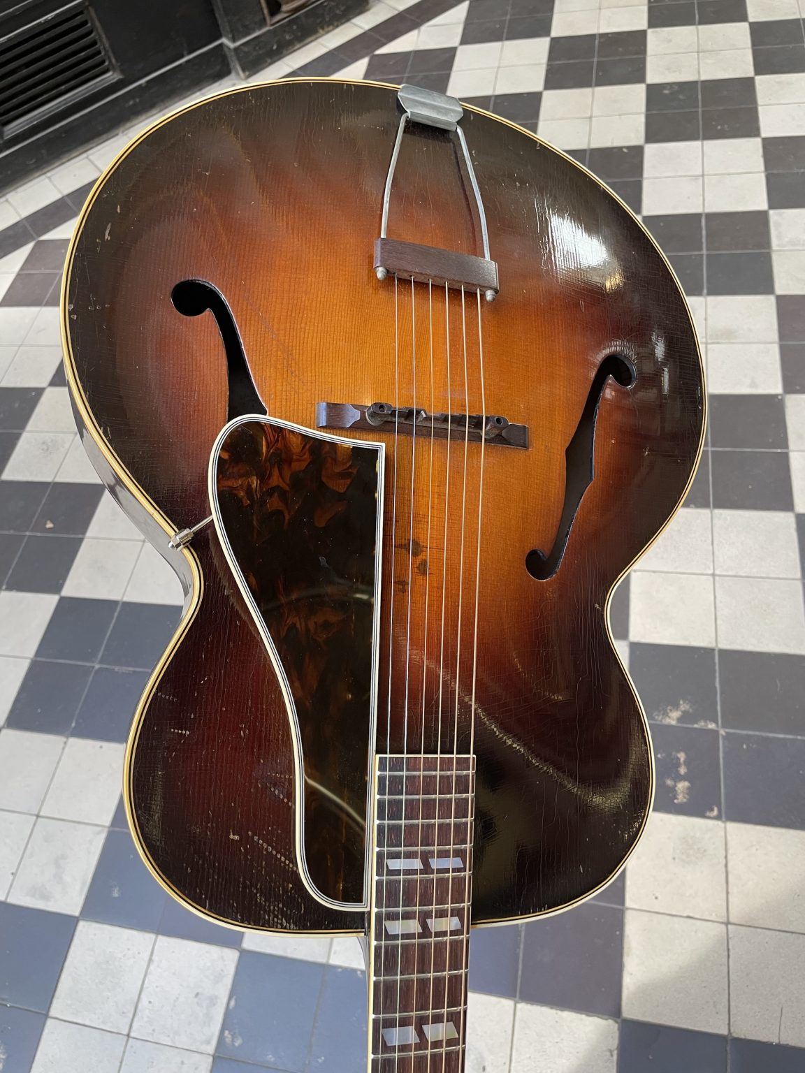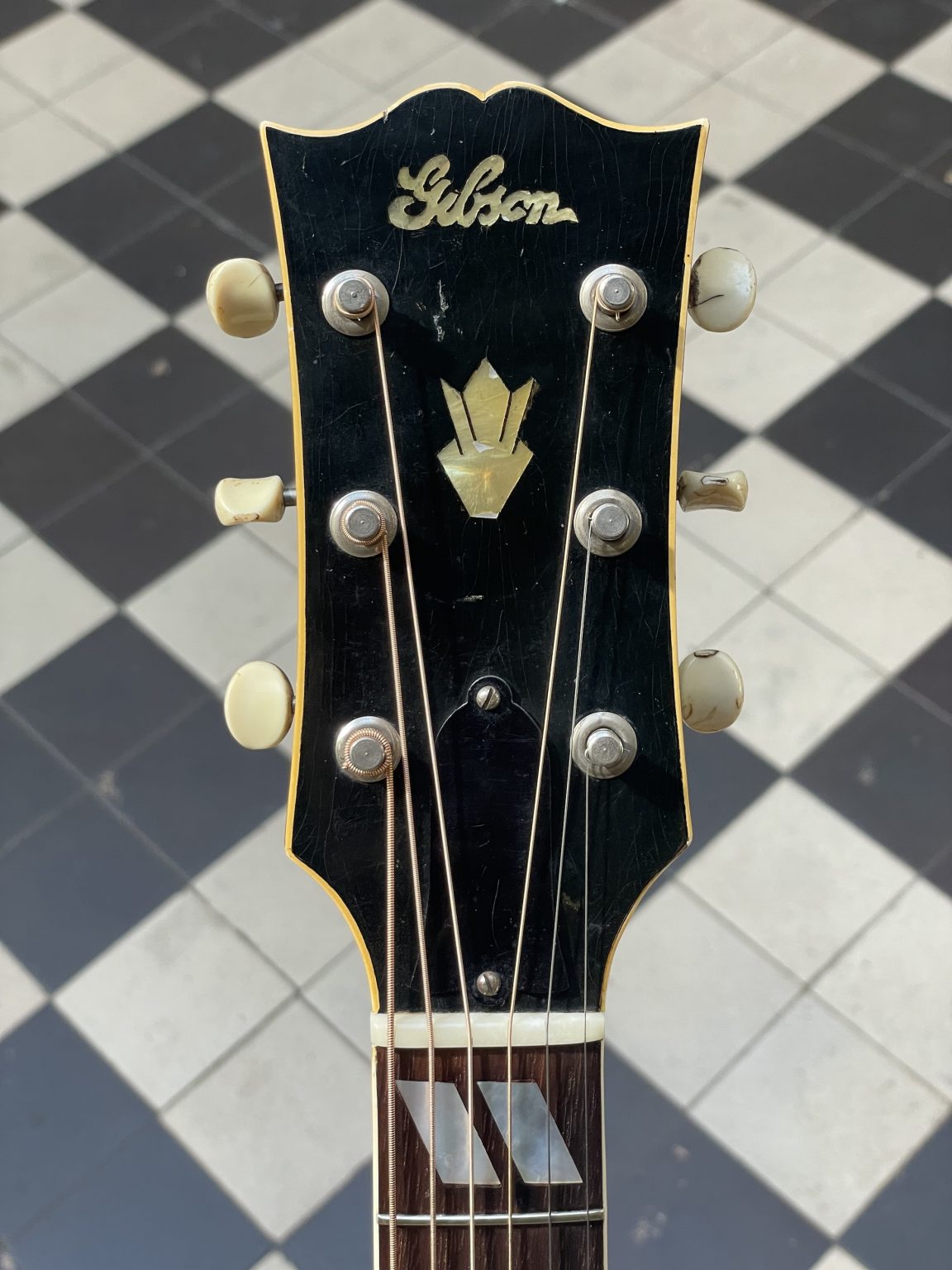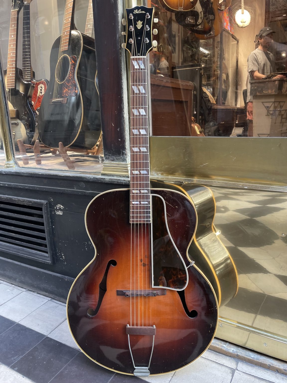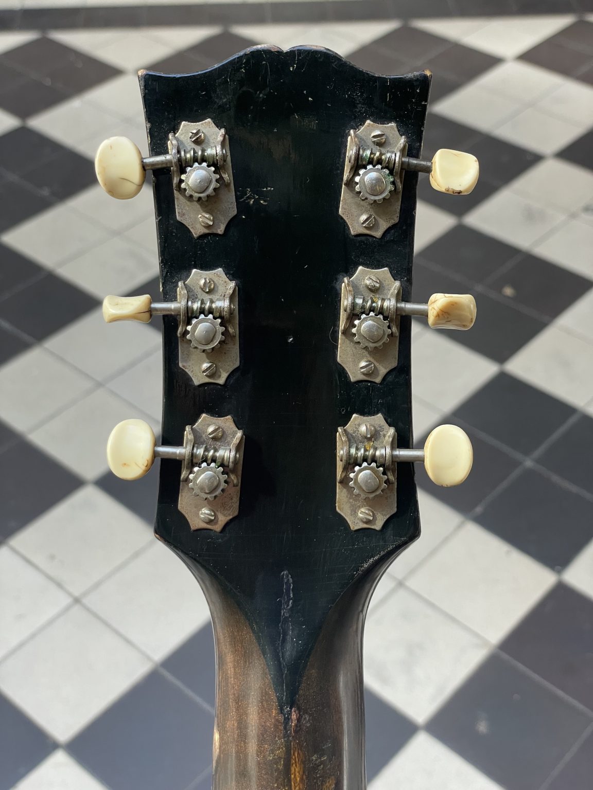 One characteristic specific to this era is the tailpiece crossbar, which is made of wood rather than metal as is usually the case. Indeed, restrictions imposed by the American government on the use of steel forced instrument makers to find substitute materials and methods. For the same reason, some Gibson guitars built during the war lacked a truss rod—a metal rod allowing the neck to be adjusted—and were fitted with a very thick neck to withstand the tension of the strings. We also note the presence of the old Gibson logo on the headstock of the instrument: in the so-called script style, the cursive lettering is cut from mother-of-pearl and inlaid in the headstock veneer. This element was replaced in 1948 by the new silkscreened version of the logo, dubbed block script – the one that we still find, with a few variations, today! The Sunburst on the soundboard has retained a beautiful shine and a still pronounced gradient going from brown to orange-yellow. The back, somewhat marked by use, as well as the sides are finished in a translucent dark brown varnish allowing the patterns of the maple to appear underneath. As is often the case, the original pickguard having disintegrated, we made a copy of the original. Aside from this, the guitar remains in excellent original condition, including its tailpiece and Kluson tuners, and has been fully prepared for playability in our workshop—work that included a complete refret with correct-spec wire, new frets levelled, crowned and polished, the crafting of a new bone nut, and the adjustment of all setup elements to achieve low action and accurate intonation.