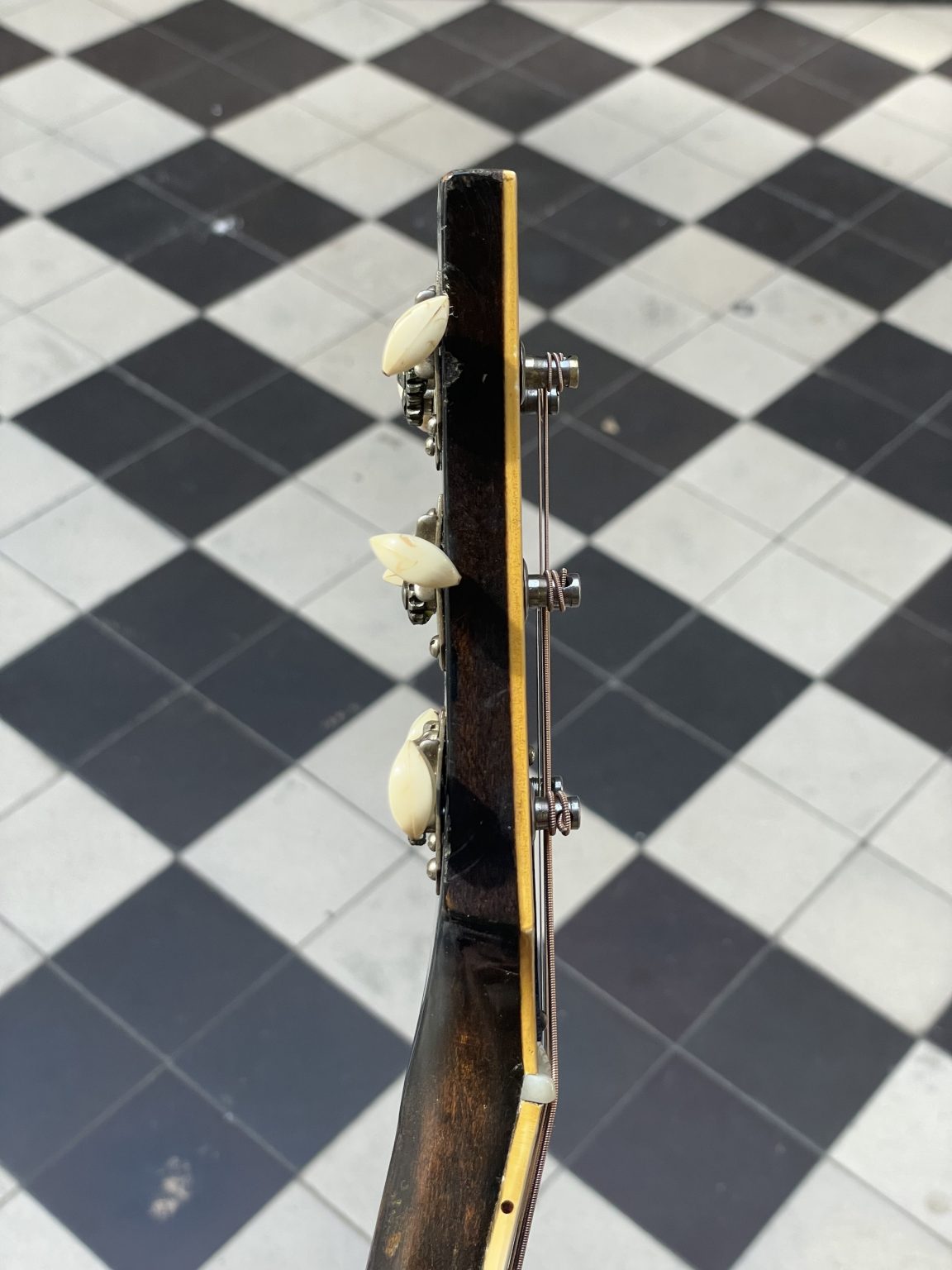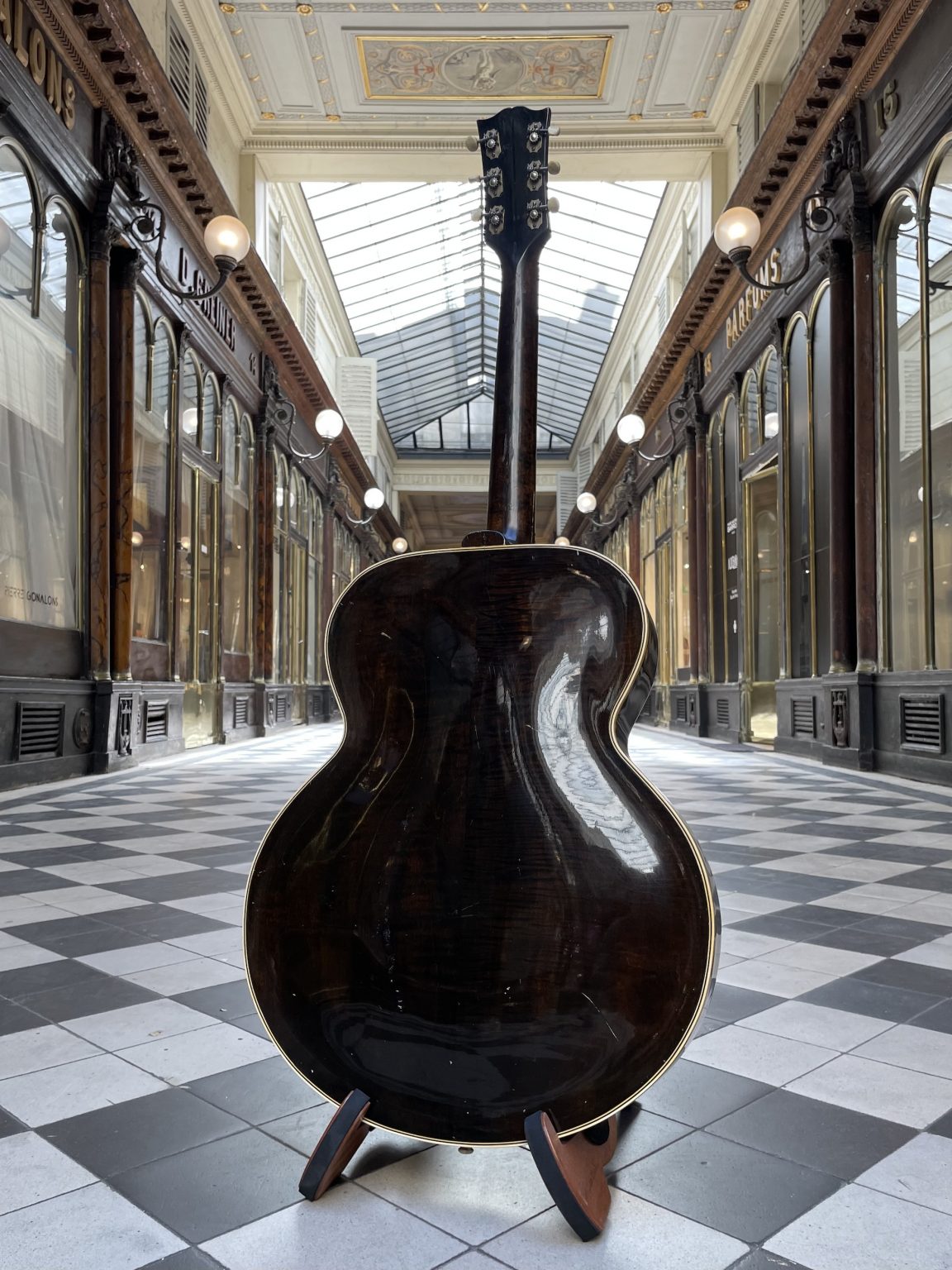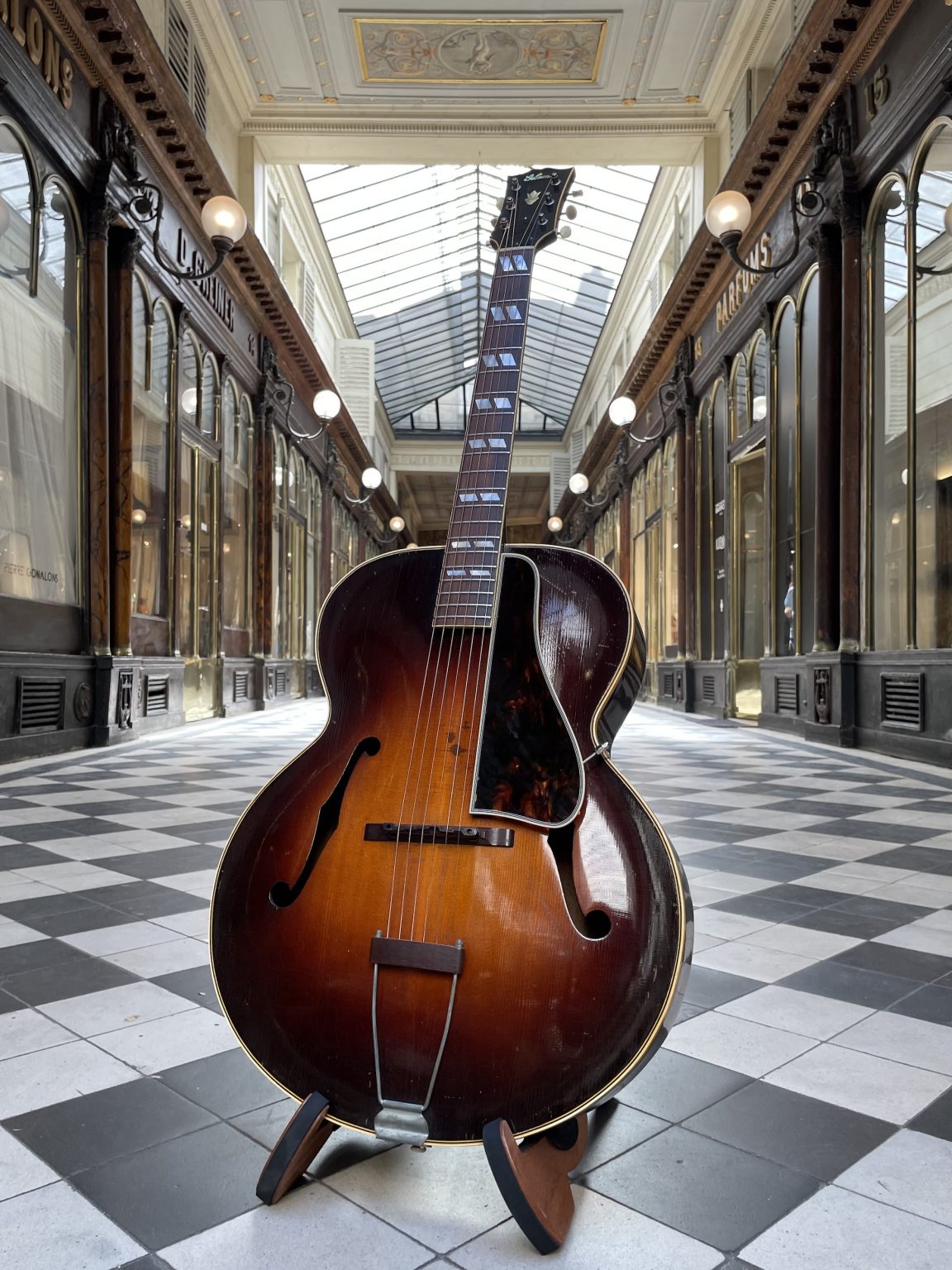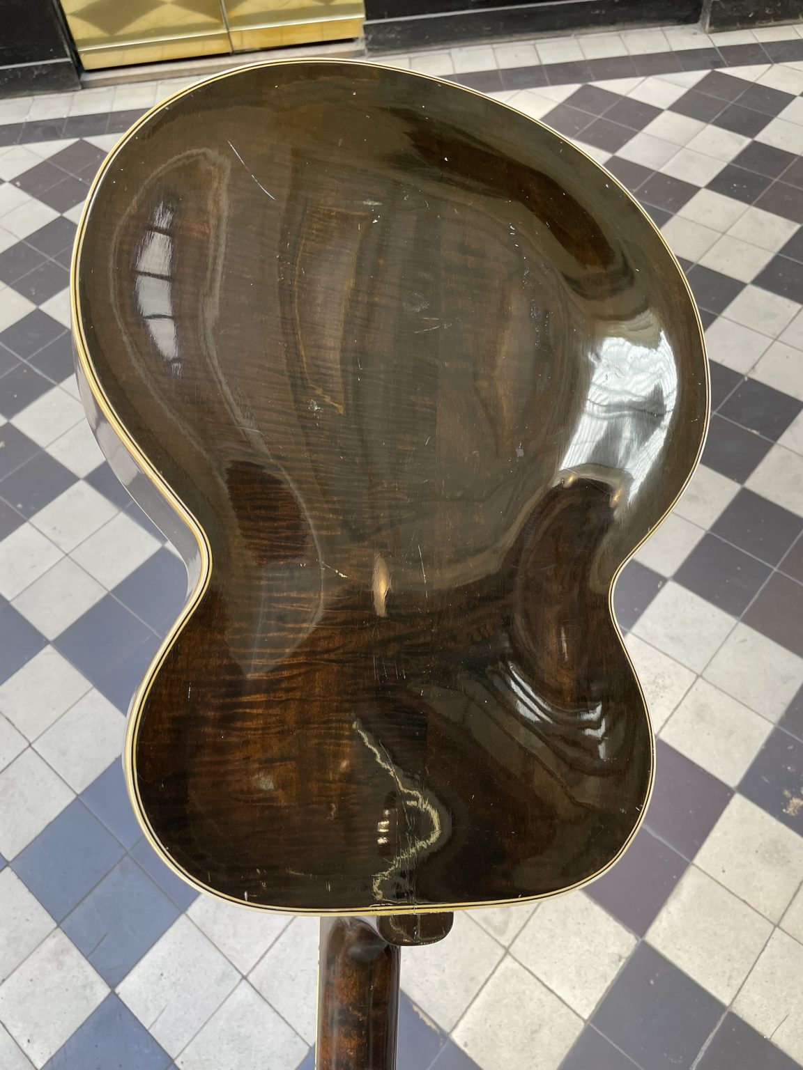 One characteristic specific to this era is the tailpiece crossbar, which is made of wood rather than metal as is usually the case. Indeed, restrictions imposed by the American government on the use of steel forced instrument makers to find substitute materials and methods. For the same reason, some Gibson guitars built during the war lacked a truss rod—a metal rod allowing the neck to be adjusted—and were fitted with a very thick neck to withstand the tension of the strings. We also note the presence of the old Gibson logo on the headstock of the instrument: in the so-called script style, the cursive lettering is cut from mother-of-pearl and inlaid in the headstock veneer. This element was replaced in 1948 by the new silkscreened version of the logo, dubbed block script – the one that we still find, with a few variations, today! The Sunburst on the soundboard has retained a beautiful shine and a still pronounced gradient going from brown to orange-yellow. The back, somewhat marked by use, as well as the sides are finished in a translucent dark brown varnish allowing the patterns of the maple to appear underneath. As is often the case, the original pickguard having disintegrated, we made a copy of the original. Aside from this, the guitar remains in excellent original condition, including its tailpiece and Kluson tuners, and has been fully prepared for playability in our workshop—work that included a complete refret with correct-spec wire, new frets levelled, crowned and polished, the crafting of a new bone nut, and the adjustment of all setup elements to achieve low action and accurate intonation.