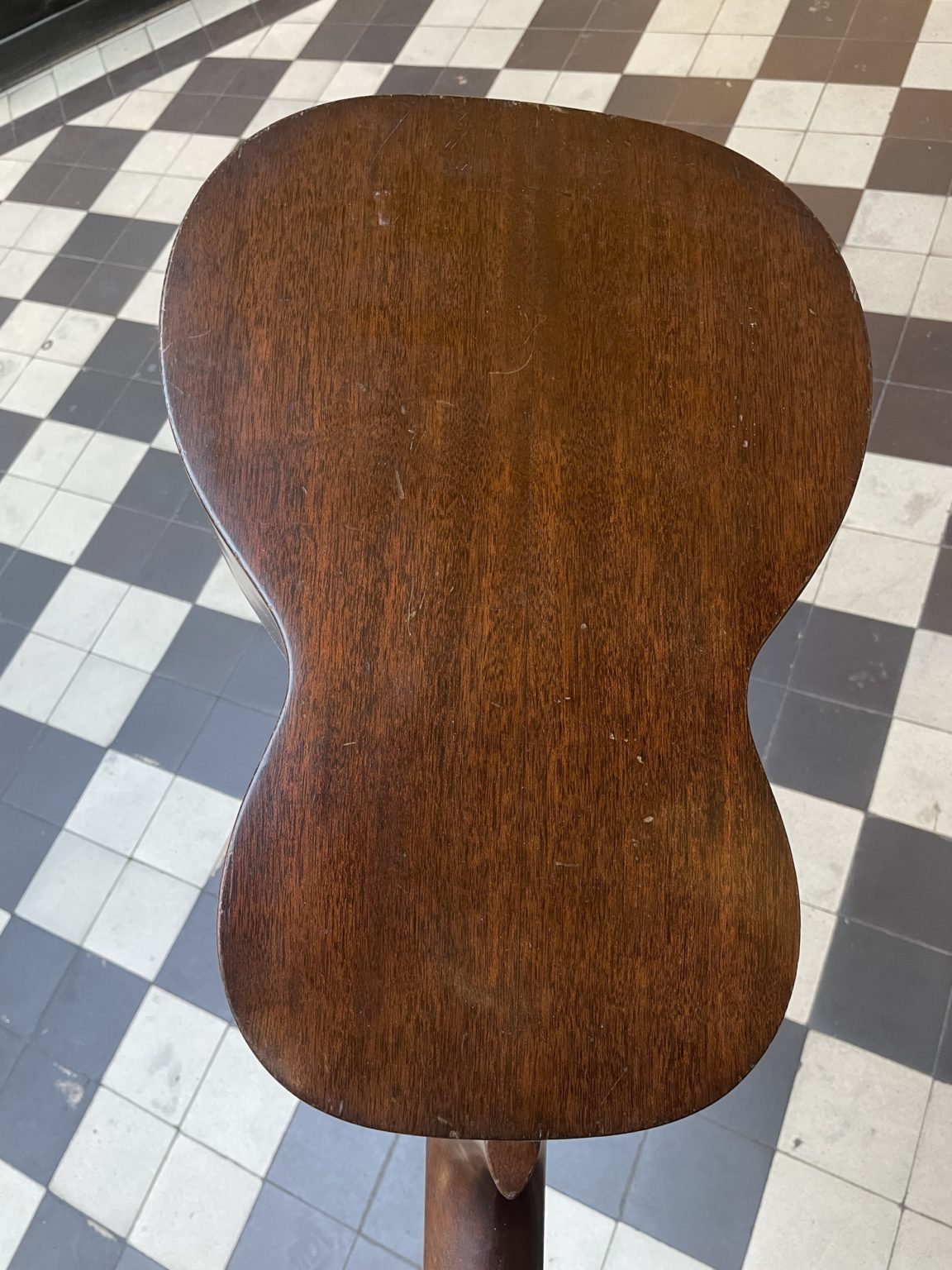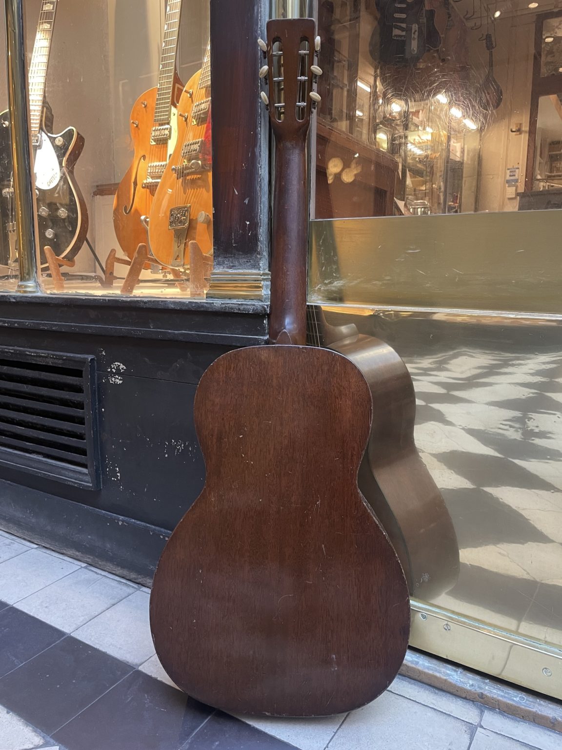 The guitar reaches us today in very good condition, presenting a beautiful patina testifying to decades of playing. We note on the soundboard the ancient traces of a golpeador, which allows us to imagine the use it may have had in the past (we are a long way from American folk song!). After going through our workshop for refretting and the making of a new set of bone nuts, it is perfect for playing with low action, a good string angle on the saddle and ideally adjusted intonation. A true gem!