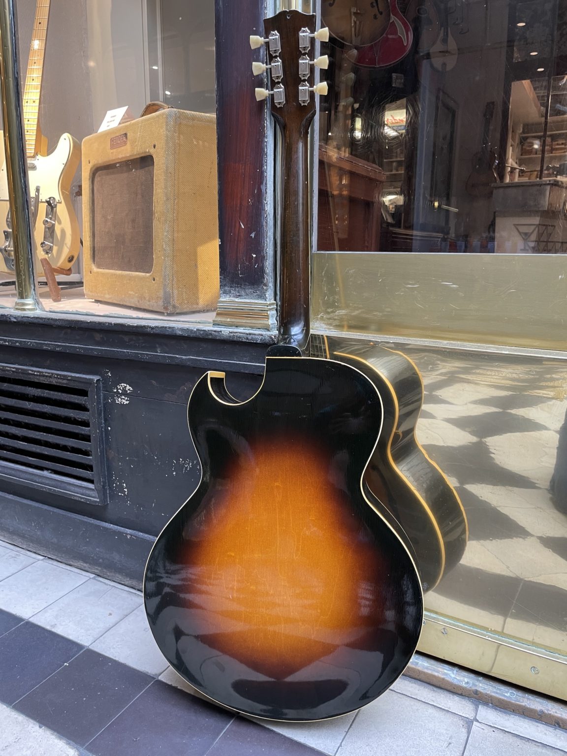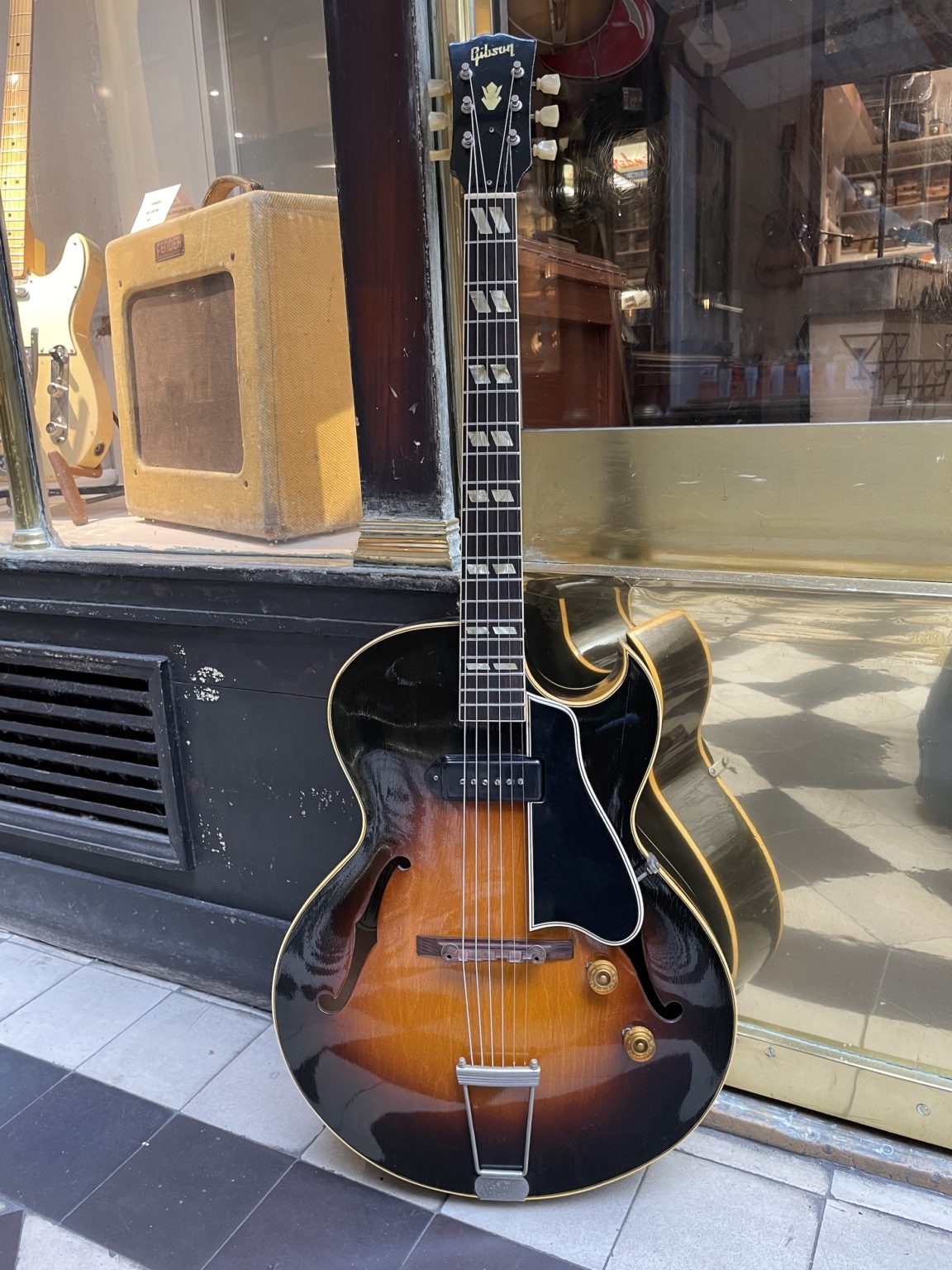 Here is a fine example typical of the early 1950s, the People’s electric hollowbody guitar at its finest! The model was introduced in 1949 and quickly proved a success, finding immediate acceptance due to its excellent combination of tone and playability at a moderate price. The serial number on the white oval label indicates that it was shipped in the late summer of 1953, one of 829 sold that year. It was also in this same year that Gibson reached the sales peak for the model, the concomitant introduction of the ES-175D with two pickups having subsequently quickly slowed down sales of the single pickup model – although many jazz musicians then and today still consider the single-pickup 175 to be an all-time gold standard for this genre of instrument.