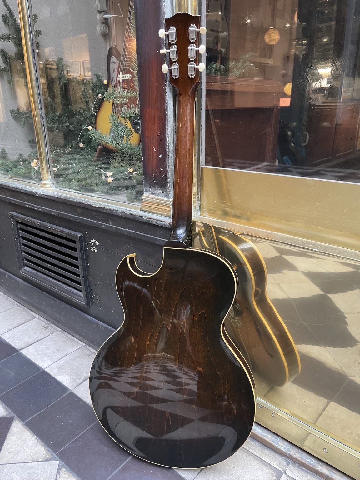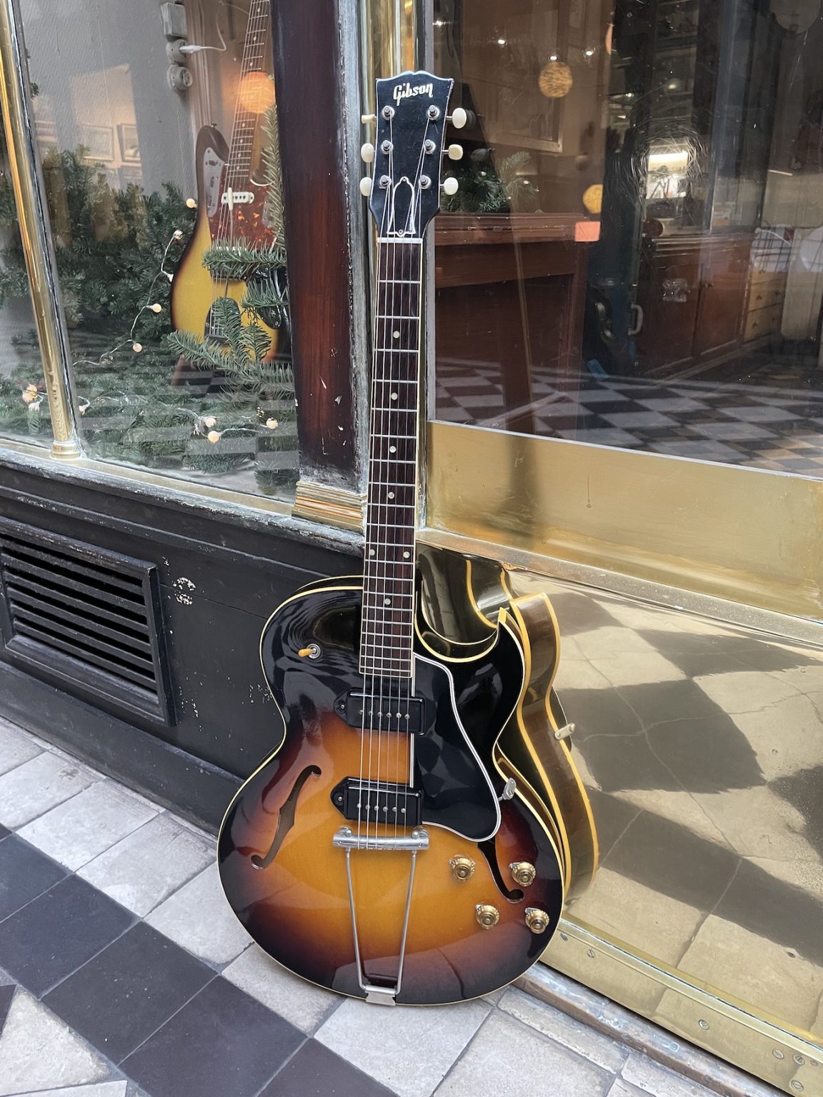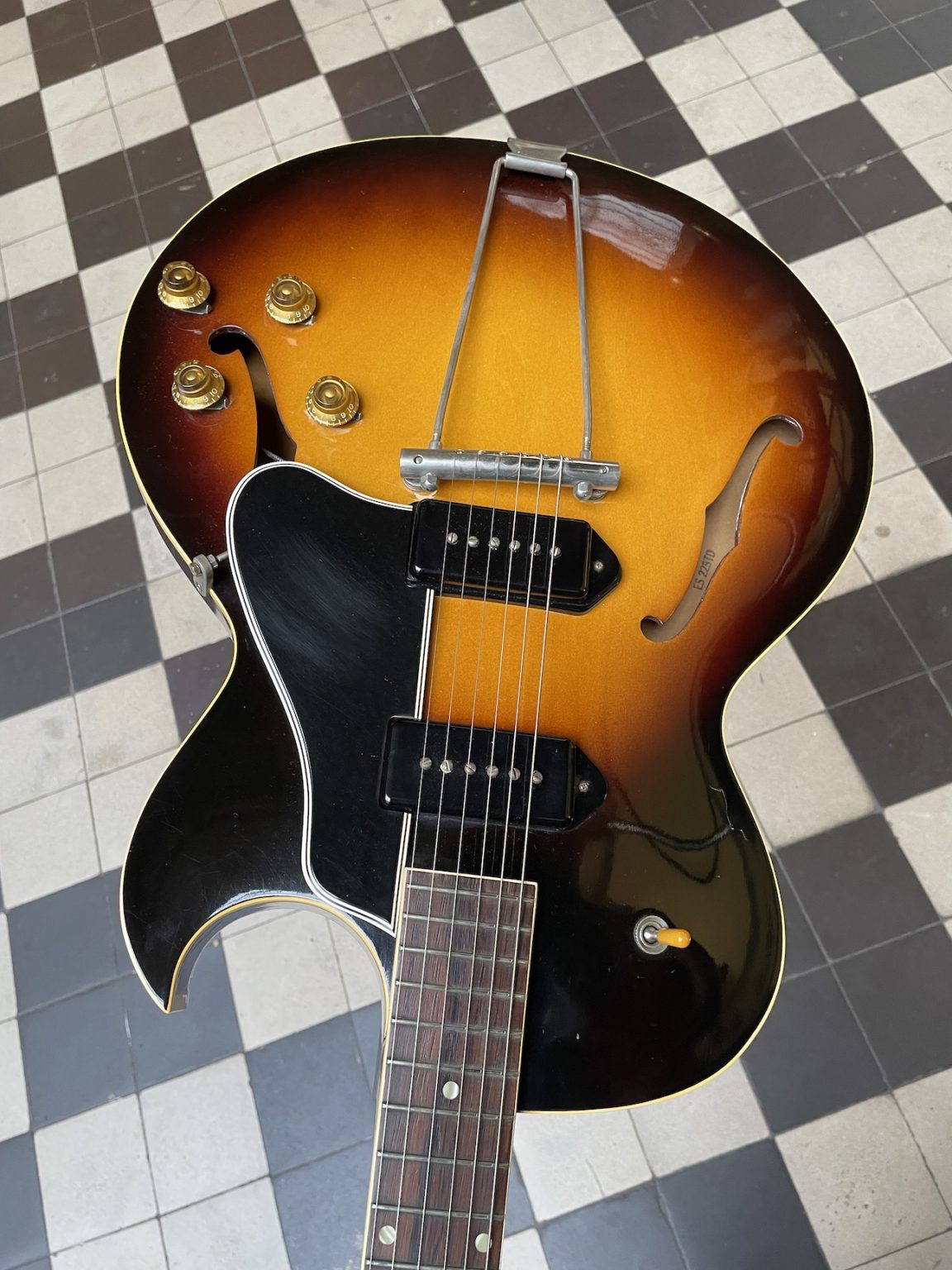 Produced from 1956 to 1959, this model is the 2-pickup counterpart of the 225T which, according to the Gibson catalogue at the time, was intended as a professional-grade instrument in the popular pricing field, combining the tonal characteristics of a solidbody instrument with the lightness and comfort of of a “conventional” guitar (sic, meaning archtop guitar). The 225TD stands out with its Florentine-style single cutaway and the combine bridge/tailpiece which was previously found on the very first Les Pauls of the early 50s. It comes equipped with two P-90 single coil pickups which have incredible definition and output level, capable of driving even the tamest of amplifiers. All in all, a true rock’n’roll guitar, maybe even a quintessential one?