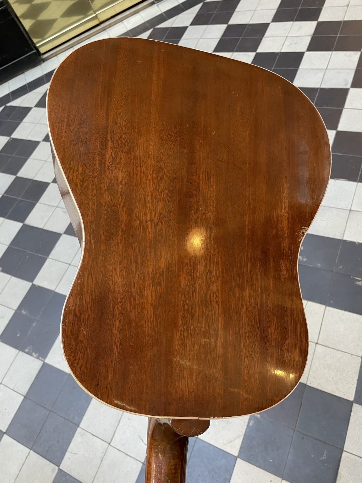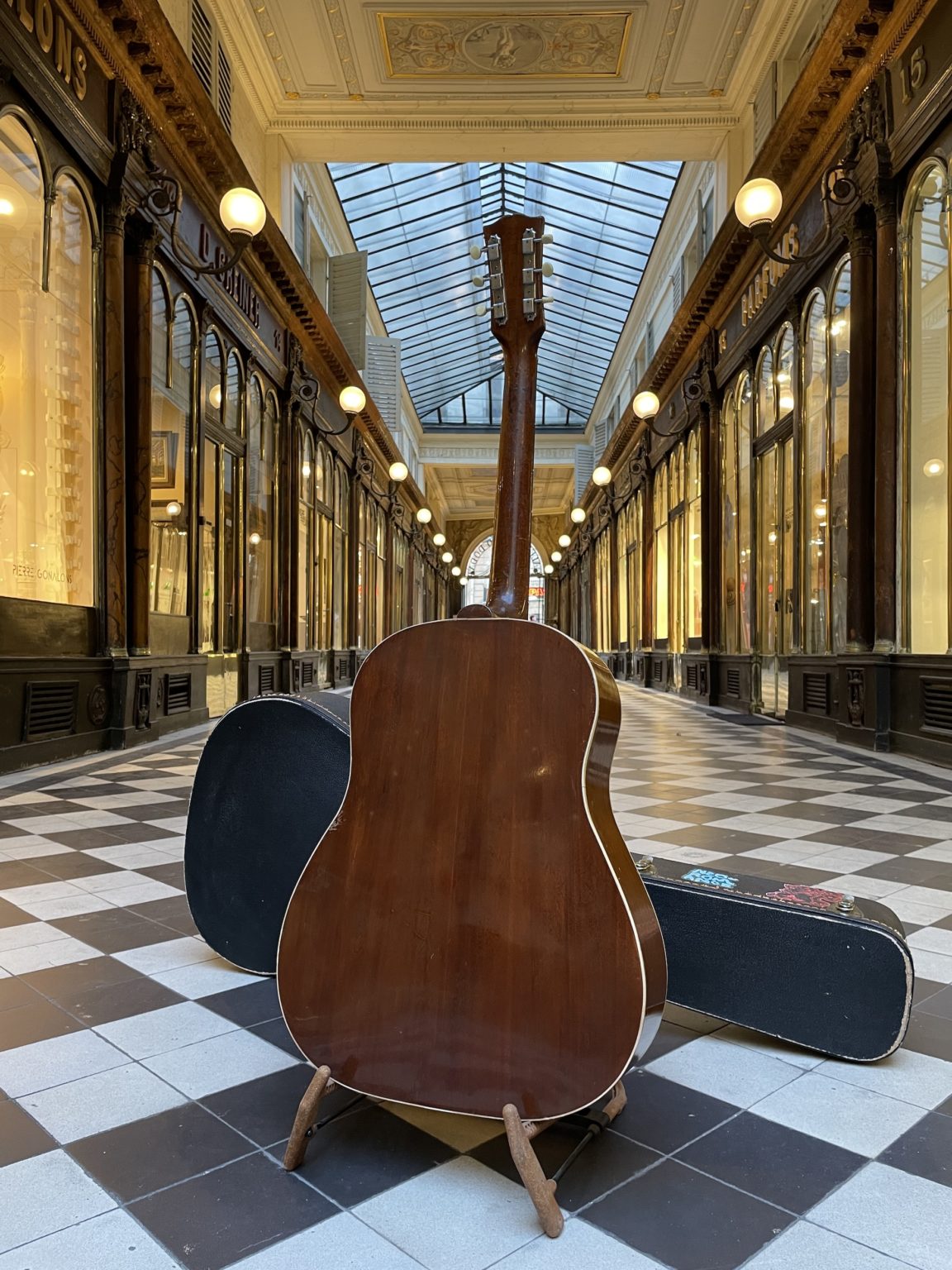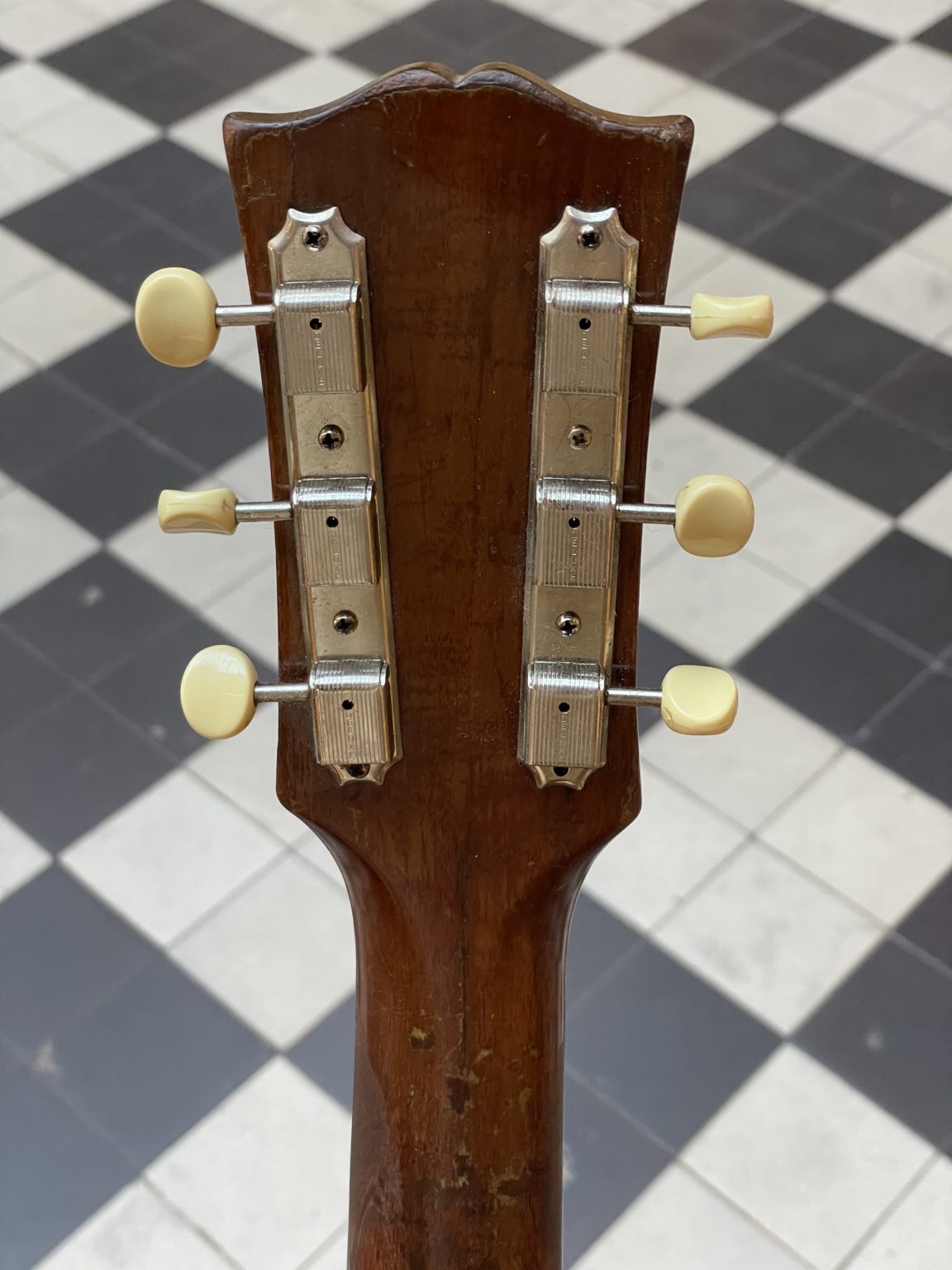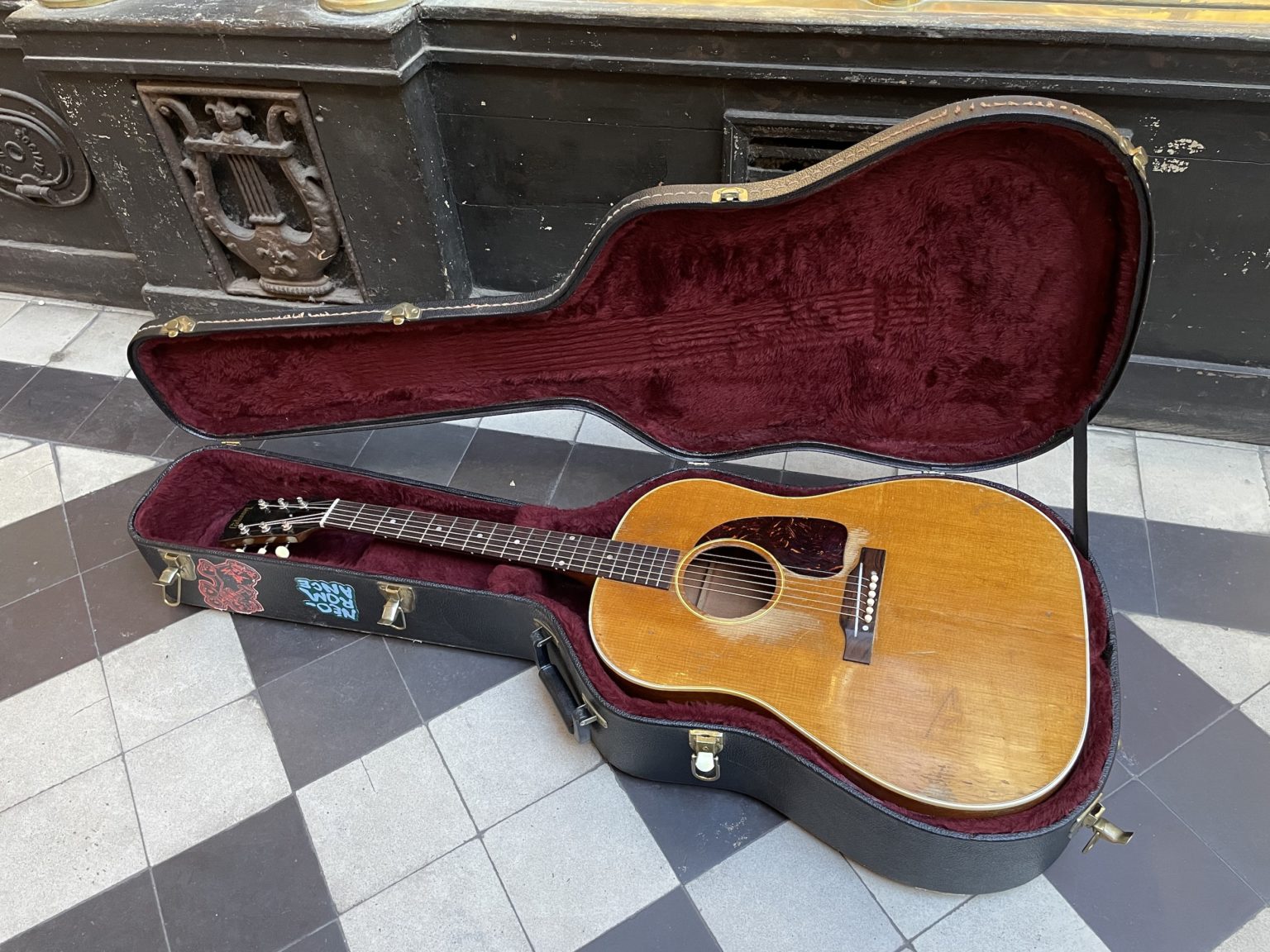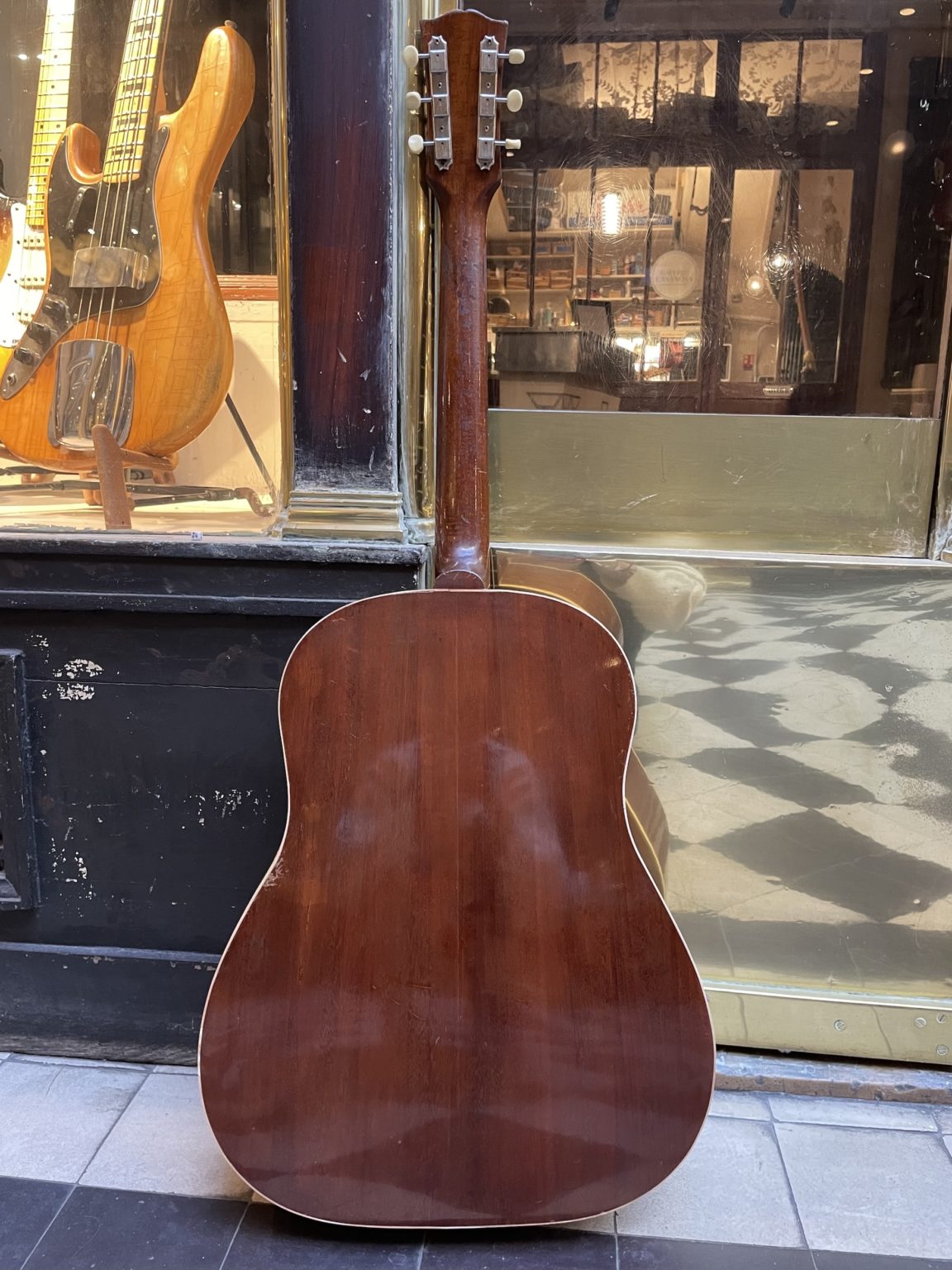 The model presented here is essentially identical to the J-50s of the late 1940s, the only notable difference being the style of the bridge called a reverse belly bridge, which replaced the traditional rectangular bridge to offer a little more strength to the soundboard and slow its bellying under string tension. With a powerful and confident voice with a particularly flattering low end, the J-50 (like its sister model) has always been favored by bluegrass musicians, like Doc Watson, and blues musicians – even a young Bob Dylan, one of whose first known instruments was precisely a J-50… This guitar has clearly been played a lot, bearing the marks of countless hours of picking, and aside a few stable restorations it comes to us in very beautiful condition, complete with all its original elements including its teardrop pickguard, its rosewood bridge, its Kluson tuners… We only note modifying of varnish on the back of the instrument. This instrument is a regular in our workshop, where we have refretted it, completely adjusted it and made a new set of bone nuts. Stringed up and tuned, ready to play!