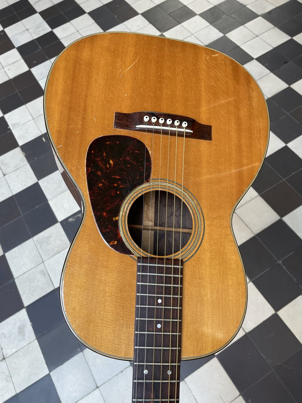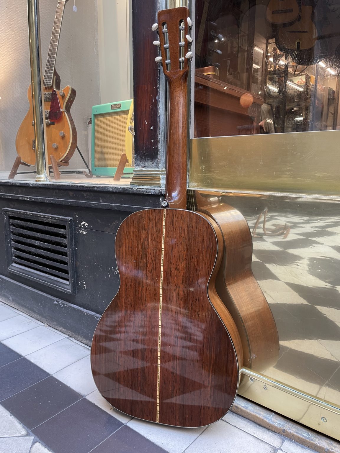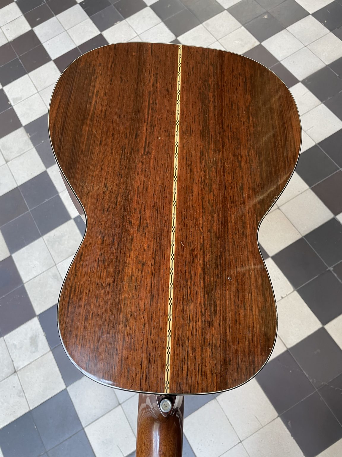 This splendid guitar from the end of the 1950s could well be the quintessential instrument for lovers of finger- and flatpicking alike: a 12-fret neck, a good width at the nut and a relatively large string spacing allowing for comfortable playing in the techniques mentioned above. The instrument itself is absolutely immaculate, with its spruce top and stunning rosewood back and sides, original varnish, pickguard, rosewood bridge and tuners.