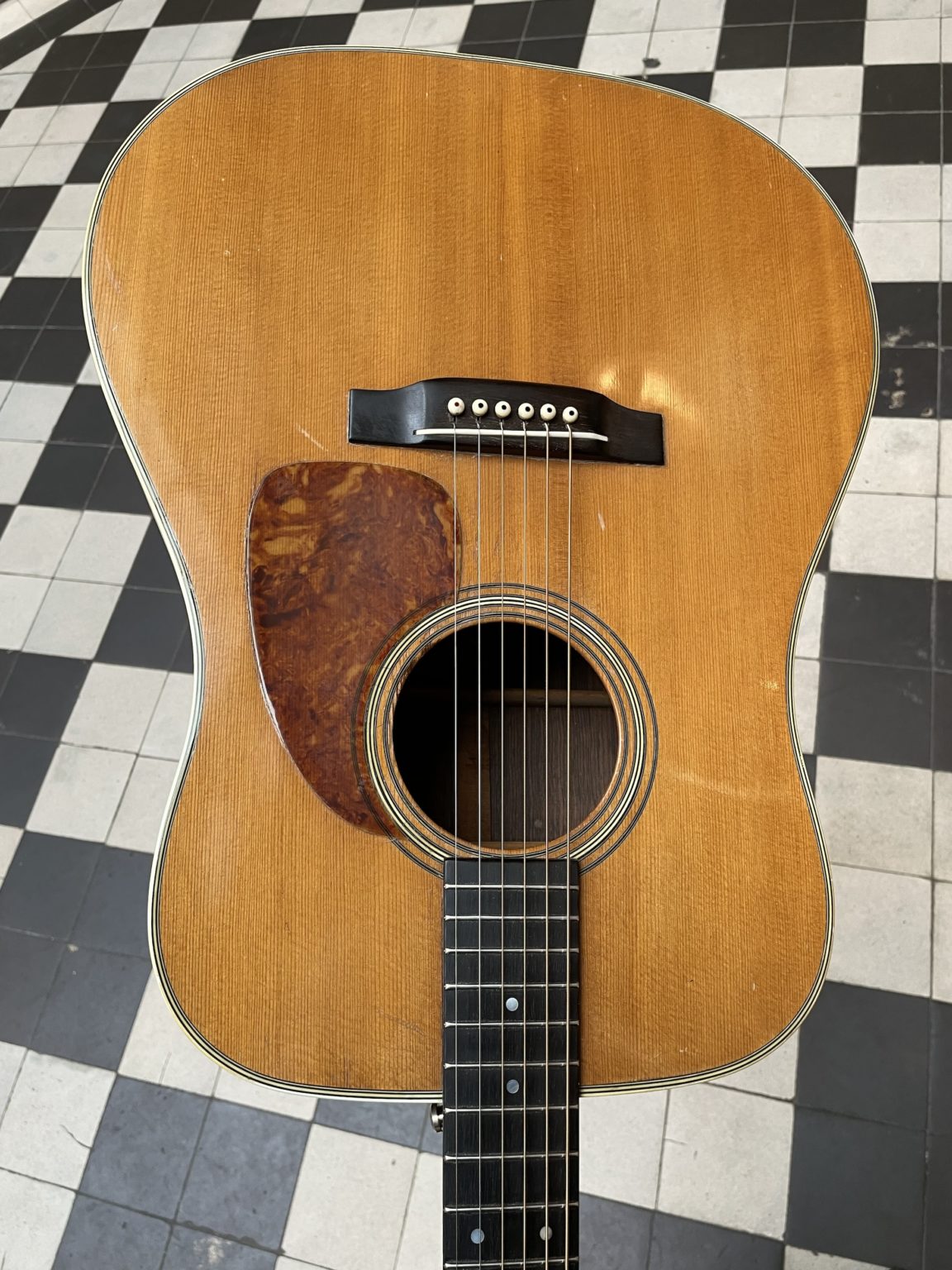 Like all acoustic guitars of a certain age, and although it is superbly preserved, this D-28 required significant work to restore its full qualities as a musical instrument, which was carried out right here in our workshop. In order to recover an ideal action and a good angle of the strings on the bridge saddle, we carried out a neck reset: ungluing the neck to readjust its angle in relation to the top before gluing it back in the correct position. This particularly delicate operation is essential if you want to be able to play an old musical instrument with comfort and accuracy, without modifying the parts that are essential in producing the sound, such as the bridge, the bracing or the bridge plate. Once the neck reset is done, the guitar is refretted to restore the playing base that are the frets in a perfectly uniform way; finally, a new set of bone saddle and nut is made and adjusted on the instrument, allowing to obtain a low and comfortable action and accurate intonation. We thus find a guitar with an excellent playability as the day it left the production line in Nazareth! Aside from an old overspray applied to the entire instrument, this 60-plus year old D-28 remains perfectly intact with all of its original main parts – a true testimony to the Golden Age of the American flat-top guitar.