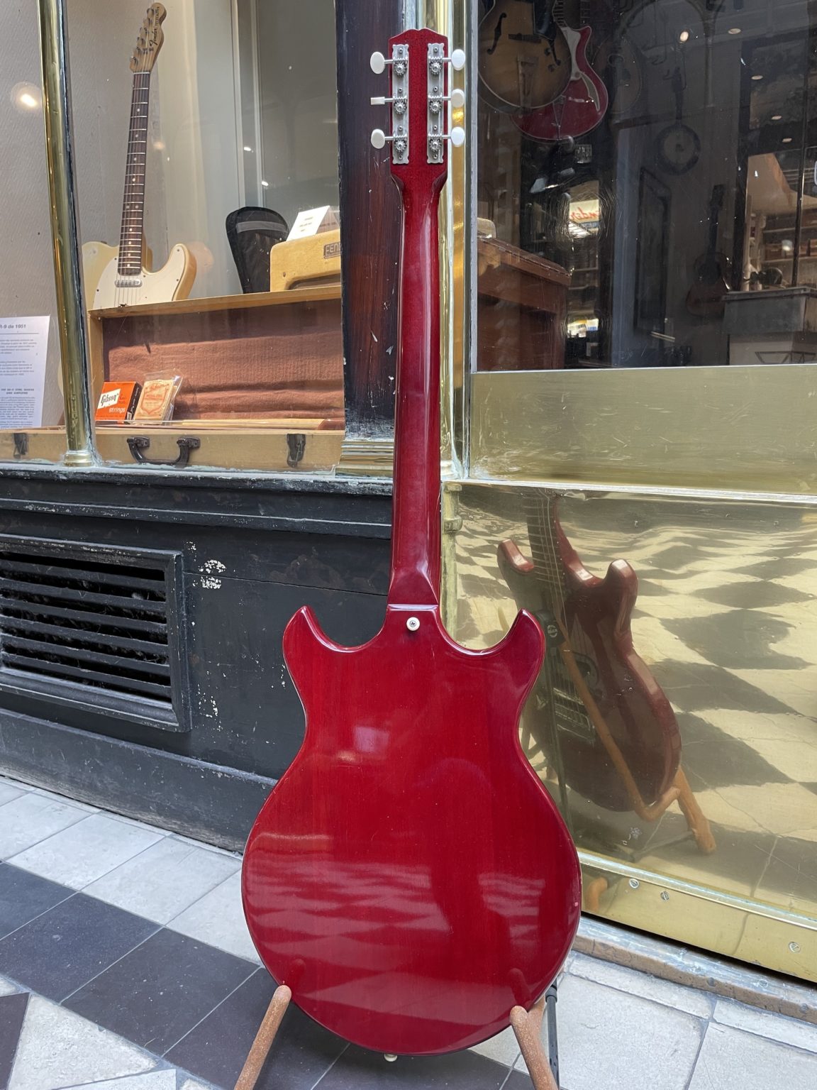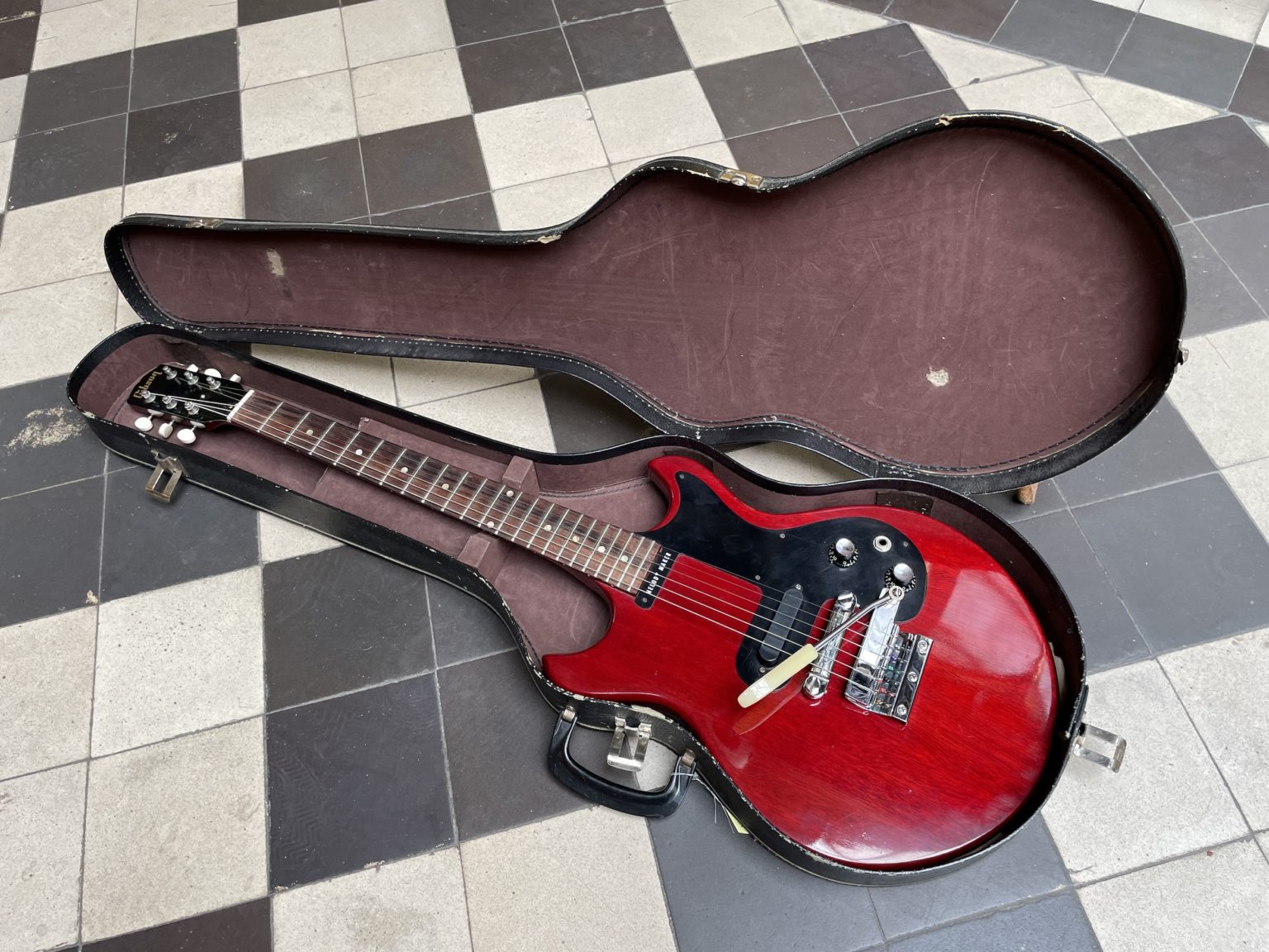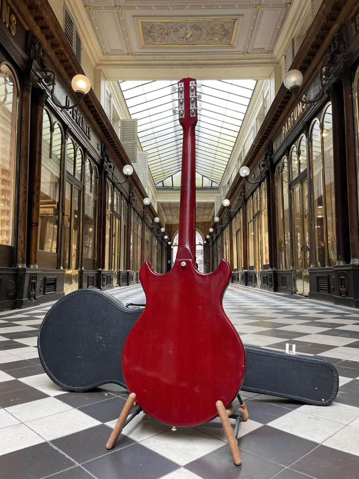 This instrument comes to us today exceptionally well preserved, with all of its original parts and hardware, including its compensated bridge and its Short Vibrola tailpiece, its tuners, its pickup and its electronics. The Cherry color is perfectly preserved, with very slight marks but as flashy as on its first day. Another sign that this guitar has been kept in optimal condition, its original cardboard case is also present – it is very common for these fragile cases, ironically marketed under the name Durabilt, to have been reduced to shreds after even normal use. The guitar stopped through our workshop where we carried out the complete optimization of its setup – work including the planing and polishing of its frets, the adjustment of the nut as well as the action and intonation at the bridge.