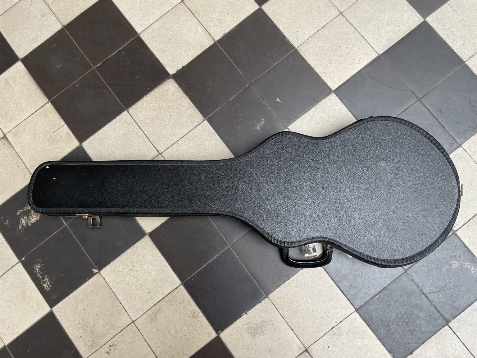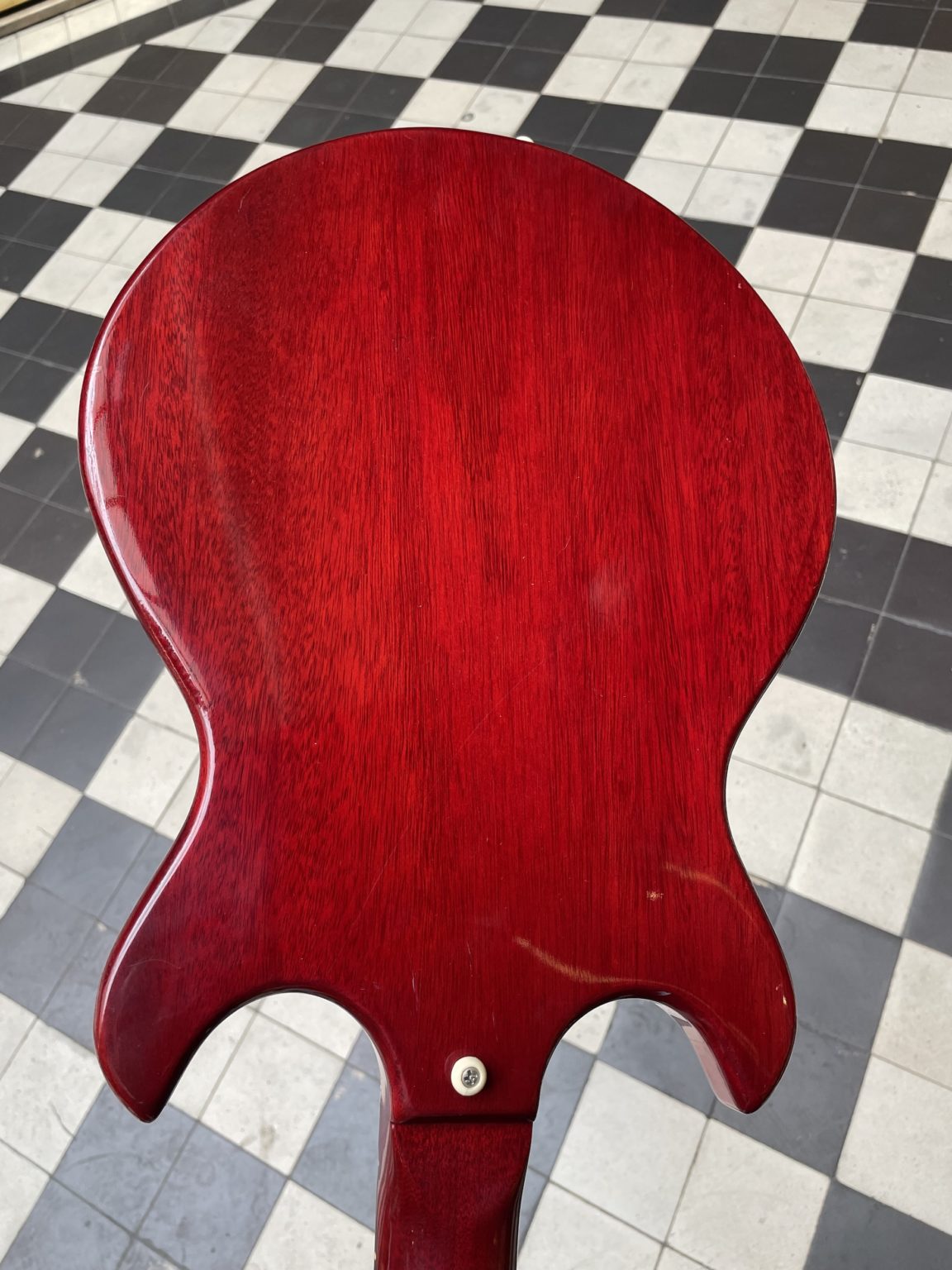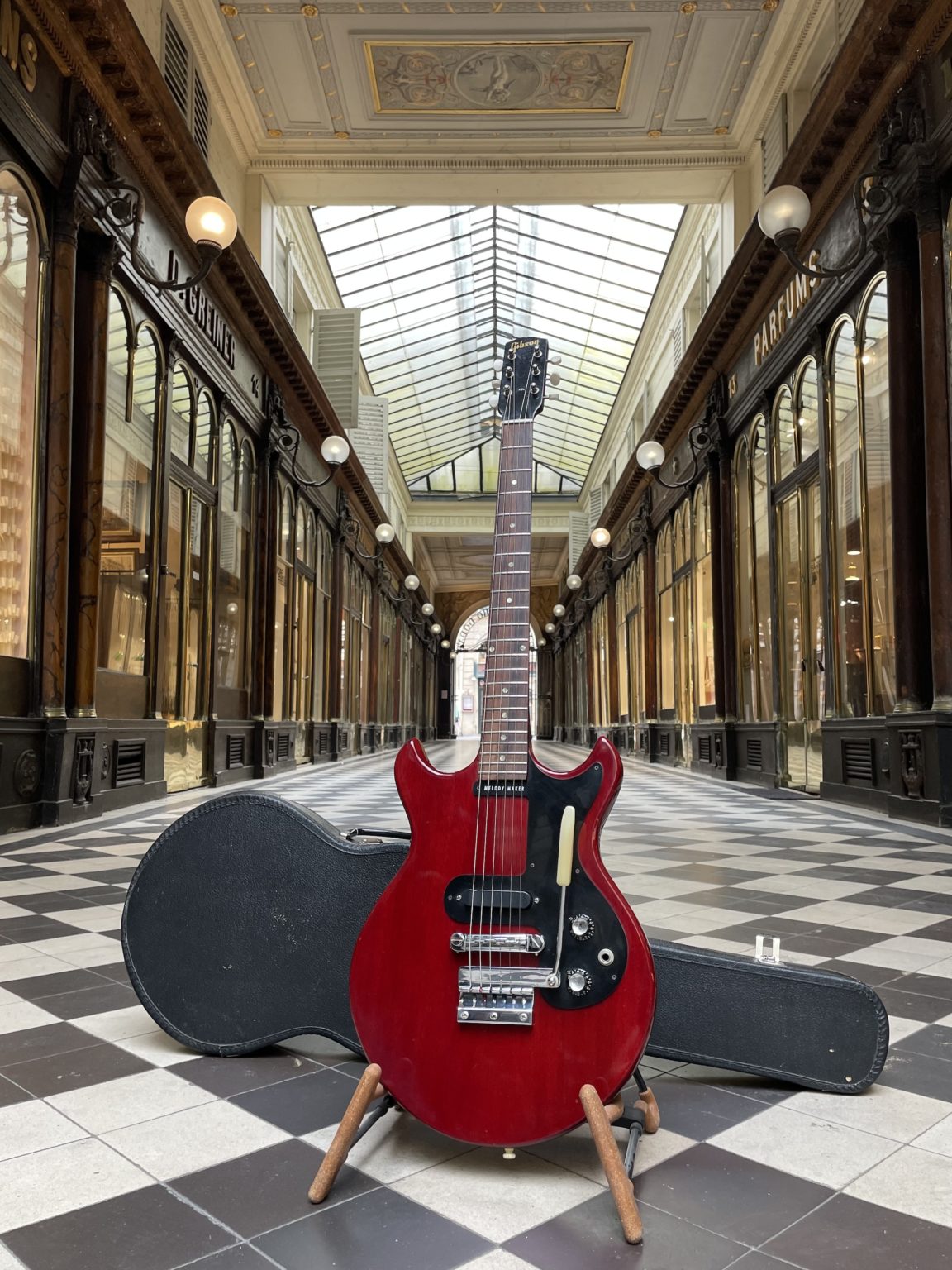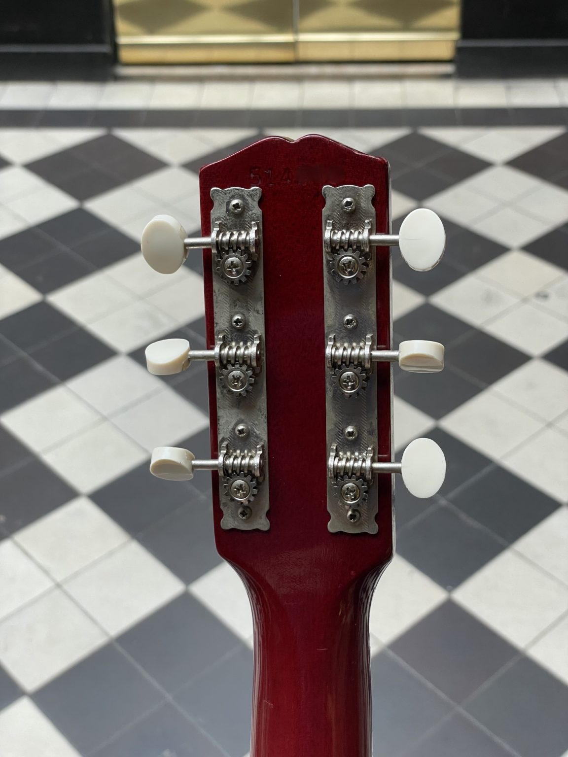 This instrument comes to us today exceptionally well preserved, with all of its original parts and hardware, including its compensated bridge and its Short Vibrola tailpiece, its tuners, its pickup and its electronics. The Cherry color is perfectly preserved, with very slight marks but as flashy as on its first day. Another sign that this guitar has been kept in optimal condition, its original cardboard case is also present – it is very common for these fragile cases, ironically marketed under the name Durabilt, to have been reduced to shreds after even normal use. The guitar stopped through our workshop where we carried out the complete optimization of its setup – work including the planing and polishing of its frets, the adjustment of the nut as well as the action and intonation at the bridge.