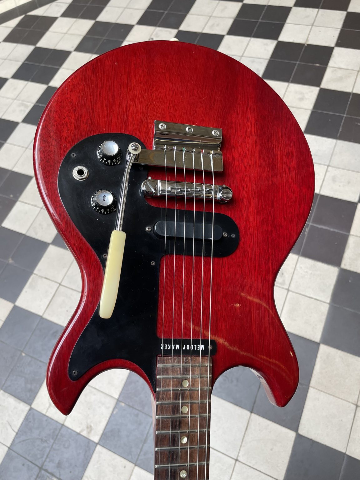 Between 1959 and 1965, the year of production of the guitar presented here, the Melody Maker experienced several successive aesthetic variations, ranging from a Sunburst finish with a single cutaway body, to a double cutaway body from 1961, then from 1965 with an even more pronounced double cutaway and a standard Cherry Red finish. This iteration was the last before the model adopted the SG body shape typical of the 1960s, in which it would appear until its ultimate withdrawal from the catalog in the early 1970s.