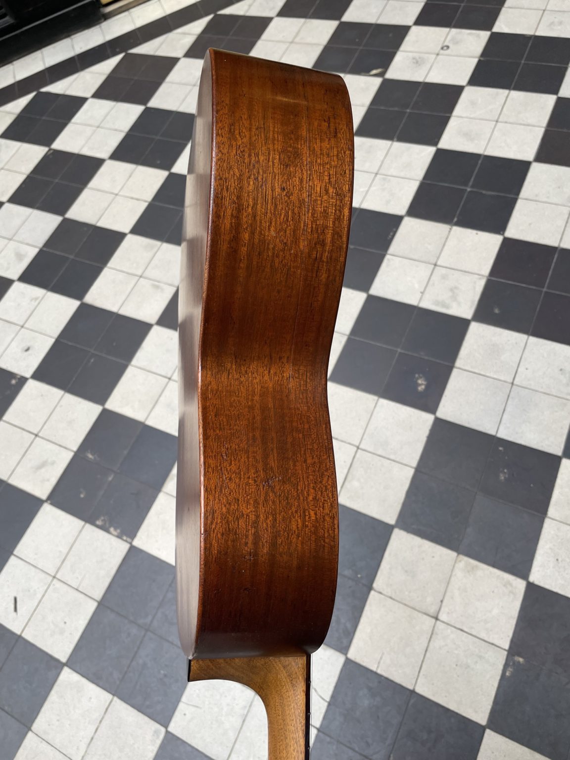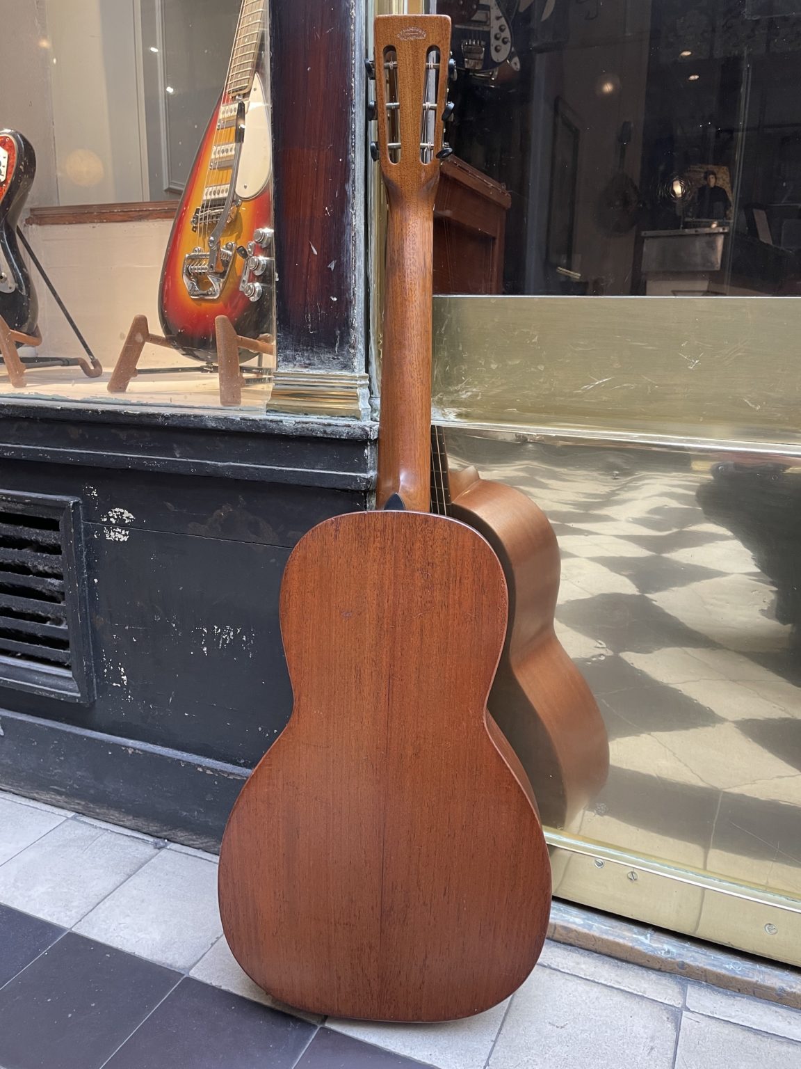 The guitar presented here was born at the dawn of the 1930s, when the United States was capsizing in the midst of economic crisis… yet Martin managed to sell no less than 475 2-17s in 1931. A feat of production, and also proof that the simplest, most refined models, made of a single type of wood, mahogany, met a demand that was not the least in these difficult times – the same one that would ensure the success of the 0-17 model, which would supersede the 2-17 in the following years thanks to its increased body size. However, despite its appearance, the 2-17 develops a surprising sound power and a very beautiful balance in all playing positions, thanks to the finesse of the wood parts that constitute it and in particular its scalloped bracing associated with a small maple bridge plate that allow the maximum vibration of the soundboard. The 2-17 is a unique instrument, at the confluence of Martin’s two eras: it combines archaic elements such as bar fret and a neck with twelve frets clear of the body, along with the nascent features of the modern flat-top, and it is certain that although it is little known, it is an essential guitar among Martin’s pre-war models.