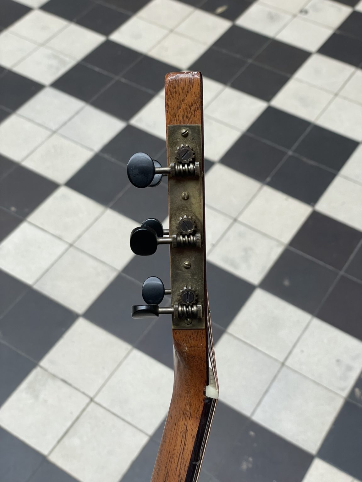 The instrument remains to this day in excellent condition, free of major defects. In order to restore perfect playability, we have conducted a neck-reset to restore low action while retaining all the original parts, including the small rosewood bridge and the bridge plate. We have also crafted a bone nut in copy of the original, and refretted the guitar with bar frets identical to those initially used.