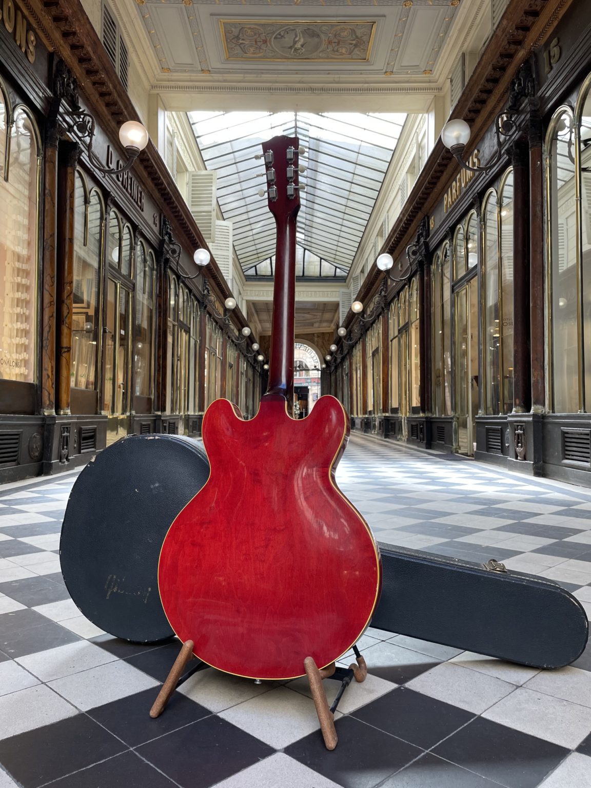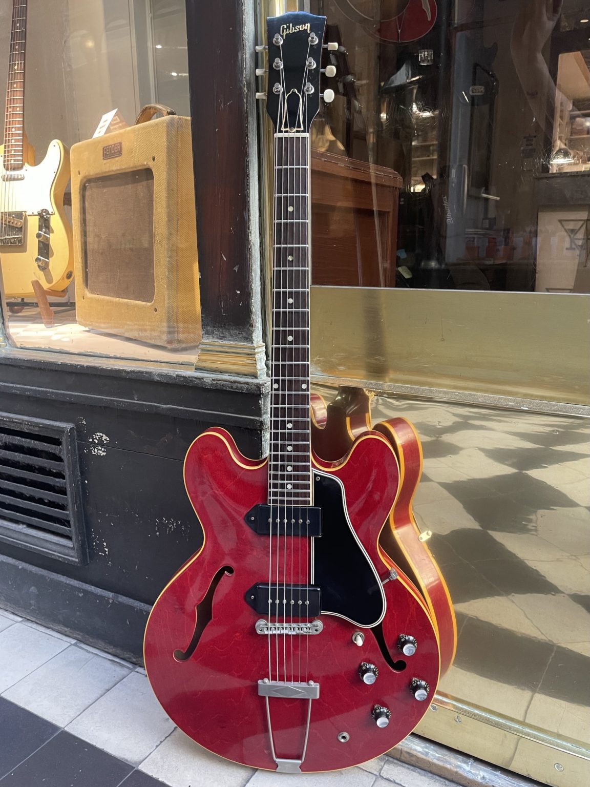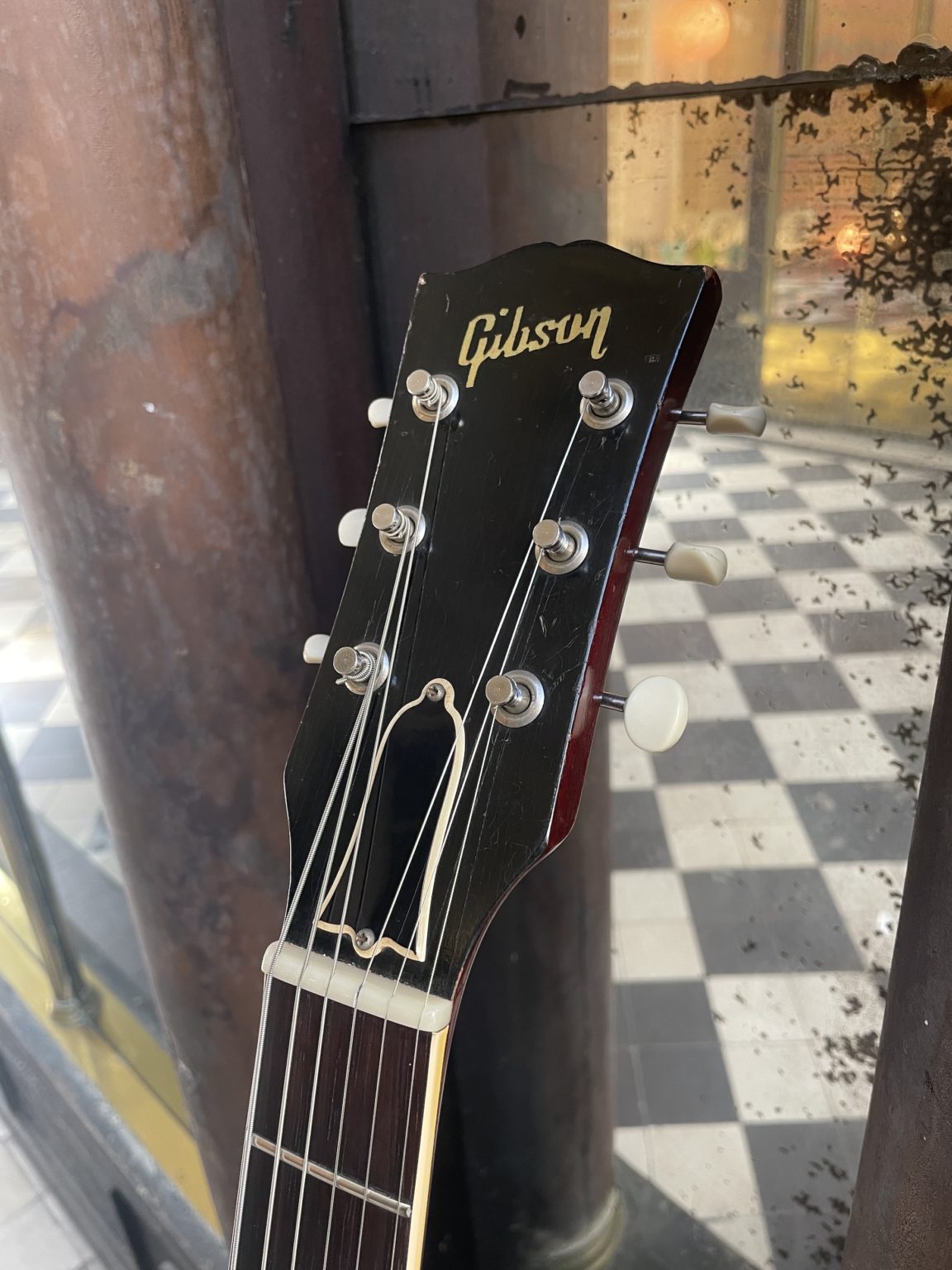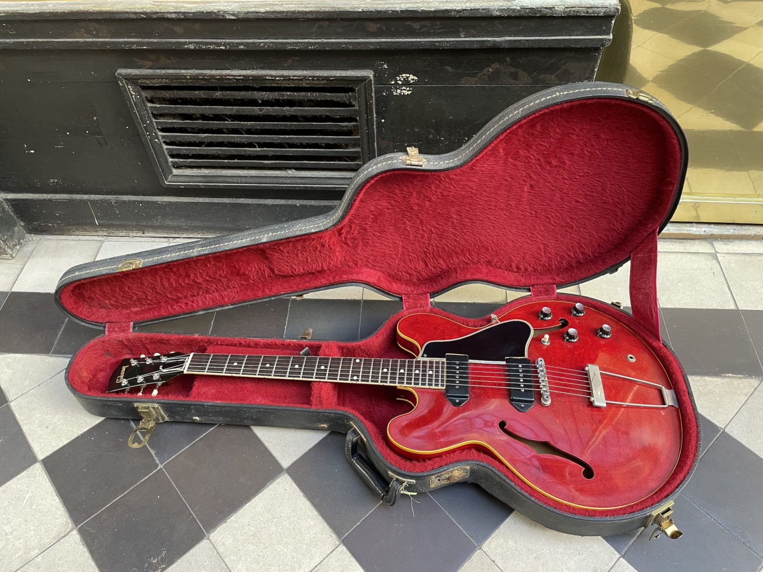 The neck profile of this guitar is typical of the early 60s, thinner and flatter compared to the 50s, a characteristic specific to this period. The headstock has a simple Gibson pearl inlaid logo, without any other embellishment, the tuners are the original Kluson Deluxe with their round plastic buttons. Finally, we find the standard wiring with a 3-position selector associated with a volume and tone control for each pickup. All of the electronics are original, perfectly unaltered over the 60 years of existence of the guitar with the potentiometers and the Sprague Black Beauty capacitors with intact solder joints, as well as the hardware with the sole exception of the bridge which is a modern TonePros part. We note a slight stress which occurred at the rear of the neck at the location of the truss-rod, this area is nevertheless perfectly stable to date. The Cherry finish is superbly preserved, the varnish has barely detectable crazing and minimal wear. The condition is, in fact, exceptional – so much so that no one has yet even attached a strap button to the heel of the neck! Connected to an amp, we immediately find all the raw sounds of the two P-90s which made the model a true icon in the 60s, alongside its twin produced by Epiphone, the Casino, in the hands of a Beatle or a Rolling Stone, a Chuck Berry or a young B.B. King – they’ve all been there!