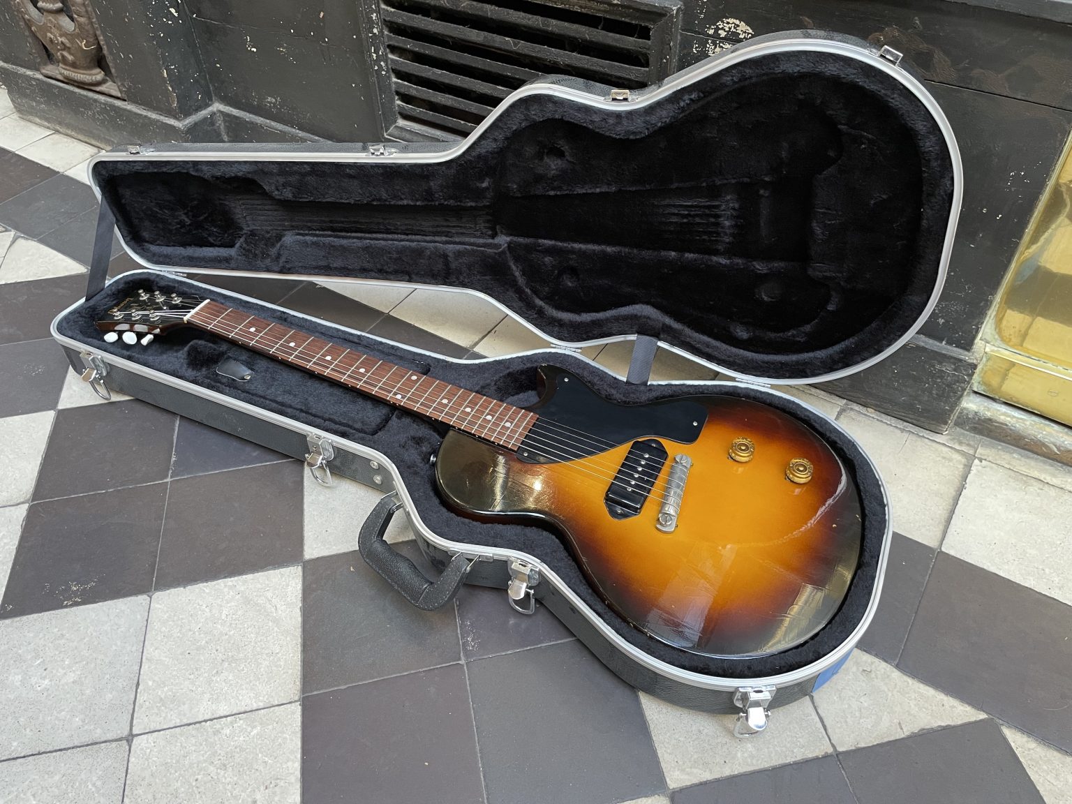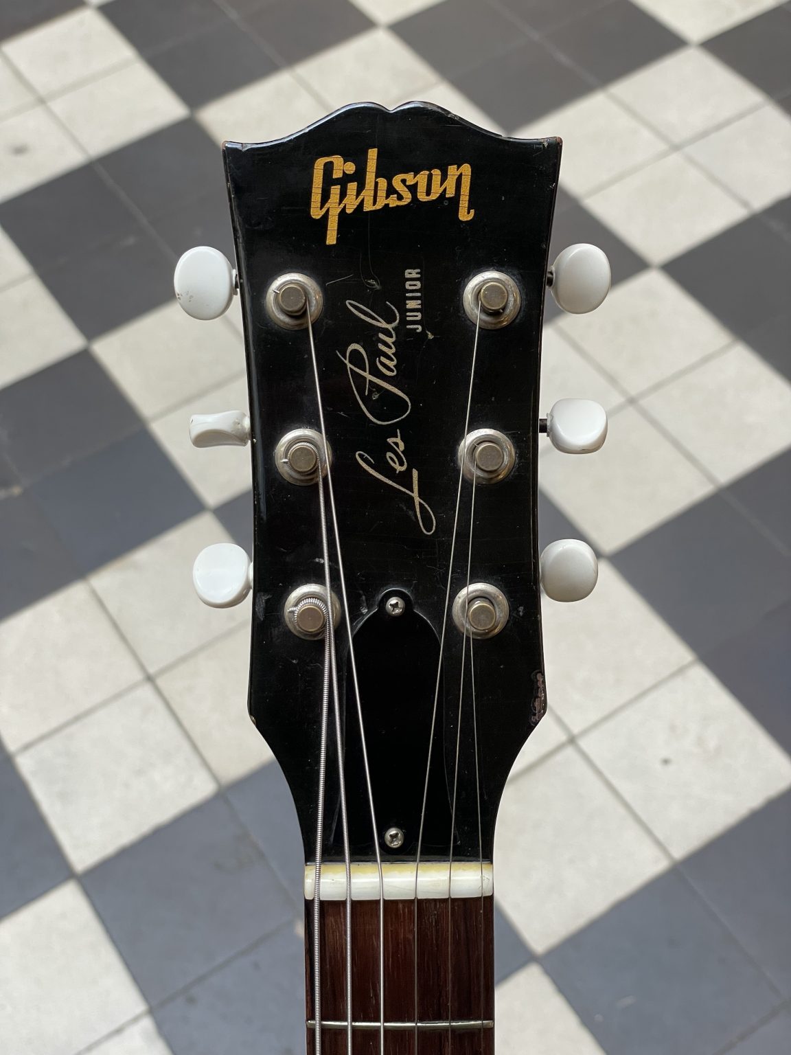 Here is a Junior in a condition which is increasingly uncommon to come across, from the first year of production, one of the most simple yet elegant electric guitars ever designed. As its name suggests, the Les Paul Junior was the starter model in the line bearing the American musician’s name in the 1950s, with a single P-90 pickup in the bridge position and a simple combination bridge/tailpiece stop-bar. For Gibson, the goal was that of reproducing the success that the ES-125 models for electrics or LG-1 for acoustics had met in their time: guitars of simpler making, but presenting the same construction quality of high-end models – in the case of the Junior, this translates as a flat-top, solid mahogany body instead of having the maple cap present on the Standard and Custom models, the absence of binding around the body and fingerboard, simple dot style fingerboard inlays, and the Gibson logo silkscreened on the headstock instead of being inlaid with mother-of-pearl. Indeed, the creators of the model were able to implement a minimalist, superbly effective design and the Junior was a hit right from its debut: launched in the summer of 1954 during the NAMM show, 823 guitars were sold in the first months, then more than three times that figure in 1955, proving to Gibson management that their bet was successful, and that solidbody electric guitars were here to stay.
