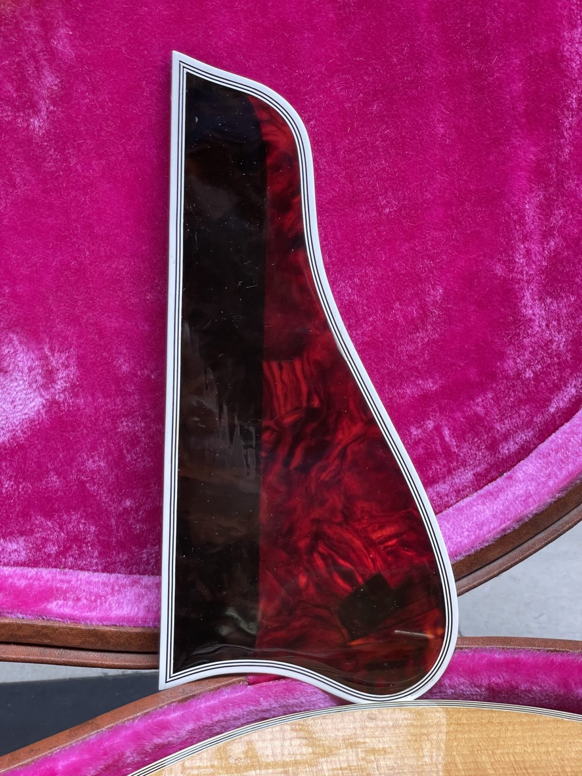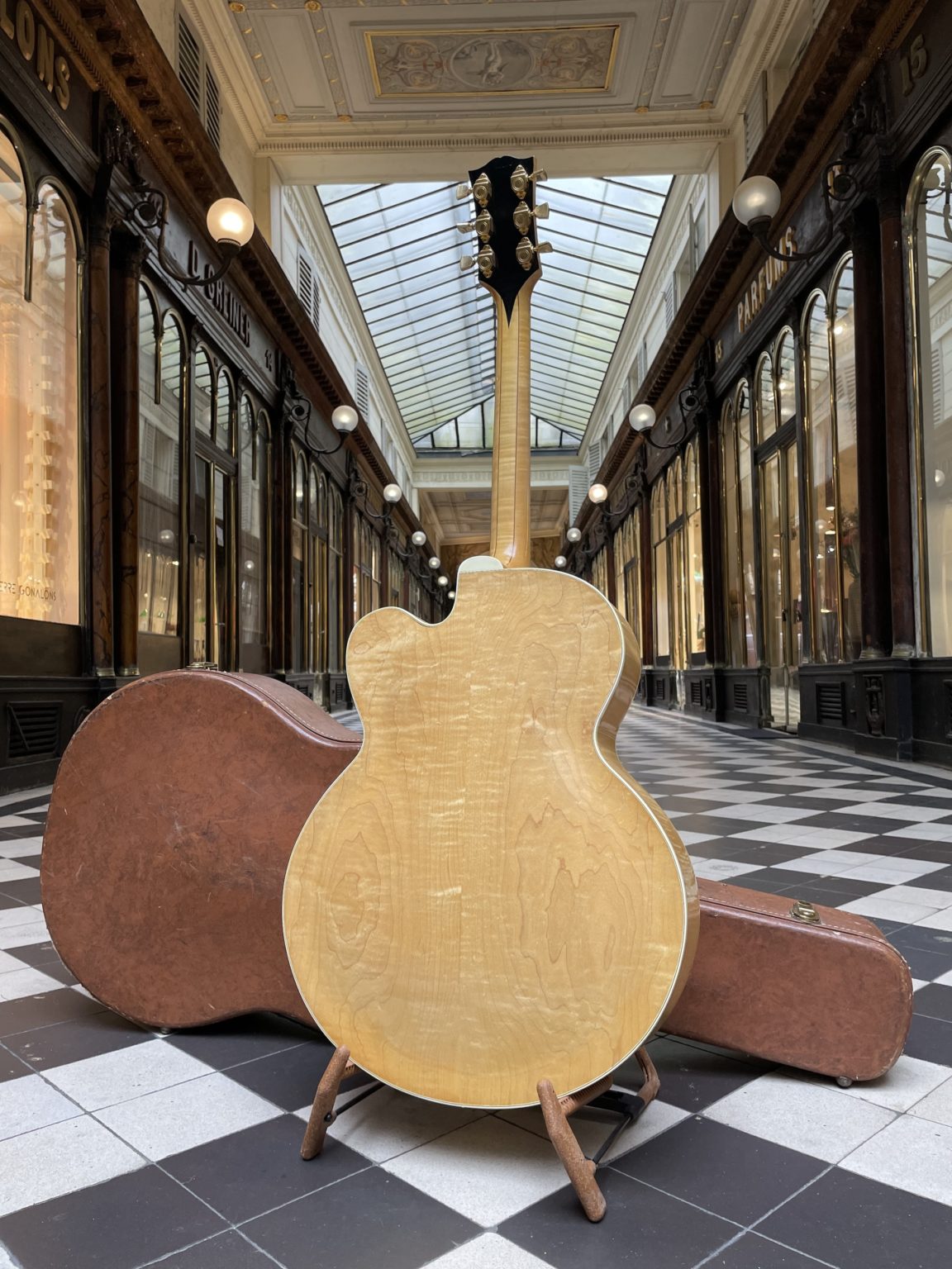 We must emphasize the almost mint condition of the guitar, which gives it a significant interest – even for us, it is uncommon to encounter 60+ year-old instruments that are so well preserved, to the point that they seem never to have been played! Although inherently acoustic, this L-5 is equipped with a floating pickup in the style of a Johnny Smith, this system having the interest of not requiring any cut-outs or drilling since the attachment of the microphone is done directly on the ‘guard. The original pickguard is preserved in the case, along with the original tags and case key.