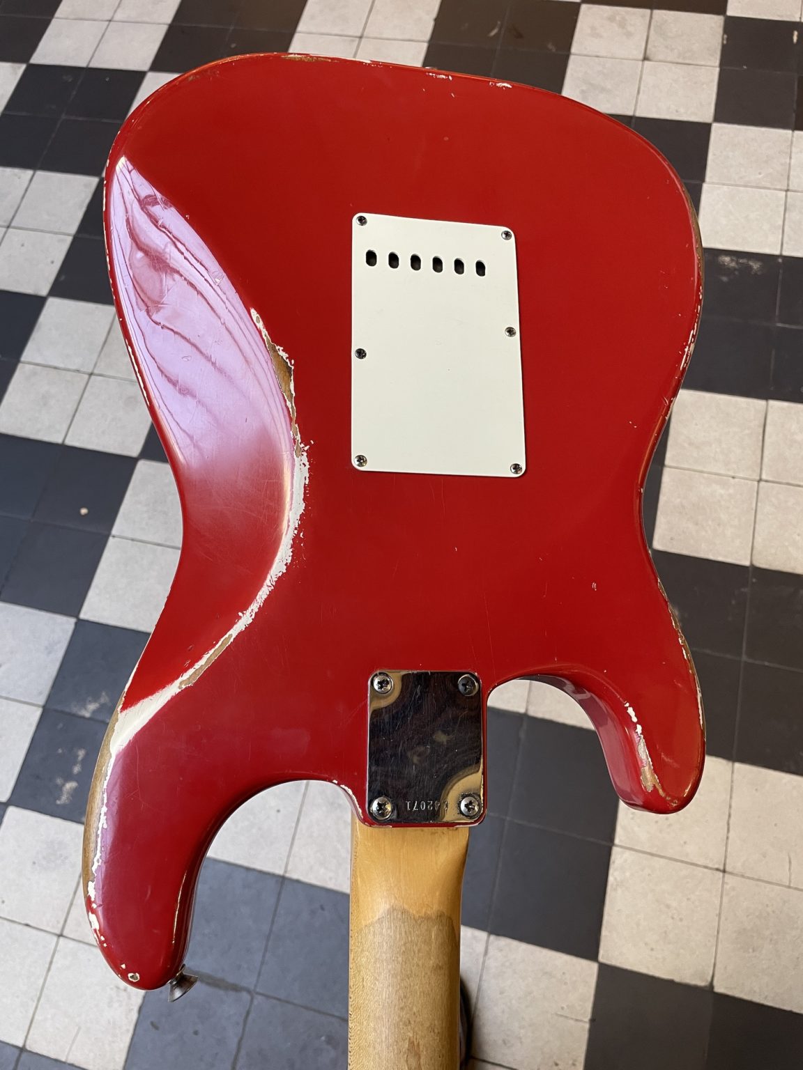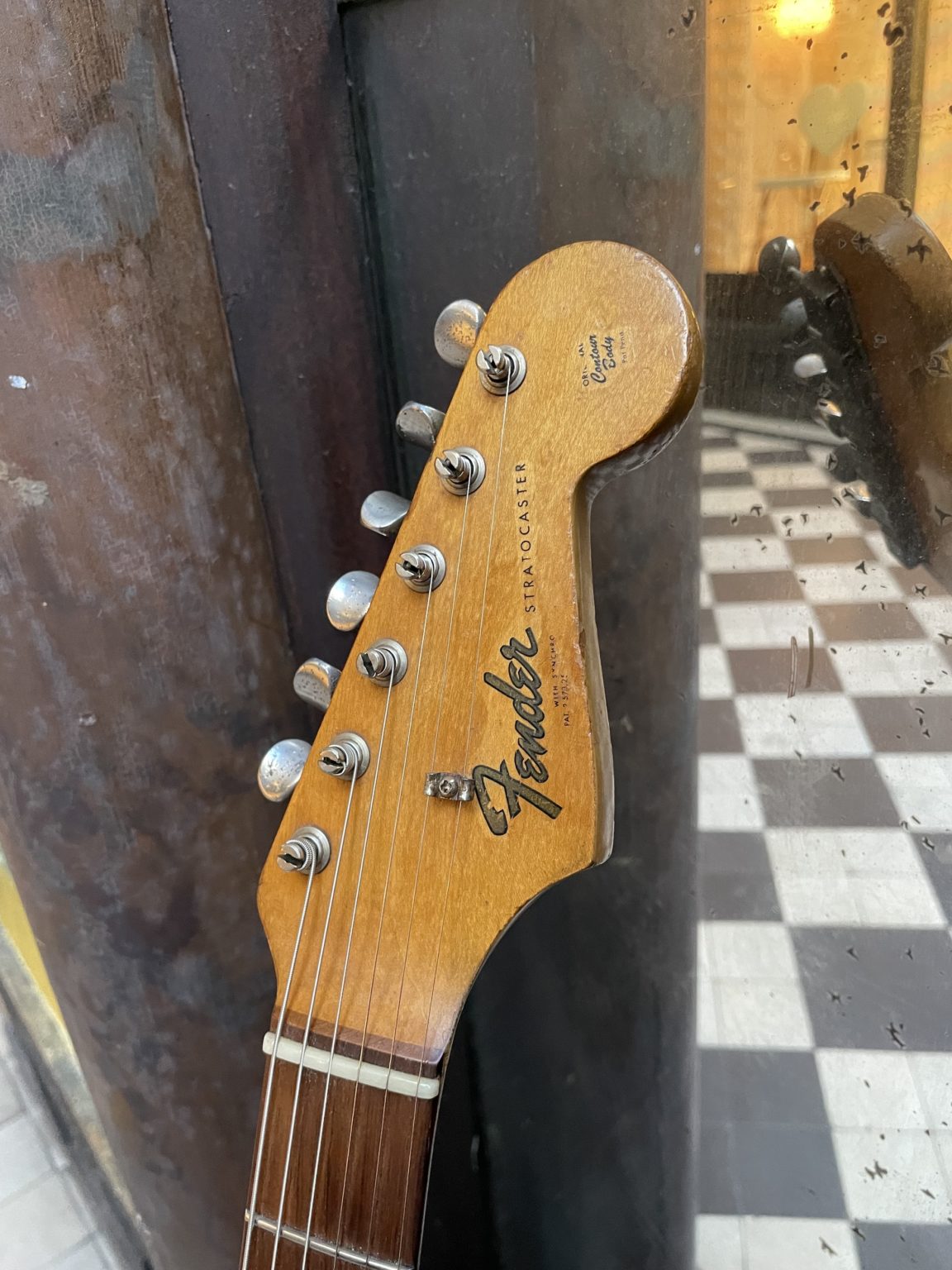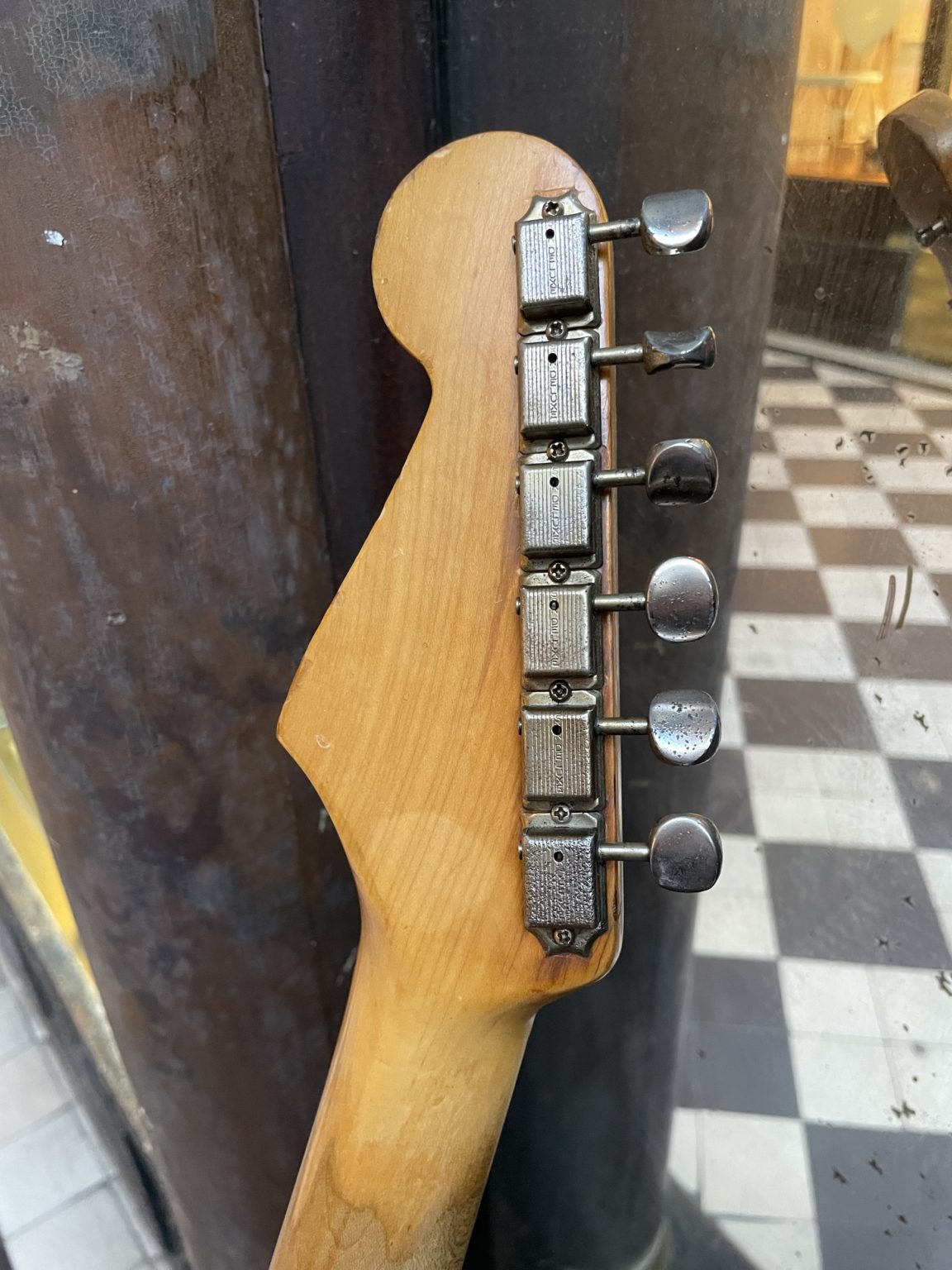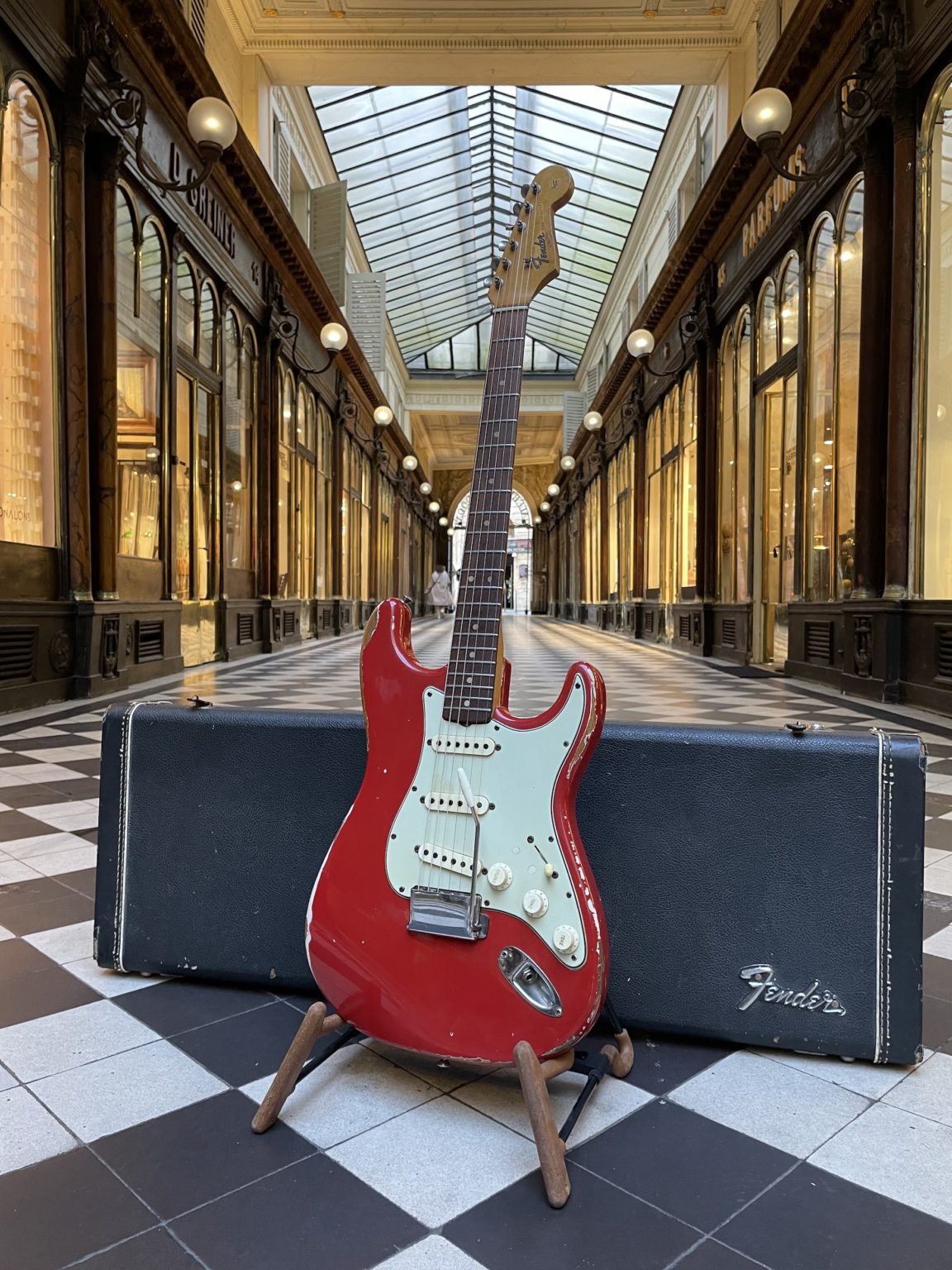 On top of the finish of the guitar, the original selector switch has been changed to a 5-way selector switch (the original 3-way switch is kept in the case, and can be reinstalled upon request) and the volume potentiometer has been replaced. The rest of the electronics, wiring, and hardware of the instrument are original. All in all, we have a guitar which has been played a lot and therefore undergone some transformations, but nevertheless retains what makes the charm of the pre-CBS Stratocasters: the sound of its pickups, the profile of its neck, its light weight – all elements which make it a versatile guitar and ideal for long playing sessions. The guitar has been appraised, fully setup and prepared in our workshop, in perfect playing condition.