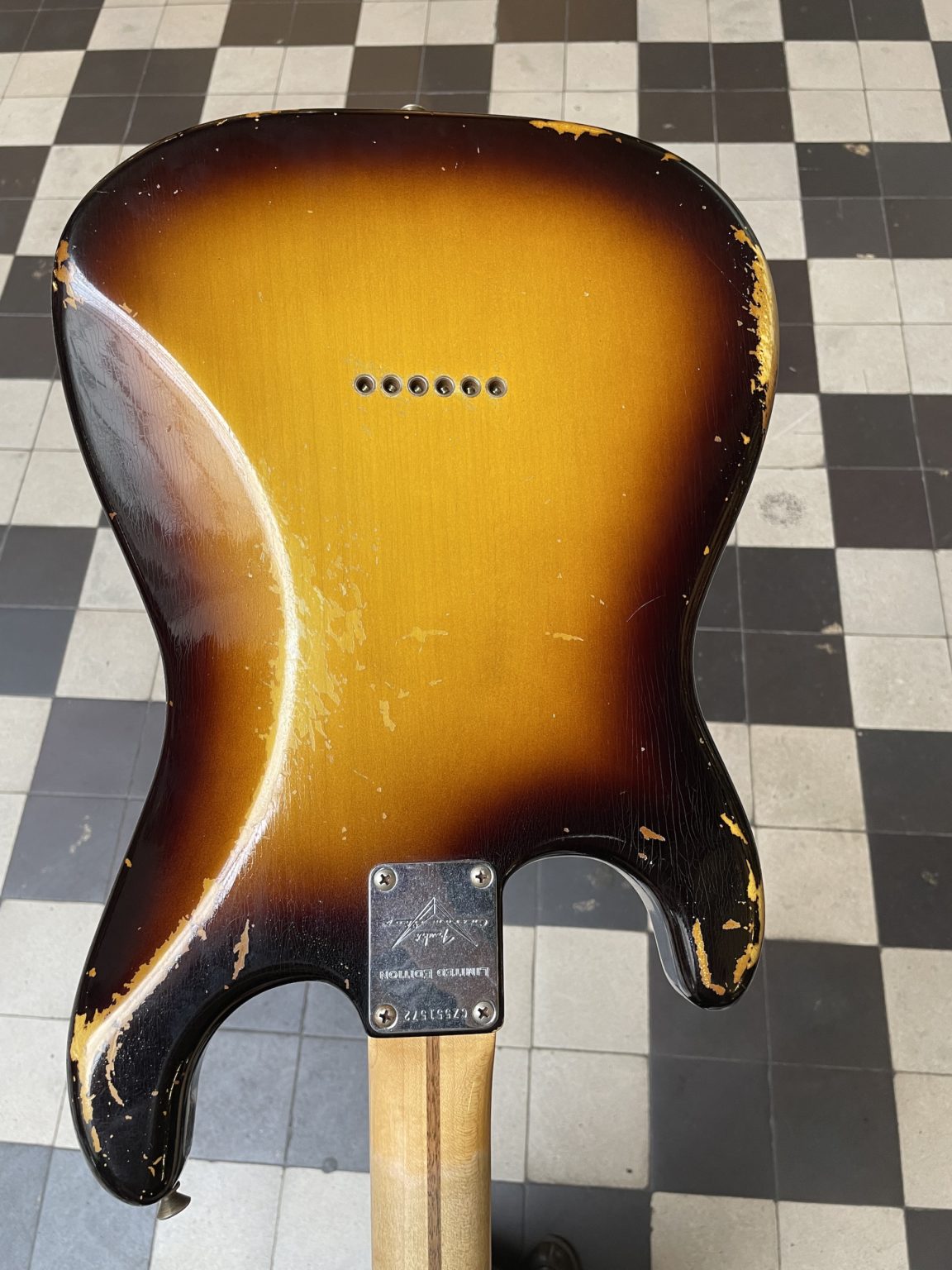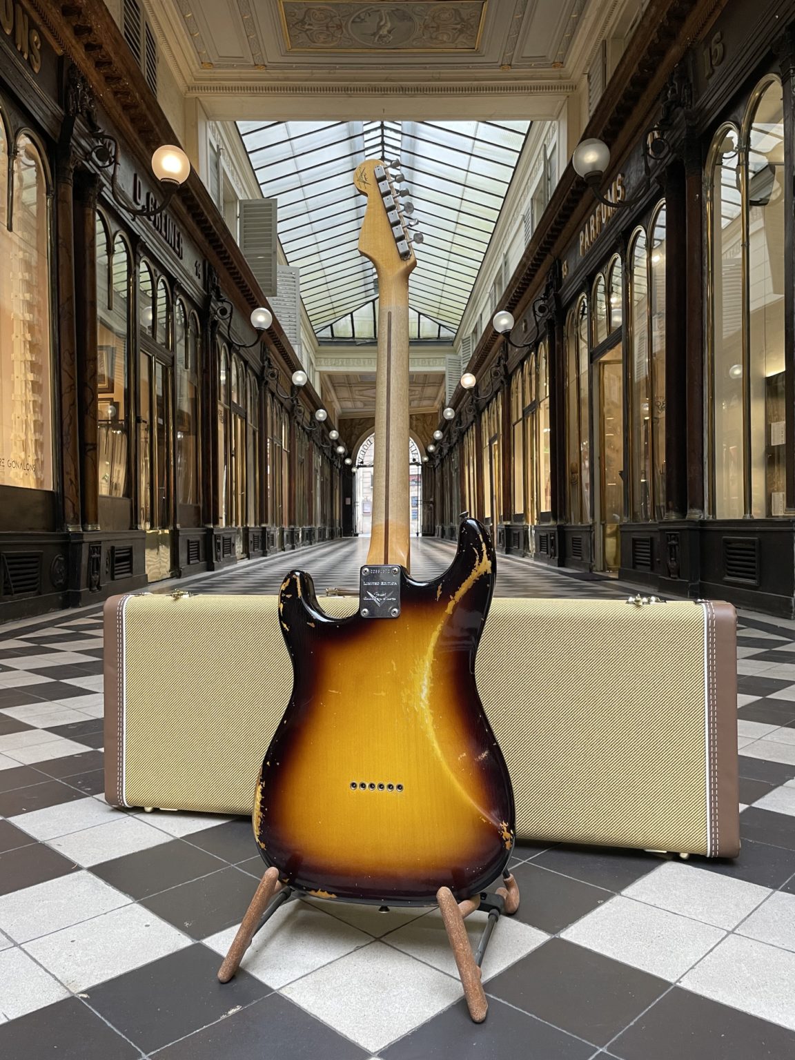 Let’s first note two particularities concerning this guitar: first of all, it is a Non-Trem model / Hardtail without the vibrato bridge, as was offered in the catalog since the introduction of the Stratocaster (allowing the buyer to save 20 dollars all the same!). The strings thus pass through the body as is the case on the Telecaster. The other notable point is the set of pickups that equips this instrument: designated Troposphere, they are specially designed by the Masterbuilder Paul Waller with a reduced number of windings in order to attenuate the output level, and thus emulate the response of the set of authentic 50s Strat pickups. The neck pickup is reverse-wound and reverse-polarity relatively to the other two, allowing a humbucking effect when it is used in conjunction with either the neck or the bridge pickup. The guitar also features an alder body with a beautiful 2-tone relic Sunburst finish, a one-piece maple neck, and hybrid wiring with a modern 5-way pickup selector switch combined with traditional volume and tone controls. The instrument is extremely light and pleasant to play, with a slightly V-shaped neck that fits just right in the hand. We have optimized the setup elements of this guitar to make it perfect to play, with low action and accurate intonation.