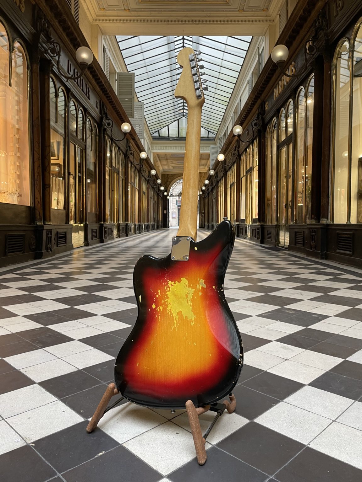 The bridge, tremolo system and rhythm circuit have been adapted from the Jazzmaster, while pickup selection is controlled by a set of switches placed on the treble side of the body. Each pickup is wired through an on/off switch, a third switch allowing activation of a capacitor cutting off a majority of low frequencies. The 24-inch scale is significantly shorter than that of other professional Fender models, making playability akin to that of the Mustang, Musicmaster and Duo-Sonic models: as such, the guitar does better with a stronger string gauge. Both single-coil pickups feature metal “claws” under the coil designed to focus the magnetic flux of the part, and are optimized for attack and sharpness. This combination of characteristics gives the Jaguar a wide sound palette and a very specific playing sensation, which probably caused the model to fall out of fashion as tastes changed in the late 1960s. Despite its recent revival, the Jaguar remains a historically underestimated guitar and commands our attention: the first models produced in the pre-CBS period are of the highest quality, and make eminently inspiring instruments for a whole diversity of playing styles for anyone who intends to diverge from the usual Stratocaster and Telecaster!