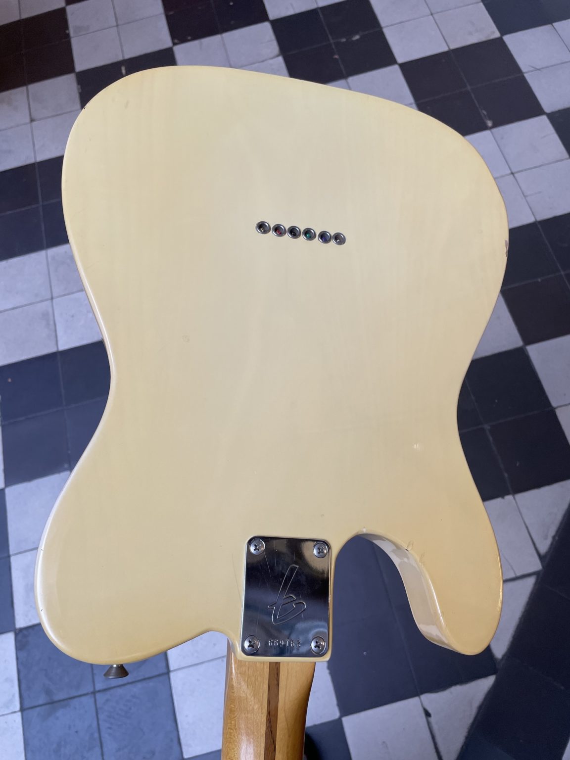 The guitar, made at the turn of the 1960s and sold in 1970, is in superb original condition. We find on the instrument a number of characteristics linking it to the CBS era: the new logo in bold black letters which, if the story is to be believed, was been designed to facilitate the readability of the brand name on the television screens, the F-stamped tuners introduced to replace the Kluson Deluxe previously used, the return to one-piece maple necks with the skunk stripe on the back which had been abandoned in 1959 in favor of rosewood or maple fingerboard necks .