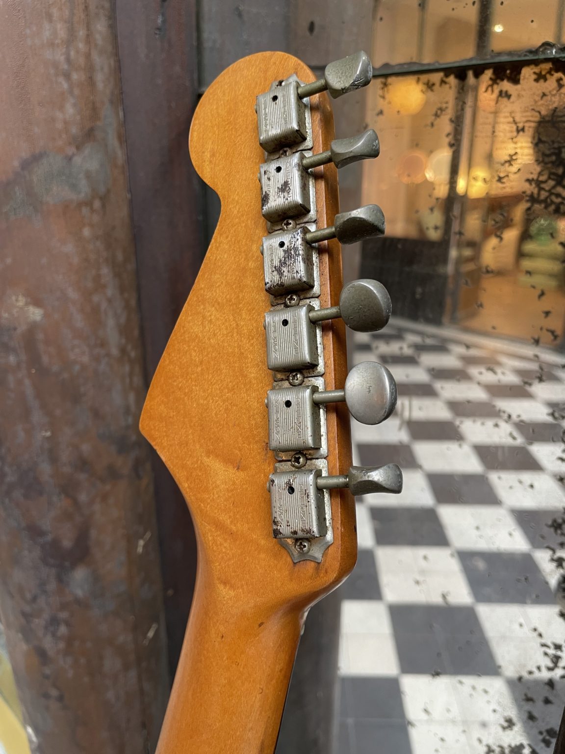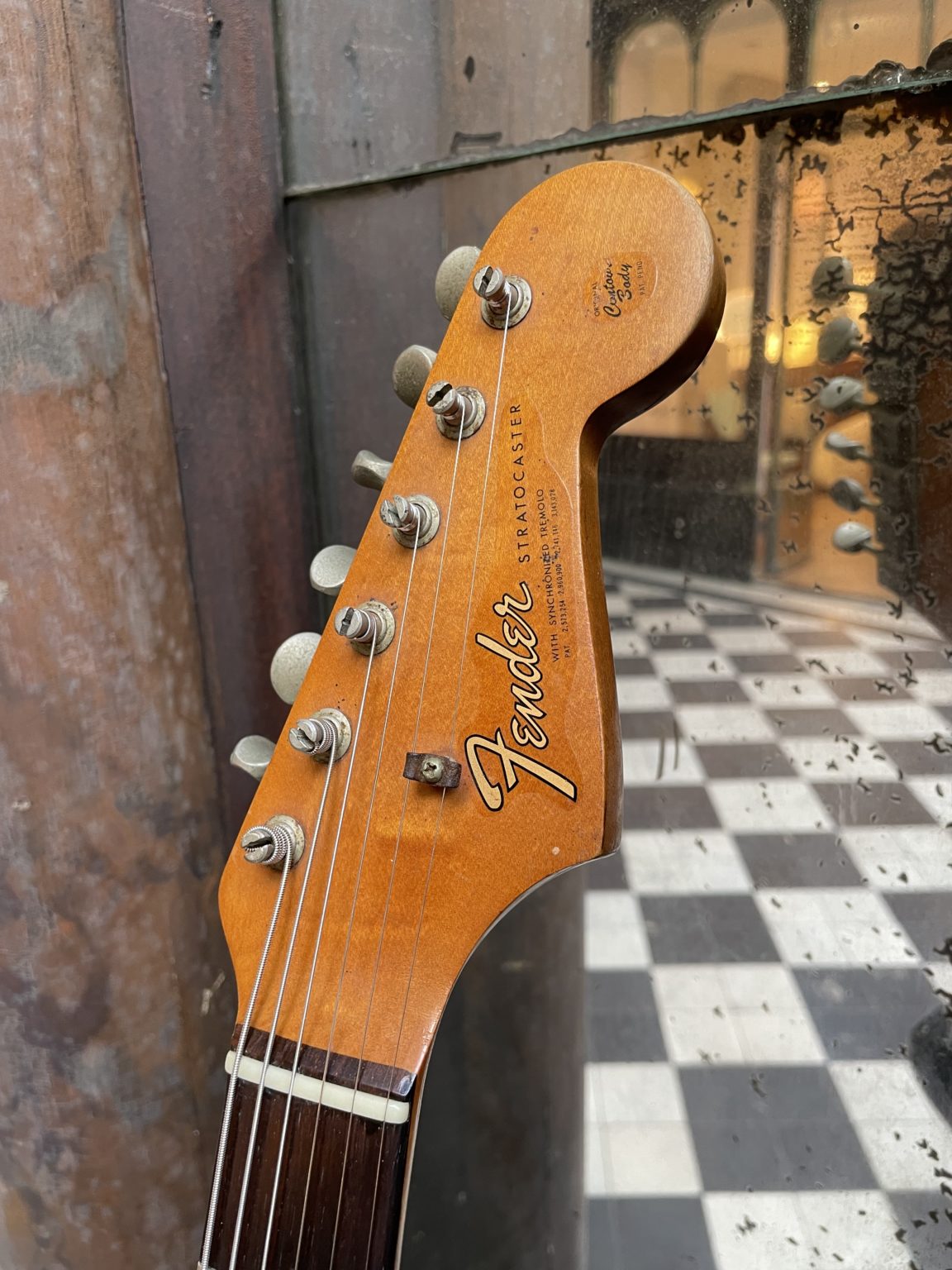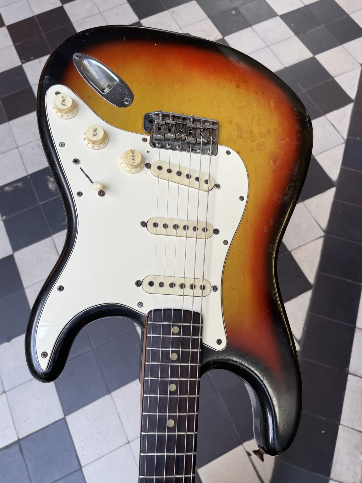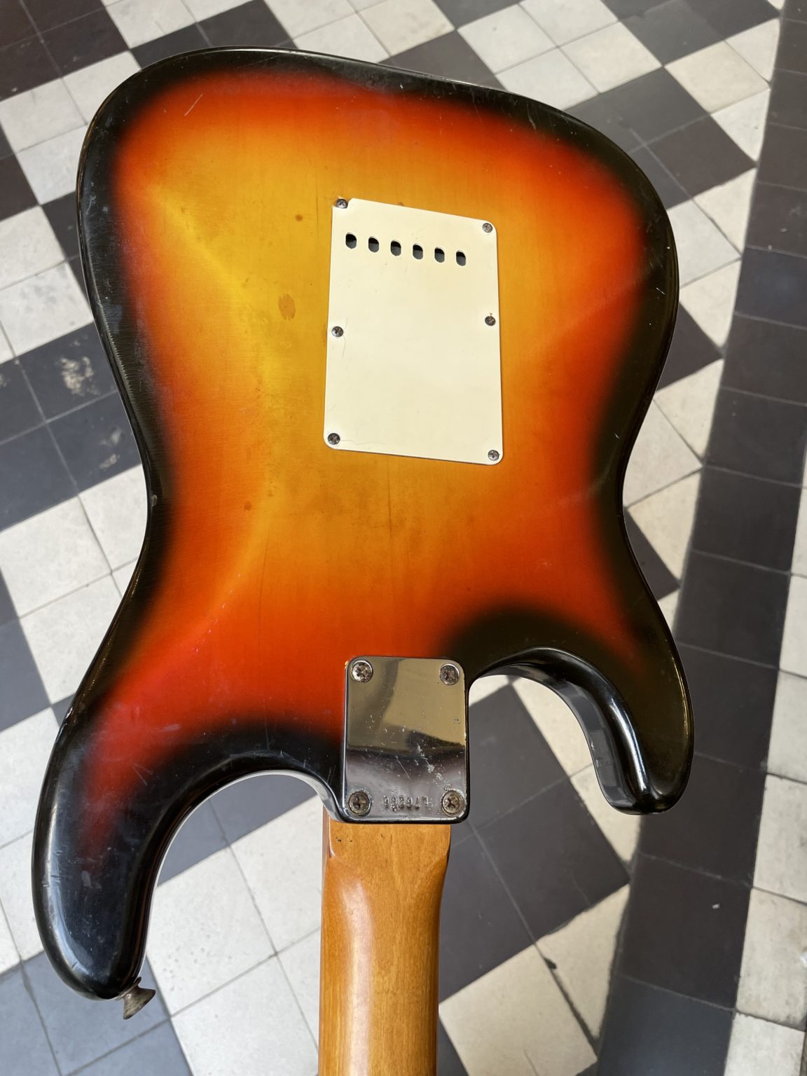 Other than that, all of the original elements are there, starting with the beautiful bullseye-style Sunburst finish, so called due to that fact that for the sake of saving time, the three colors were applied using a mask and no longer done in by mastered hand movements, giving a more uniform result from one guitar to the next but with less fading between each shade, clearer transitions from yellow to red to black not unlike the concentric zones of a target. We also find the transitional Fender logo in bold golden letters, Kluson Deluxe double-line tuners, the small headstock typical of early-era Strats, three grey-bottom single-coil pickups with the original wiring intact, pearloid dot inlays … all of the elements that make up a iconic model, before the gradual switch to instruments of a wholly different nature.