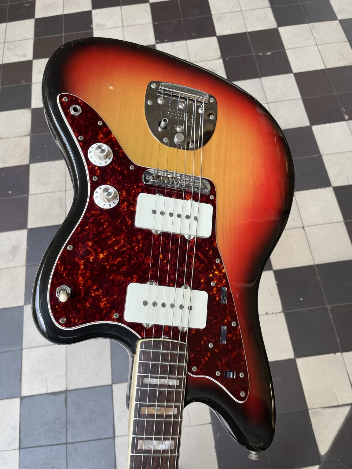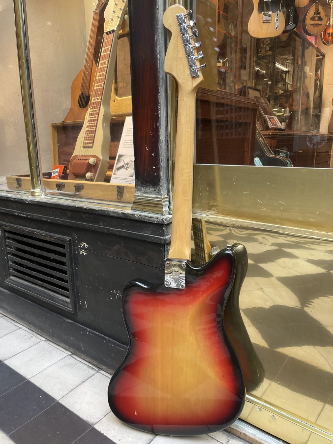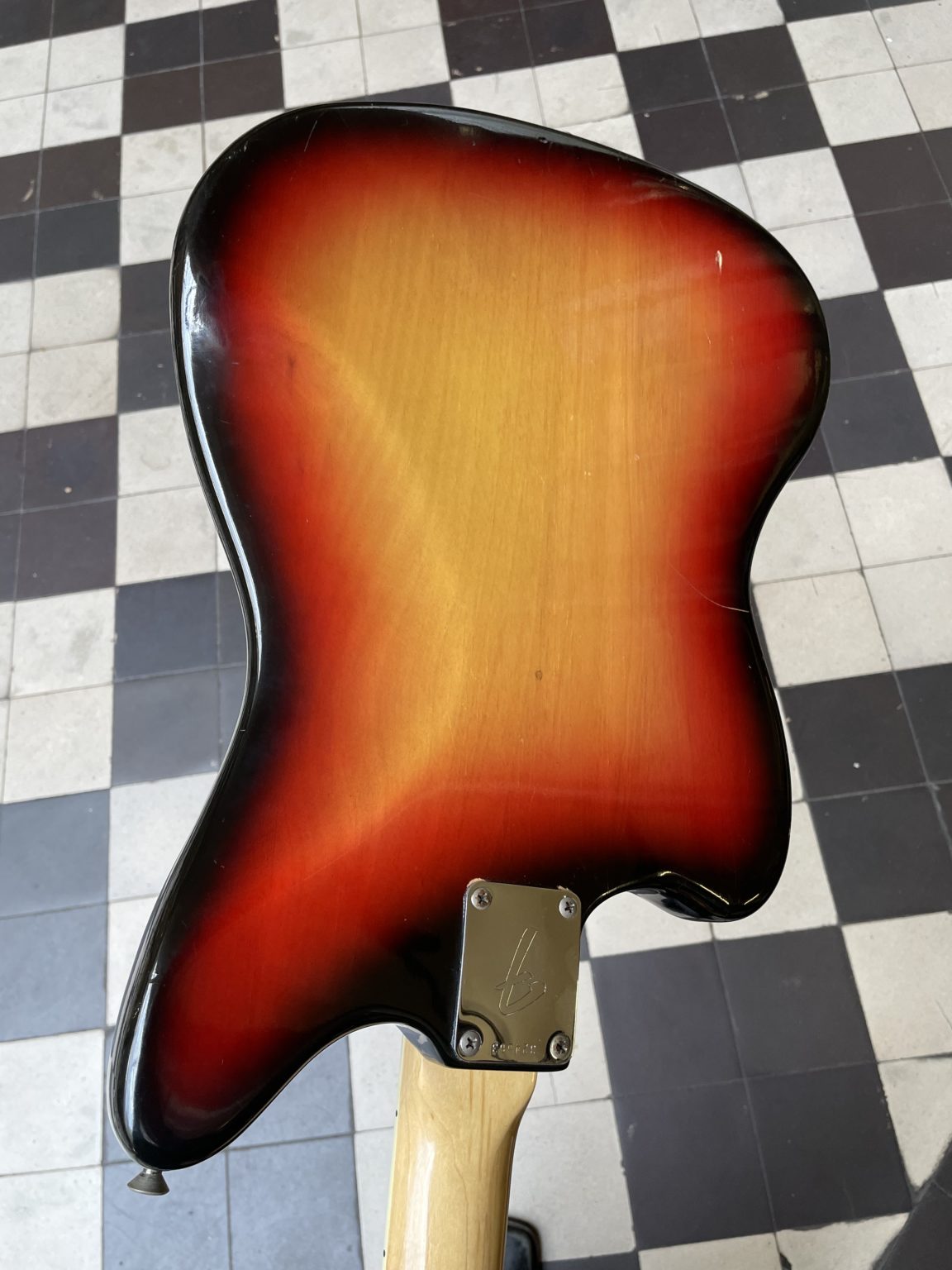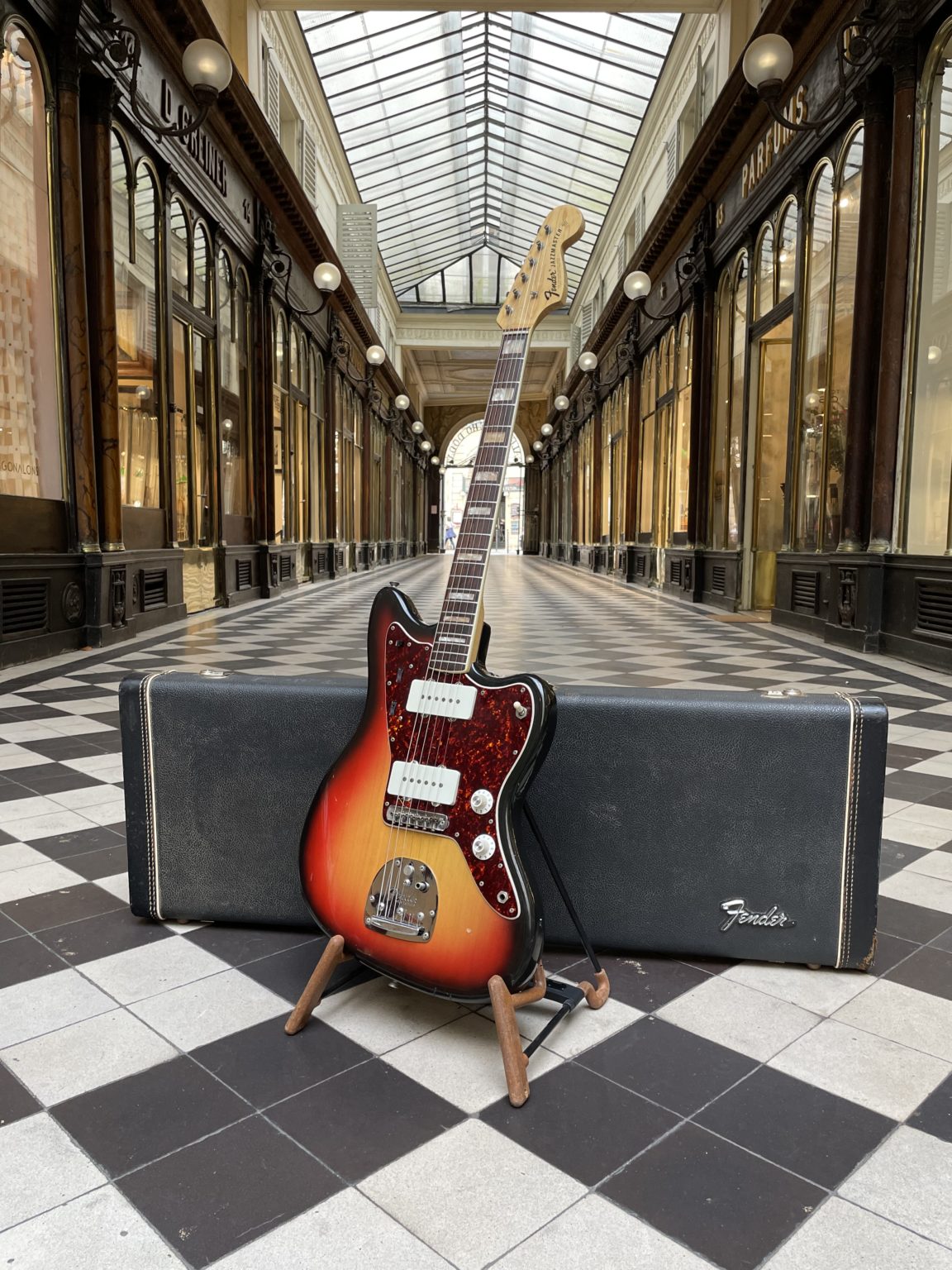 Here is a model that is very rare to come across: a Jazzmaster from the early 70s, resolutely from the CBS period, when these guitars had almost completely fallen into oblivion in the face of the hegemony of Stratocasters and Telecasters. The instrument as a whole is still very close to the version released in 1966 following the acquisition of Fender by the audiovisual conglomerate: the poly Sunburst finish has more gradient from one color to another compared to the Sunburst ” bullseye” from the mid 60s, the neck features a beautiful rosewood fingerboard and block style inlays. The pickguard, the F-stamped tuners and even the neck-mounting plate stamped with the F logo also conform to the style defined in 1966. The sound is not noticeably different from the 60s models – the Jazzmaster being made in very small quantities at this time, the pickups and many parts of the hardware are perfectly identical to those found on previous productions.