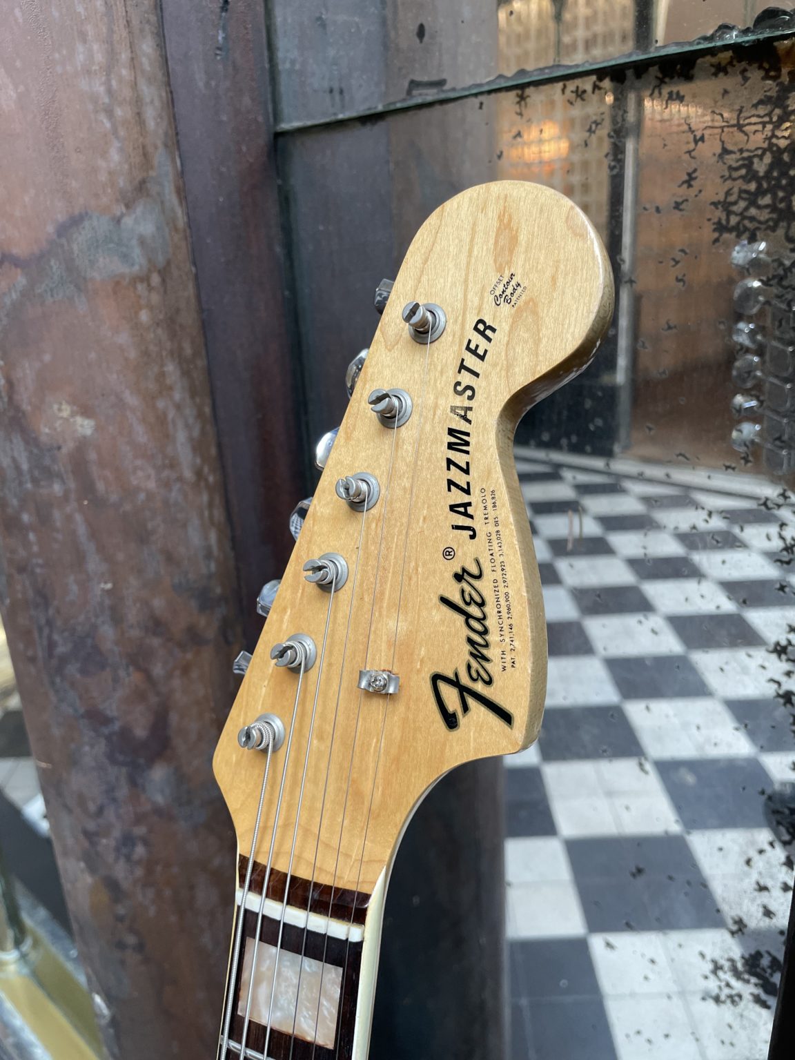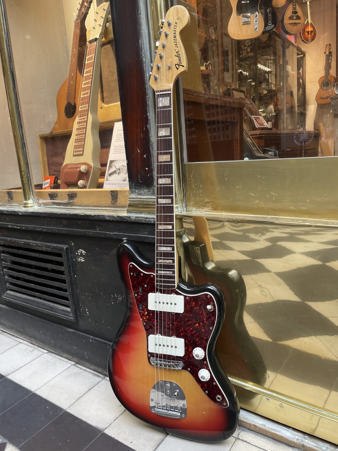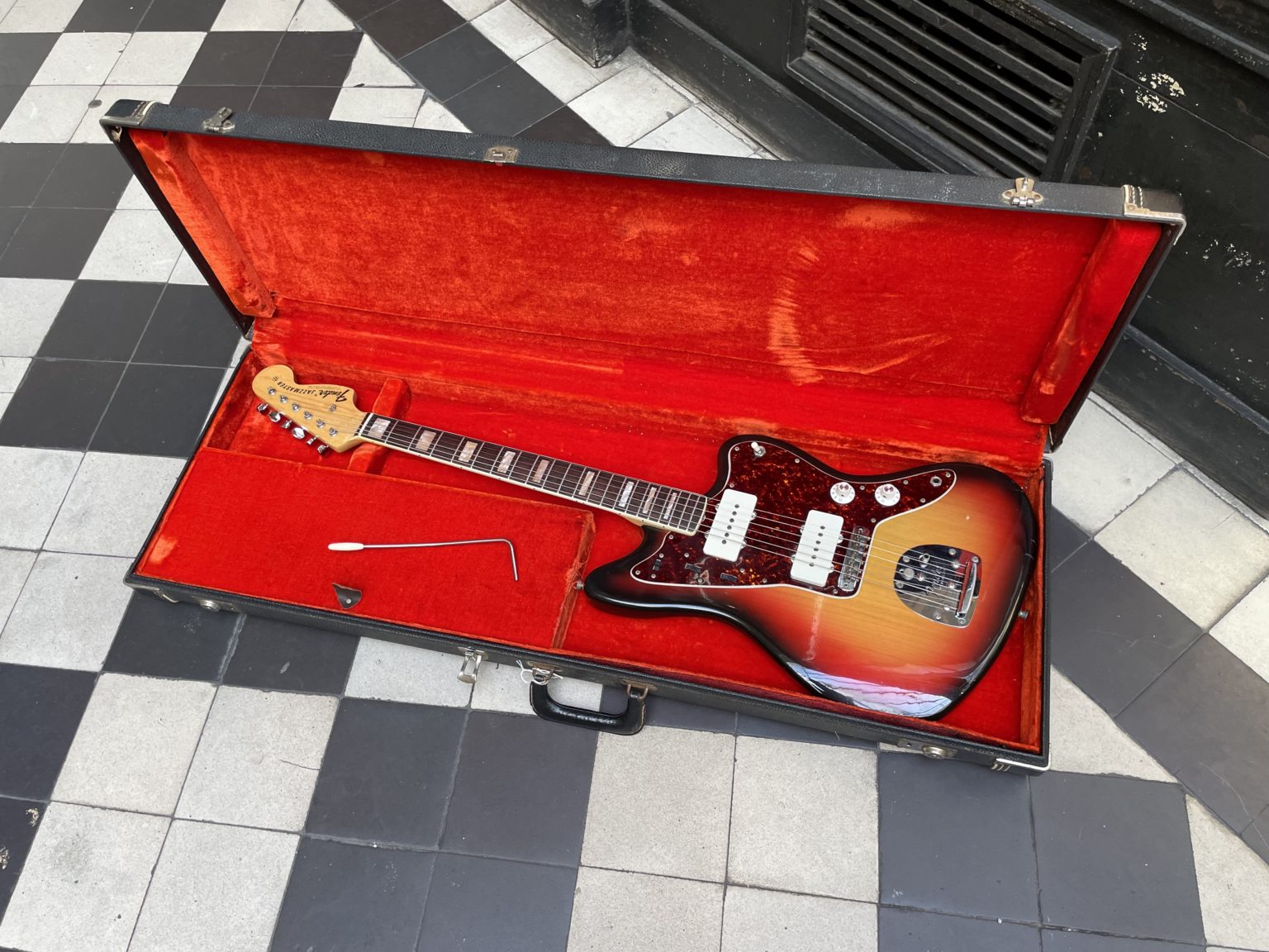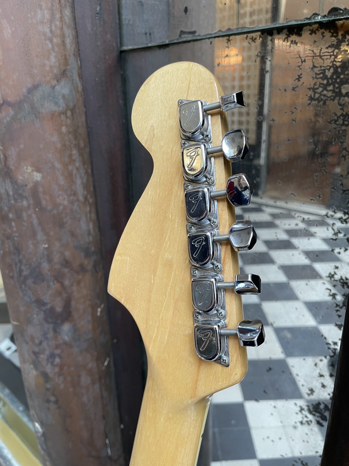 Here is a model that is very rare to come across: a Jazzmaster from the early 70s, resolutely from the CBS period, when these guitars had almost completely fallen into oblivion in the face of the hegemony of Stratocasters and Telecasters. The instrument as a whole is still very close to the version released in 1966 following the acquisition of Fender by the audiovisual conglomerate: the poly Sunburst finish has more gradient from one color to another compared to the Sunburst ” bullseye” from the mid 60s, the neck features a beautiful rosewood fingerboard and block style inlays. The pickguard, the F-stamped tuners and even the neck-mounting plate stamped with the F logo also conform to the style defined in 1966. The sound is not noticeably different from the 60s models – the Jazzmaster being made in very small quantities at this time, the pickups and many parts of the hardware are perfectly identical to those found on previous productions.
