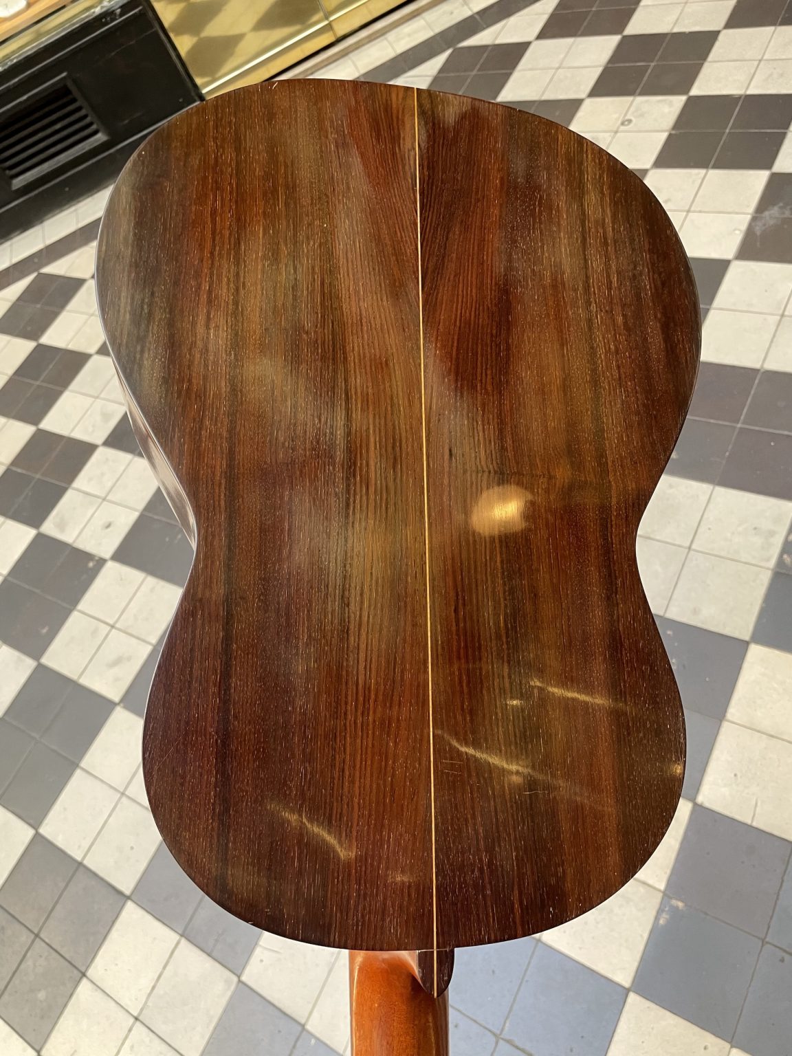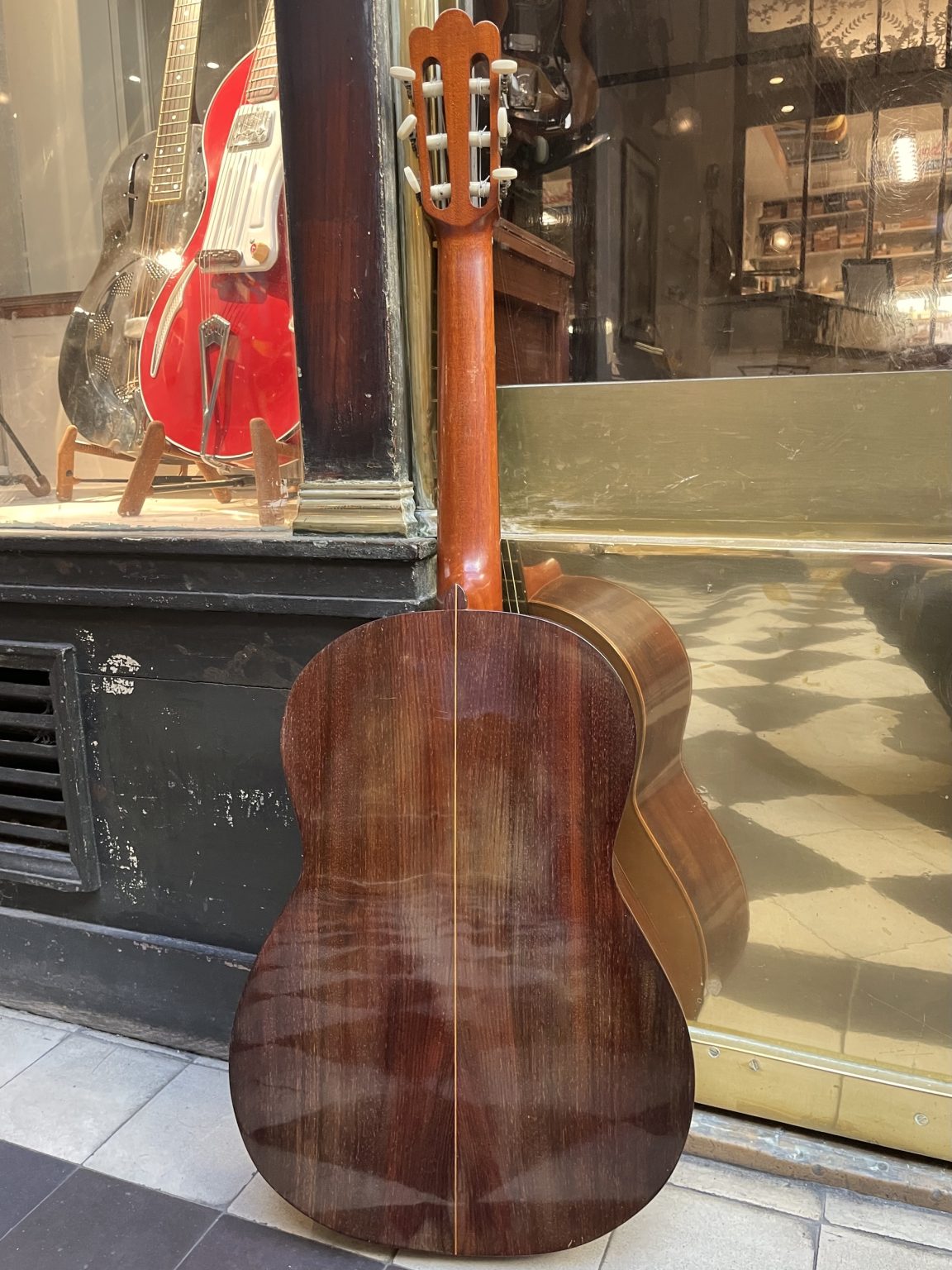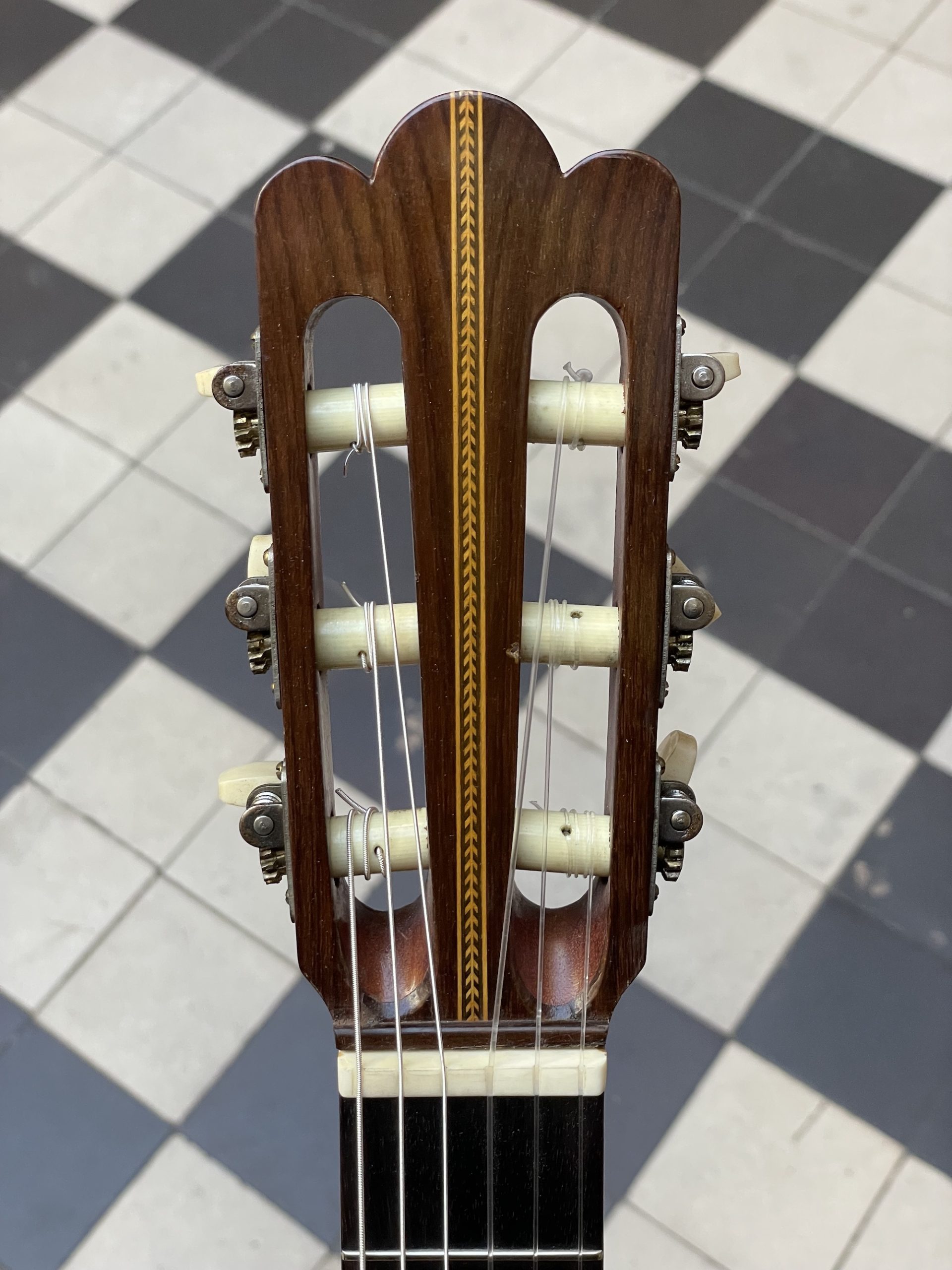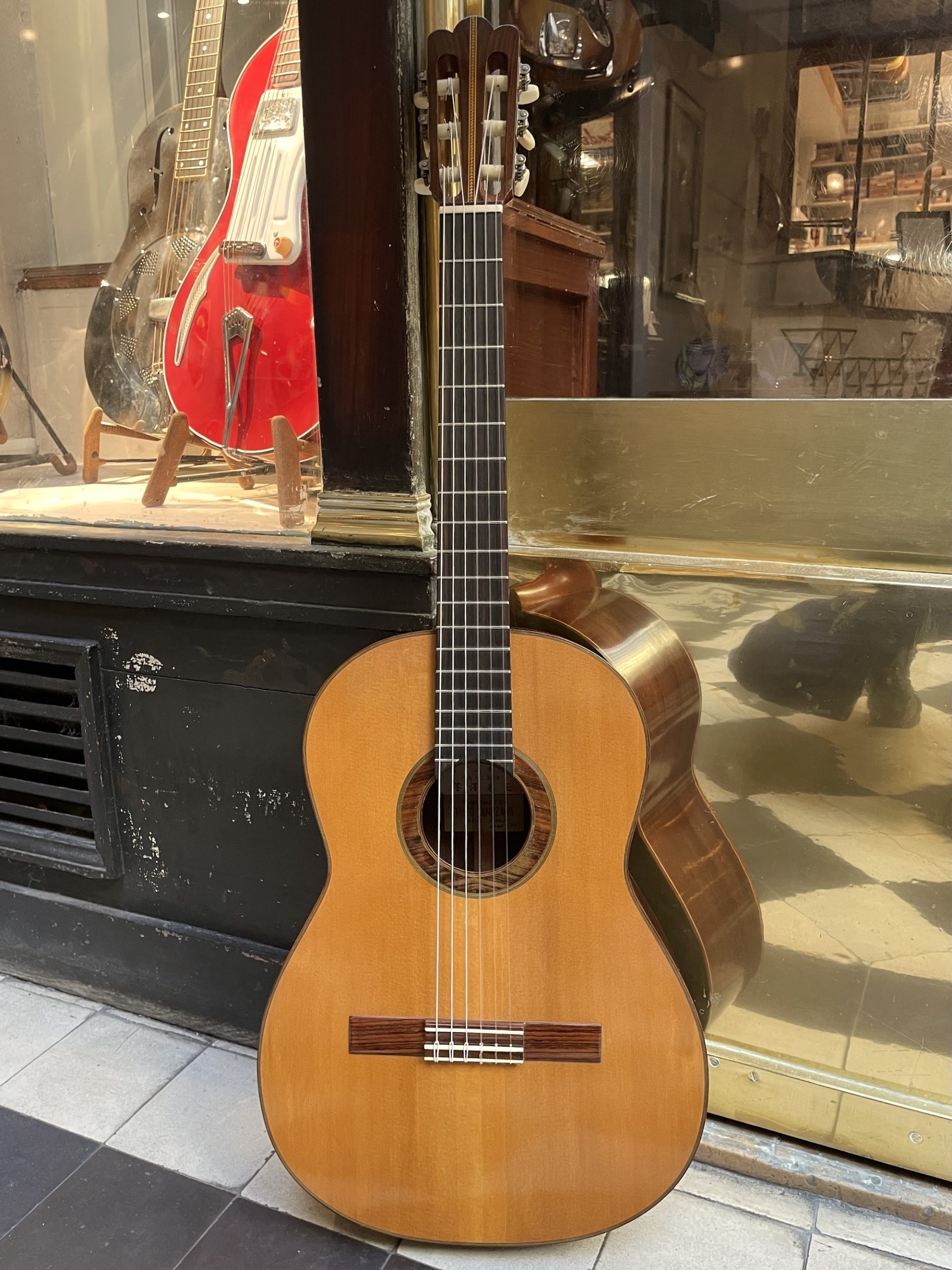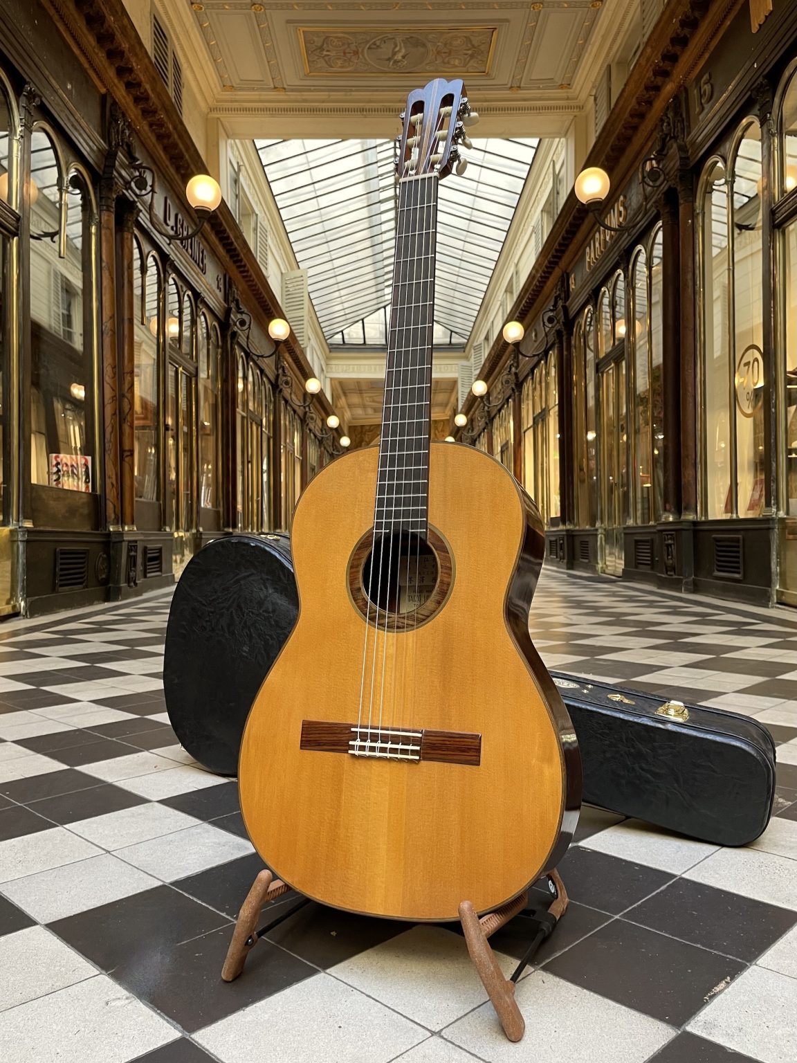 This elegant model is a rare example of the work of this Tokyo-based artisan, primarily renowned for his violins but also having made a few guitars from the late 1950s to the late 1960s. The appearance of this guitar is delicate and refined, entirely inspired by traditional Spanish guitars, resulting in a very lightweight instrument—notably, a trilobed headstock reminiscent of those once made by Torres; the decorative elements are discrete, with an elegant rosette featuring fine black and white binding interspersed with a wide rosewood band; the same fine binding is found around the edge of the soundboard; the headstock veneer is embellished with a herringbone-pattern strip; the wood selection is very fine: tight-grained spruce for the soundboard, beautifully figured Indian rosewood for the back and sides, and mahogany for the neck. Finished in a traditionally applied French polish.