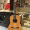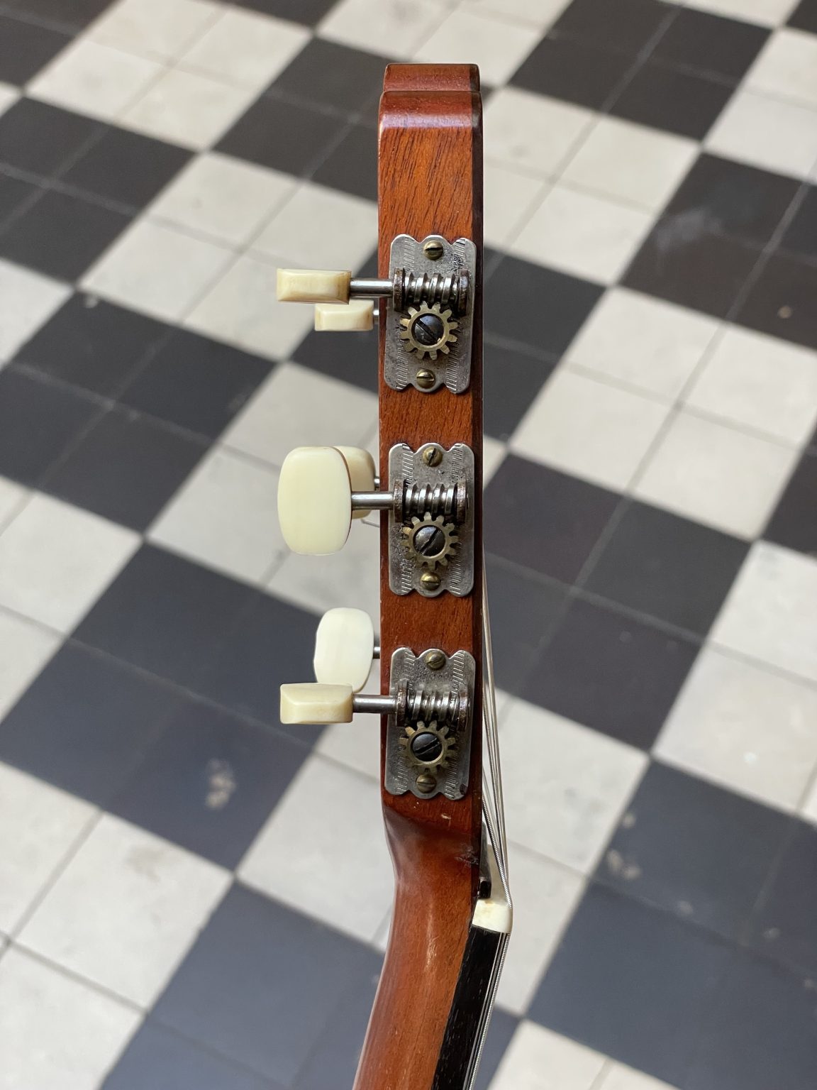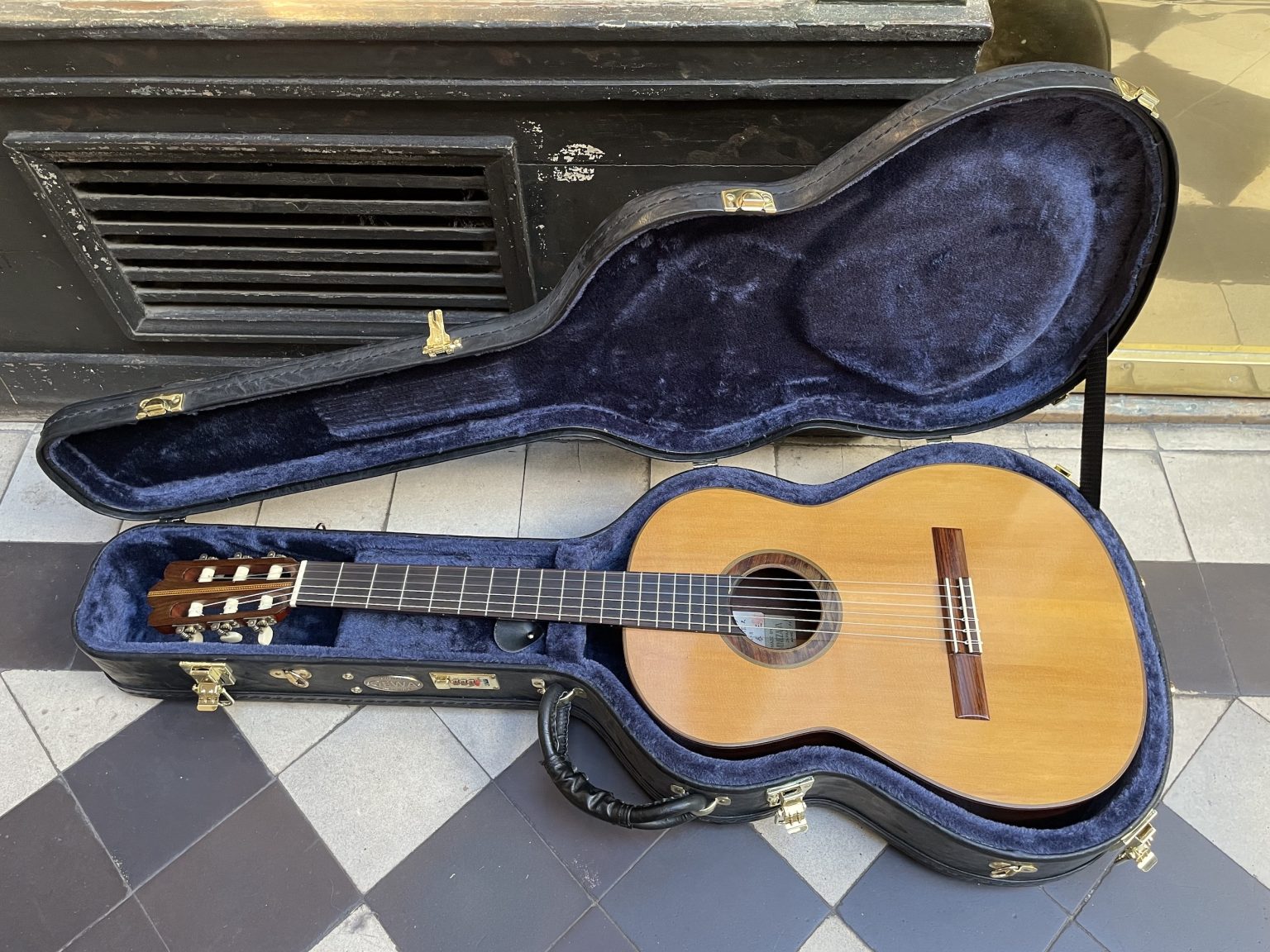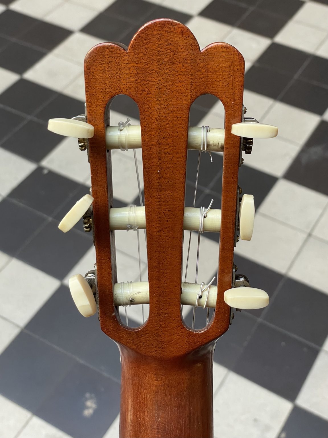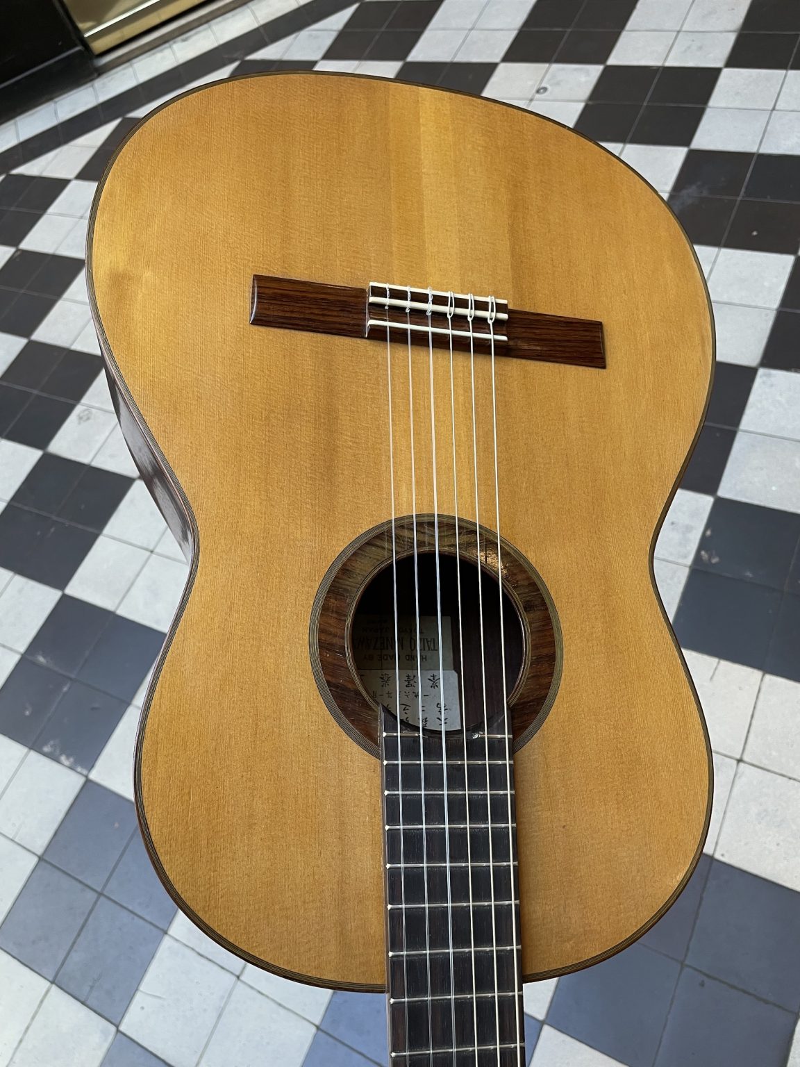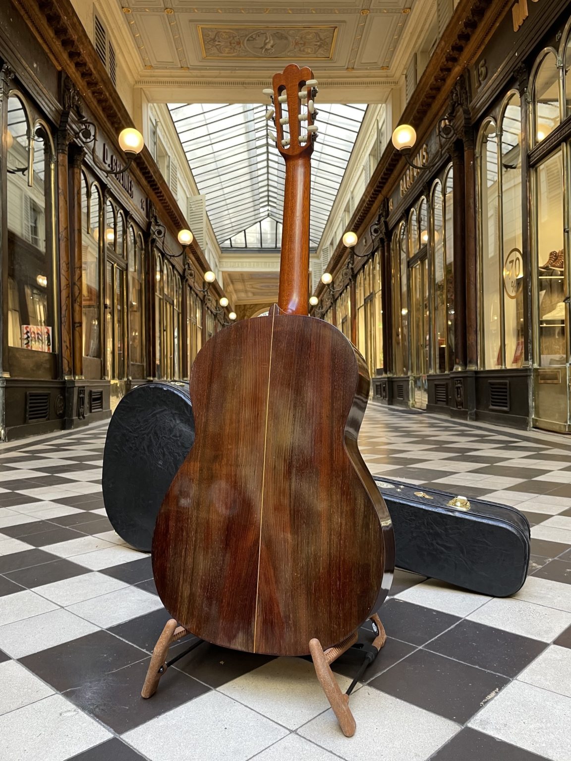 This elegant model is a rare example of the work of this Tokyo-based artisan, primarily renowned for his violins but also having made a few guitars from the late 1950s to the late 1960s. The appearance of this guitar is delicate and refined, entirely inspired by traditional Spanish guitars, resulting in a very lightweight instrument—notably, a trilobed headstock reminiscent of those once made by Torres; the decorative elements are discrete, with an elegant rosette featuring fine black and white binding interspersed with a wide rosewood band; the same fine binding is found around the edge of the soundboard; the headstock veneer is embellished with a herringbone-pattern strip; the wood selection is very fine: tight-grained spruce for the soundboard, beautifully figured Indian rosewood for the back and sides, and mahogany for the neck. Finished in a traditionally applied French polish.