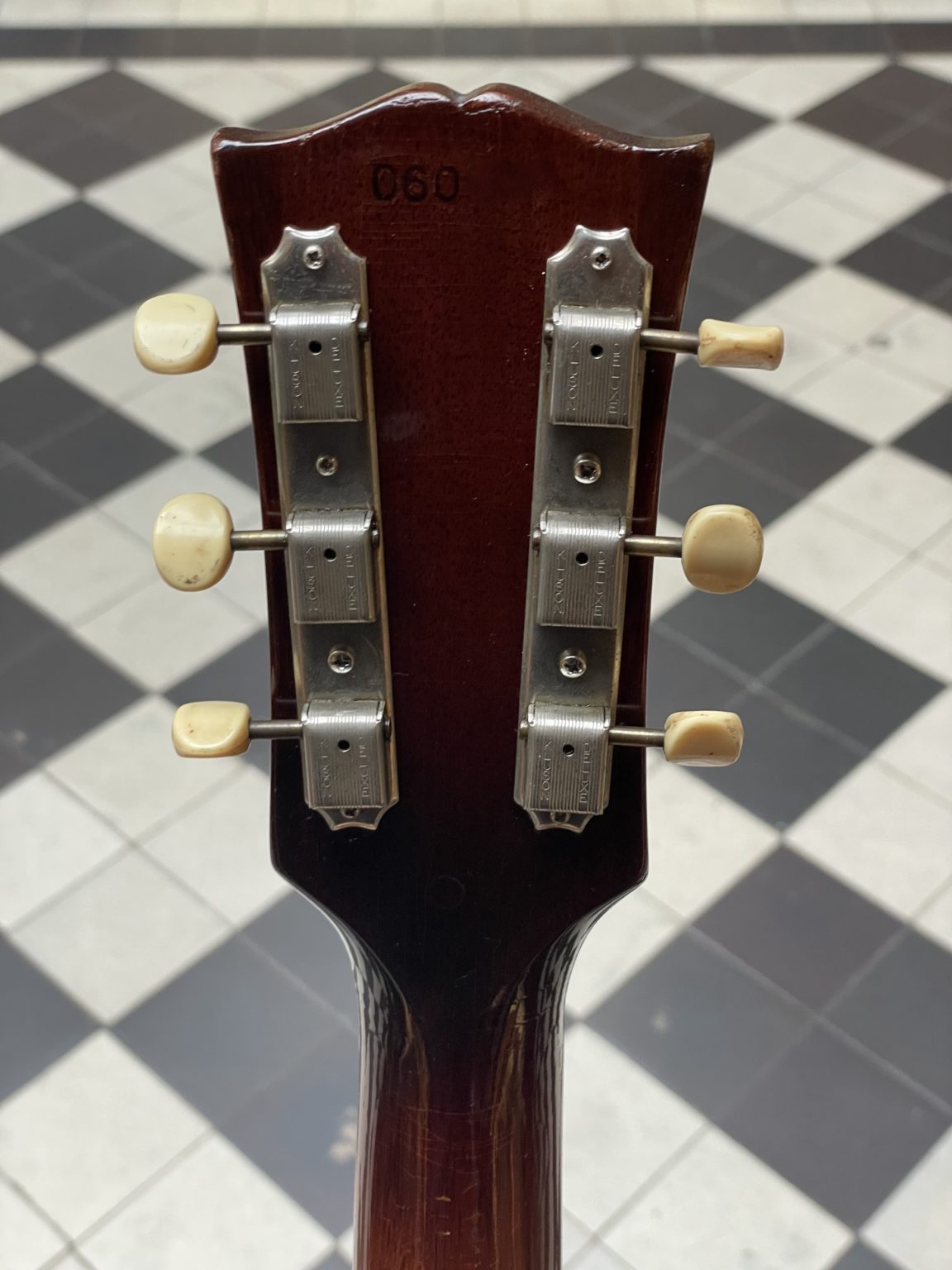 The guitar remains very well preserved to this day, with a beautiful patina related to its use. We note an older repair on the back of the headstock, discreet and stable to this day. With the exception of the pickguard, all of the hardware, the two P-90 pickups and the electronics are original, the instrument having retained all its integrity over the last 6 decades! We have put in all of the necessary work to restore this guitar to full, comfortable playability, including a full levelling of the frets, adjustment of the action and intonation at the nut and bridge, and cleaning of the electronics.