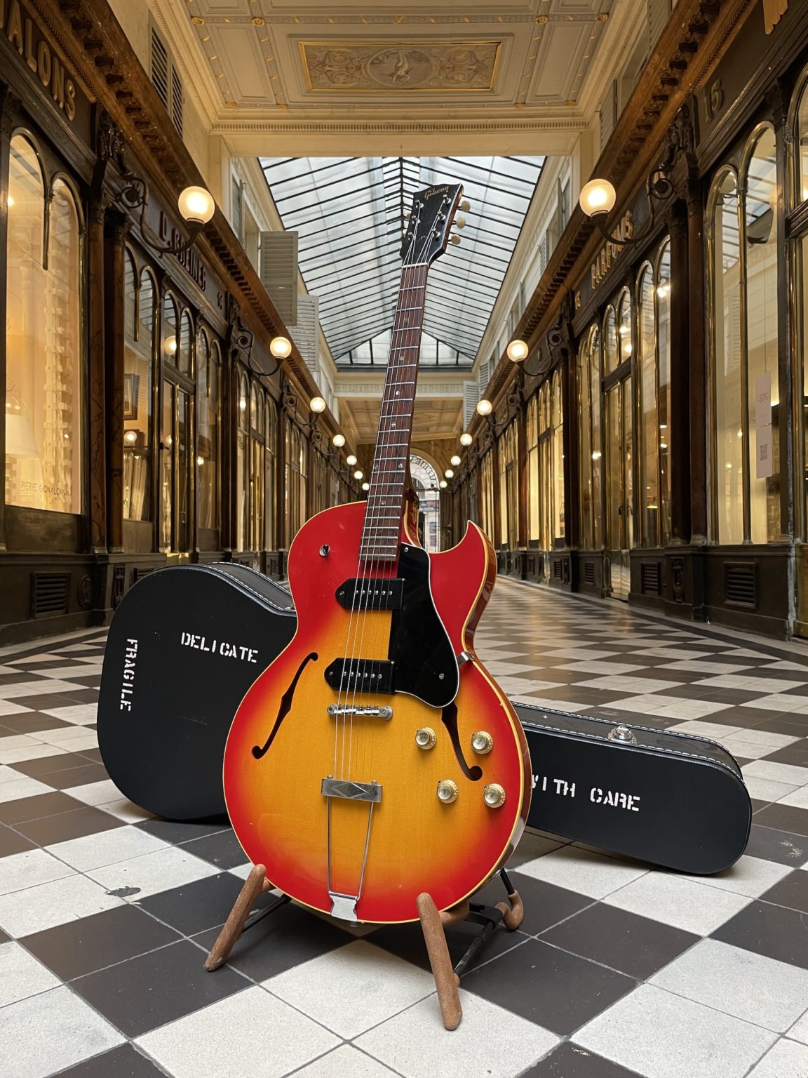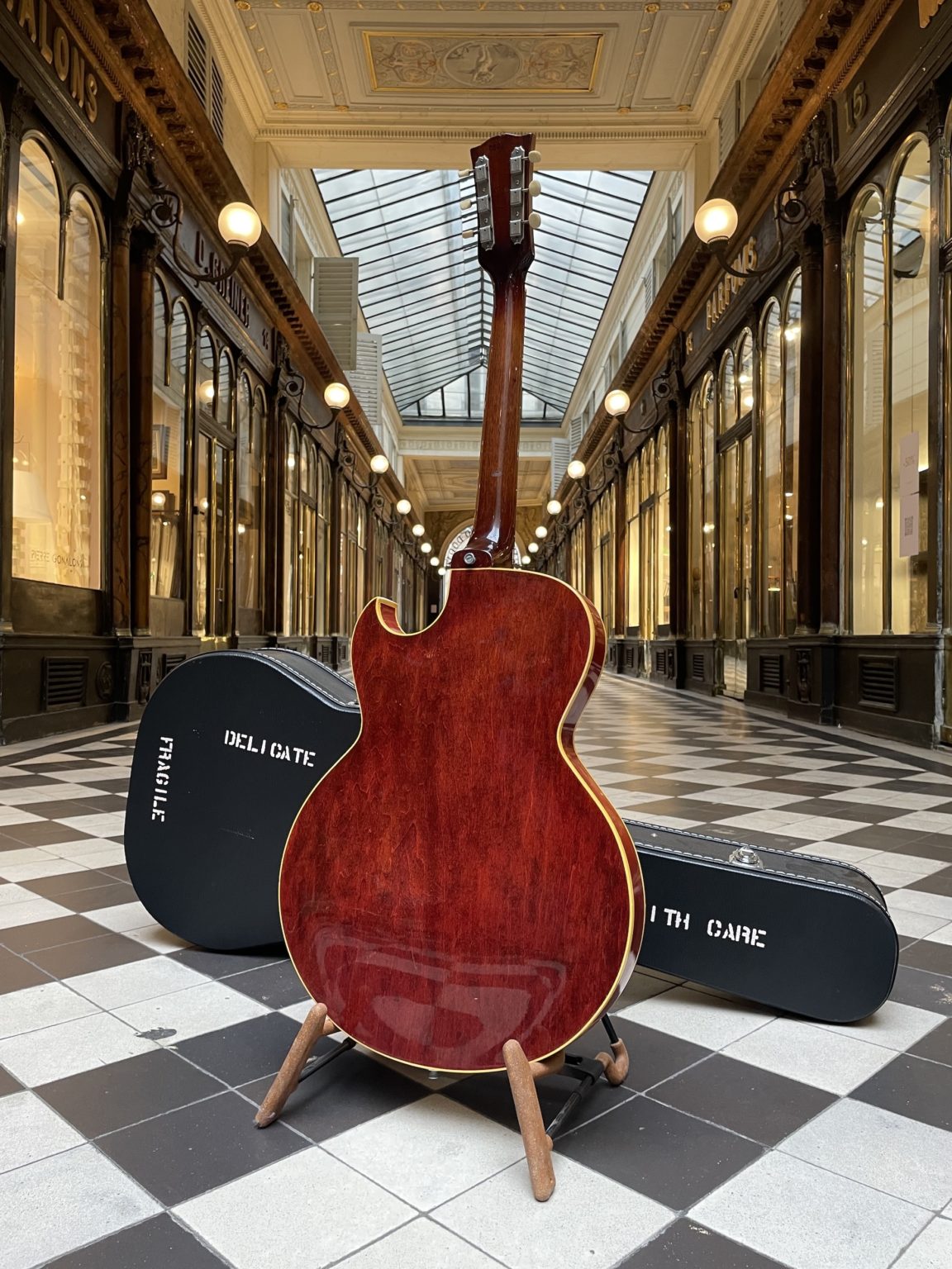Here is a beautiful example built rather late in the production period of this model, which spanned from 1960 to 1970. The 125TDC represents at the time the most popular ($60 cheaper than an ES-330 for similar qualities!) and the most versatile of the thinline-hollowbody single-cutaway guitars made in Kalamazoo. We find on this ES-125TDC all of the typical characteristics of the period, namely two single-coil P-90 pickups, a beautiful Cherry Sunburst finish on the top and a thin and comfortable neck. An unusual detail on this guitar is its original Tune-o-Matic bridge mounted onto posts screwed directly into the top, the same way as on an ES-330 – earlier examples of this model still used the traditional wooden bridge, so it is interesting to see a rather high-end feature such as the Tune-o-Matic bridge being adapted to the modest 125!