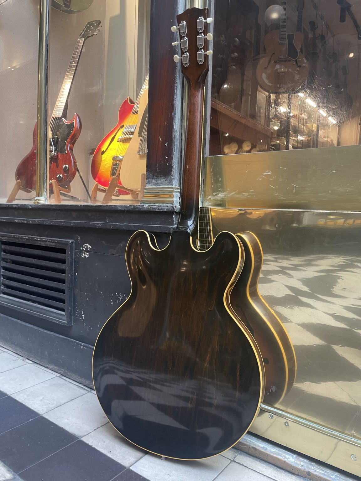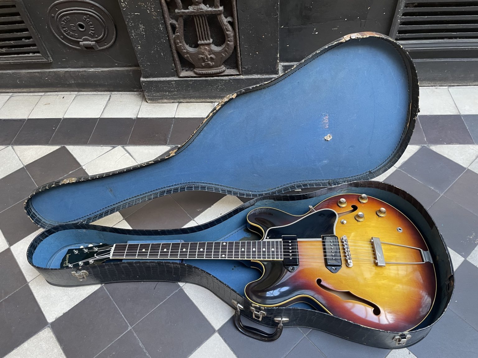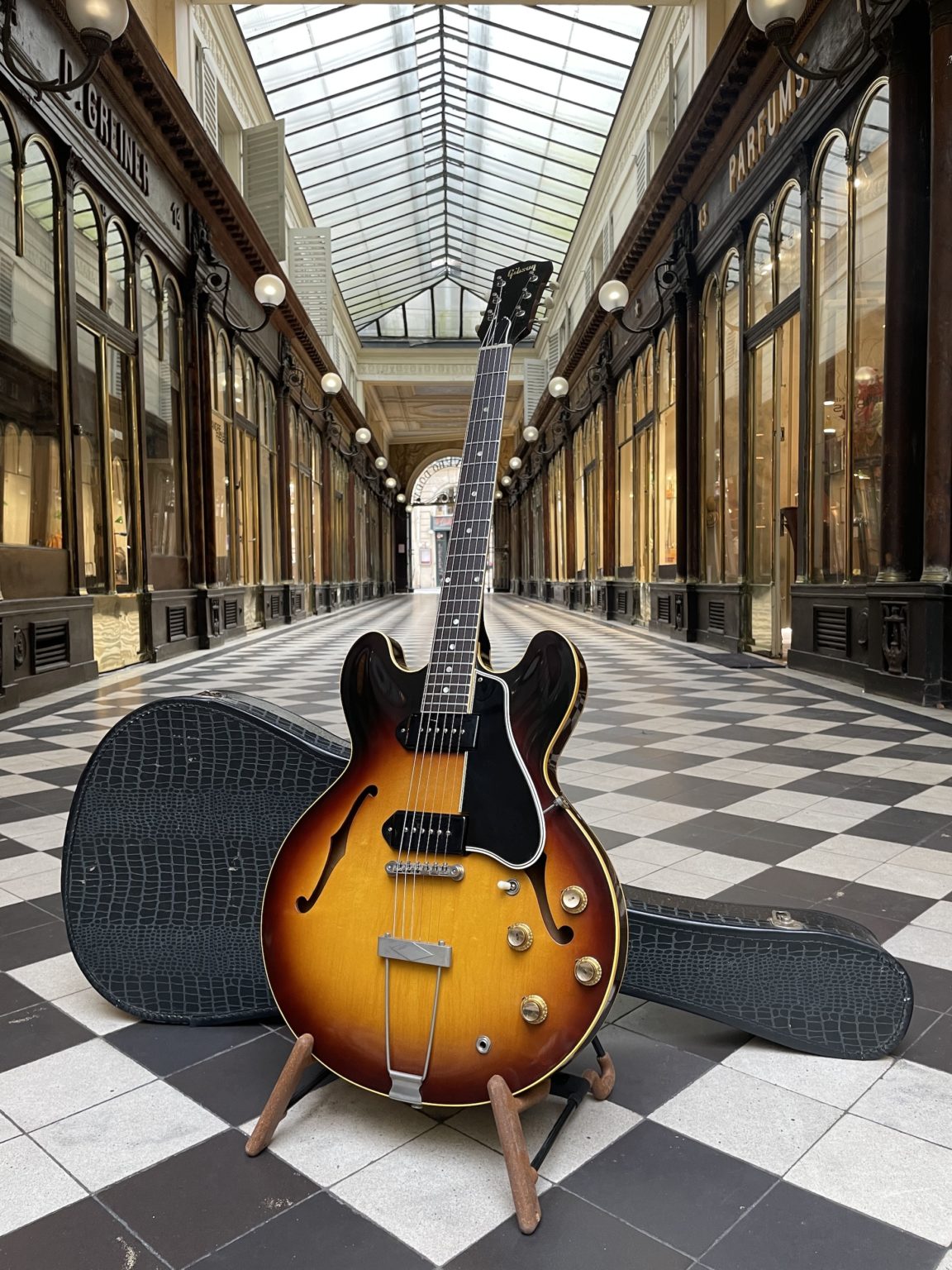 In 1961, only 542 of these two-pickup sunburst models left the Kalamazoo factory, for a price of $250 (the case was an extra, $13.25 for a basic cardboard case like the one given to this guitar). This figure of 542 represents a drop by half of shipments compared to the previous year, mainly due to the introduction of a new finish option, Cherry Red, which quickly became the most popular color for the entire ES-3XX range. The ES-330TD was in any case a greatly successful model, as evidenced by its production period spanning until the early 1970s – a longevity record for a Gibson hollowbody equipped with P-90s! All this for good reason: although grouped together with the 335, 345 and 355, all thinline models, the 330 is in fact a very different instrument: the body is entirely hollow, without the central block present on the other models, this which makes it significantly lighter and more resonant. This also led to another distinctive feature of the ES-330, that the neck-body junction is located at the 16th fret instead of the 19th in order to reinforce the joint, which necessarily influences the sensation when playing. The neck profile on this guitar is typical of the early 60s, thinner and flatter, a characteristic specific to this period. The headstock only has a simple Gibson logo inlaid in pearl, without any further decoration, the tuners are the original Kluson Deluxe with their round plastic buttons. Finally, we find the standard wiring with a 3-position pickup selector and a volume and tone control for each pickup. All of the electronics are original, perfectly unaltered over the 60 years of the guitar’s existence, as is all of the hardware. The Sunburst finish is superbly preserved, the varnish has barely detectable crackling, and more than minimal wear to the back of the neck. The condition of the guitar is nothing short of exceptional – so much so that no one has even attached a strap button to the heel of the neck! As soon as we plug it into to an amp, we immediately find all the raw sounds of the two P-90s which made the model a true icon in the 60s, alongside its twin produced by Epiphone, the Casino, in the hands of a Beatle or a Rolling Stone, a Chuck Berry or a young B.B. King – they’ve all been there!