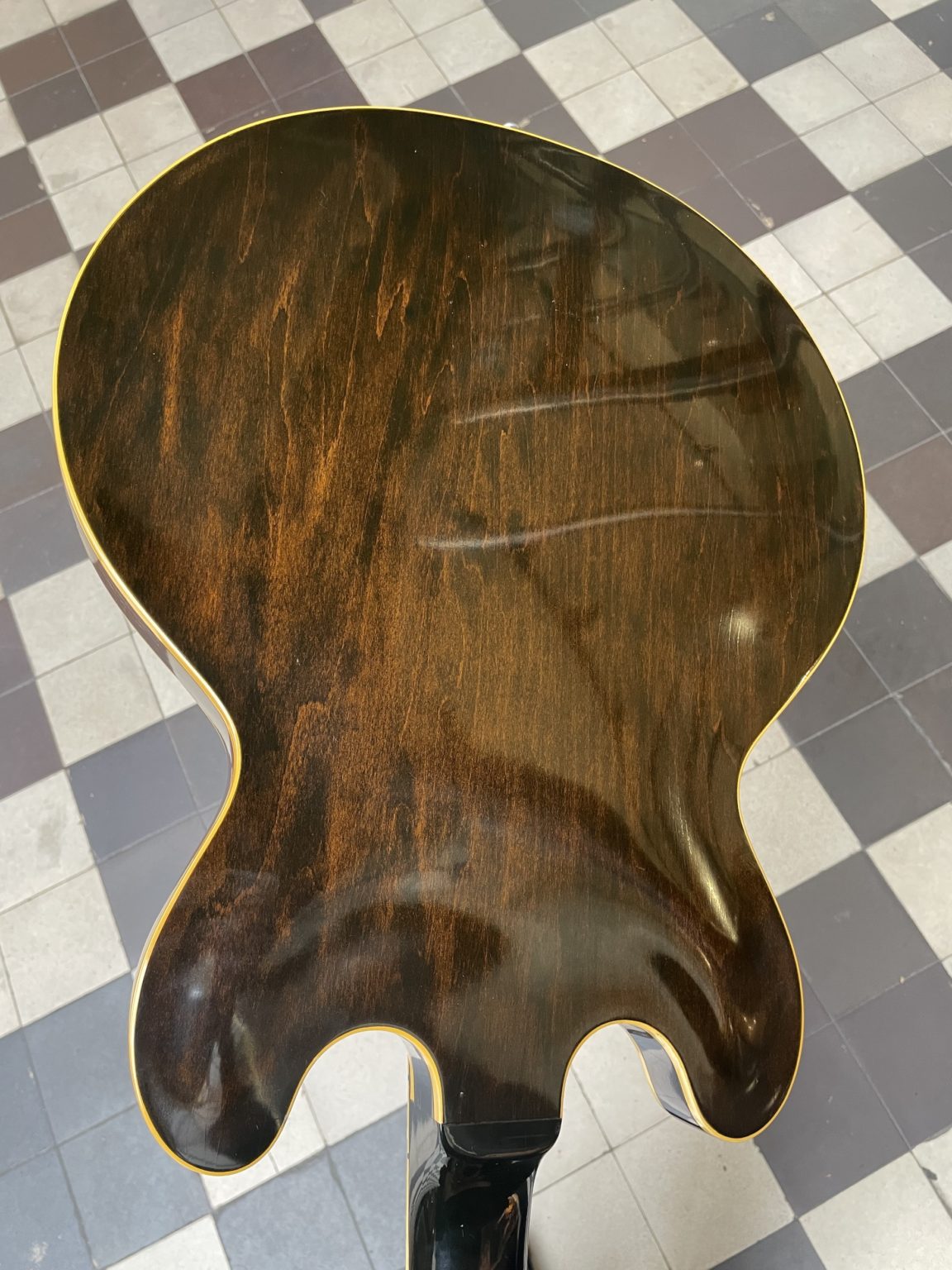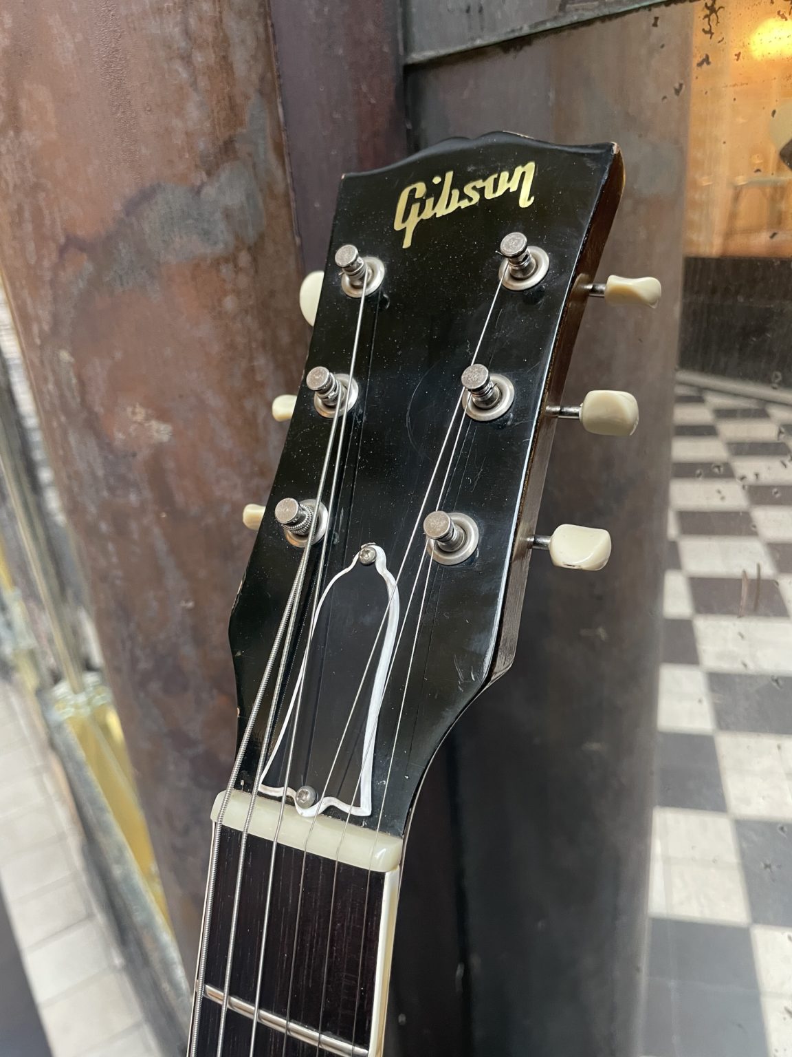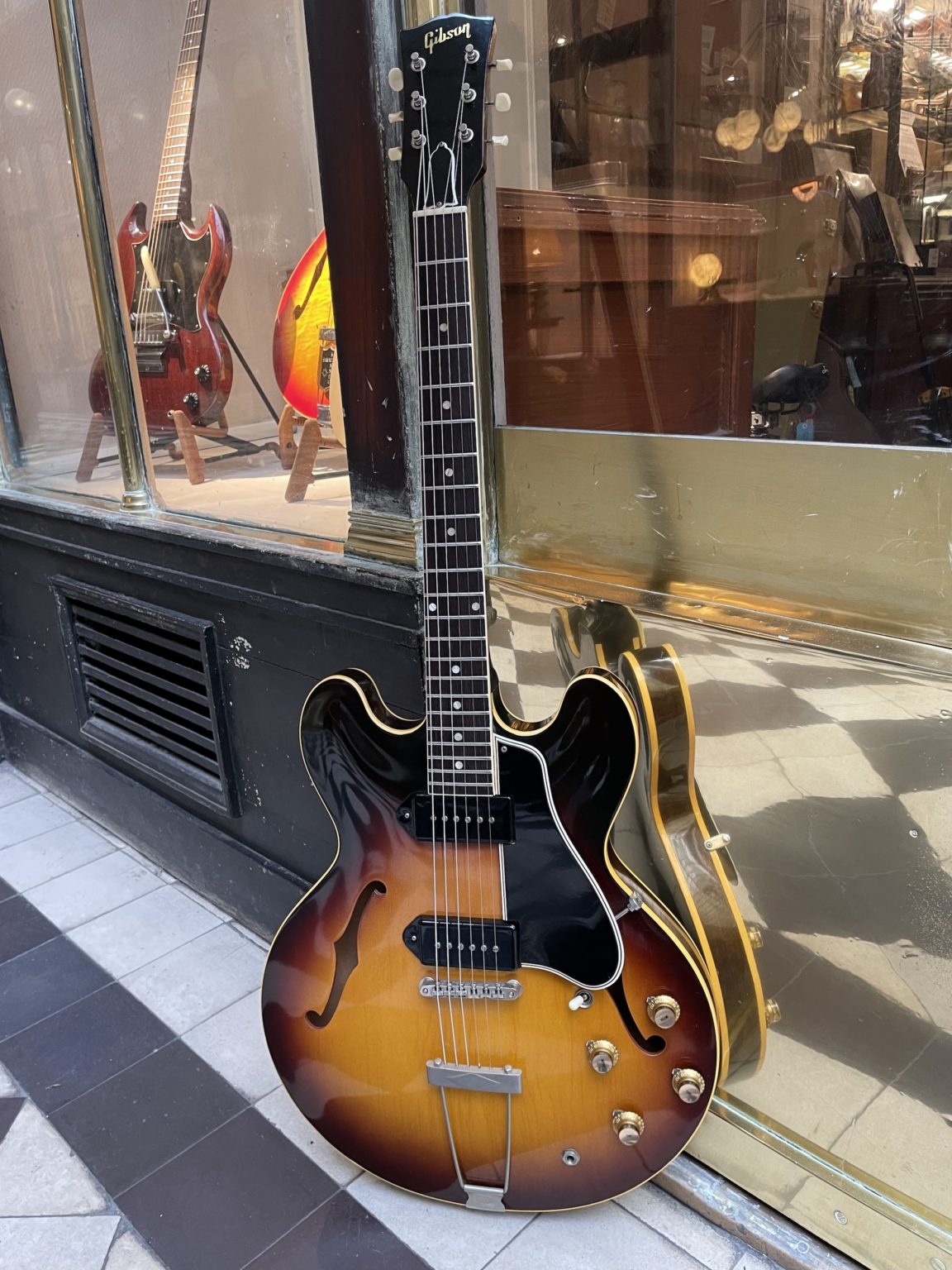 In 1961, only 542 of these two-pickup sunburst models left the Kalamazoo factory, for a price of $250 (the case was an extra, $13.25 for a basic cardboard case like the one given to this guitar). This figure of 542 represents a drop by half of shipments compared to the previous year, mainly due to the introduction of a new finish option, Cherry Red, which quickly became the most popular color for the entire ES-3XX range. The ES-330TD was in any case a greatly successful model, as evidenced by its production period spanning until the early 1970s – a longevity record for a Gibson hollowbody equipped with P-90s! All this for good reason: although grouped together with the 335, 345 and 355, all thinline models, the 330 is in fact a very different instrument: the body is entirely hollow, without the central block present on the other models, this which makes it significantly lighter and more resonant. This also led to another distinctive feature of the ES-330, that the neck-body junction is located at the 16th fret instead of the 19th in order to reinforce the joint, which necessarily influences the sensation when playing. The neck profile on this guitar is typical of the early 60s, thinner and flatter, a characteristic specific to this period. The headstock only has a simple Gibson logo inlaid in pearl, without any further decoration, the tuners are the original Kluson Deluxe with their round plastic buttons. Finally, we find the standard wiring with a 3-position pickup selector and a volume and tone control for each pickup. All of the electronics are original, perfectly unaltered over the 60 years of the guitar’s existence, as is all of the hardware. The Sunburst finish is superbly preserved, the varnish has barely detectable crackling, and more than minimal wear to the back of the neck. The condition of the guitar is nothing short of exceptional – so much so that no one has even attached a strap button to the heel of the neck! As soon as we plug it into to an amp, we immediately find all the raw sounds of the two P-90s which made the model a true icon in the 60s, alongside its twin produced by Epiphone, the Casino, in the hands of a Beatle or a Rolling Stone, a Chuck Berry or a young B.B. King – they’ve all been there!