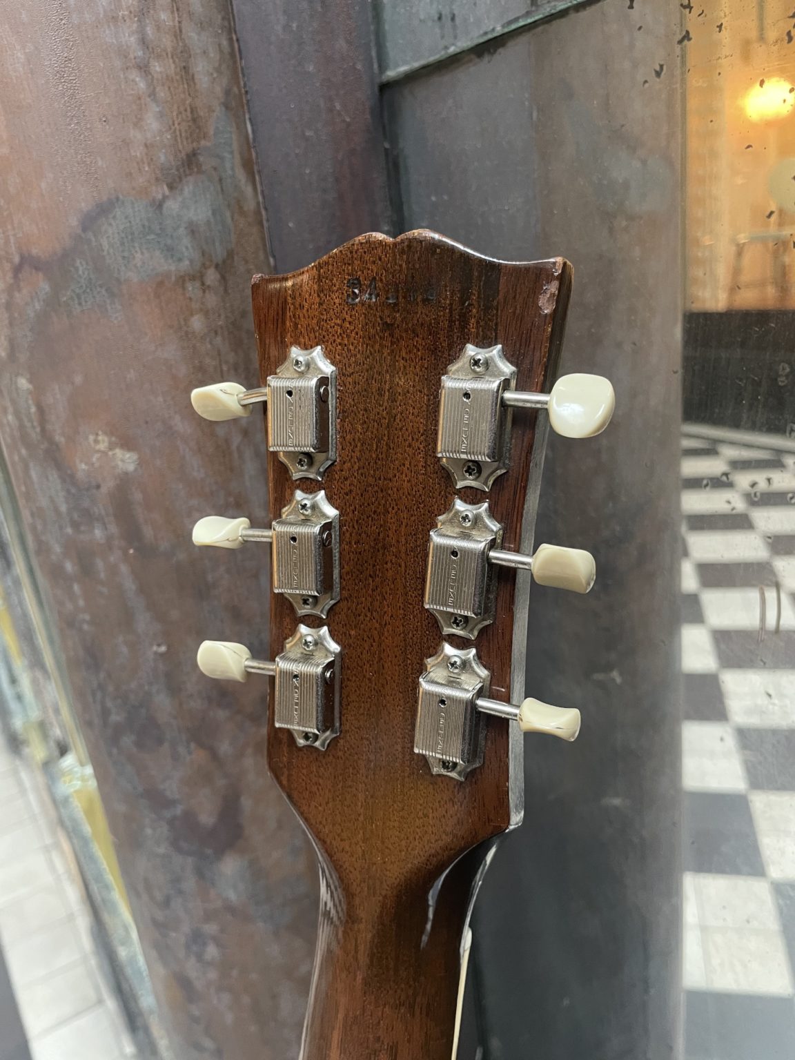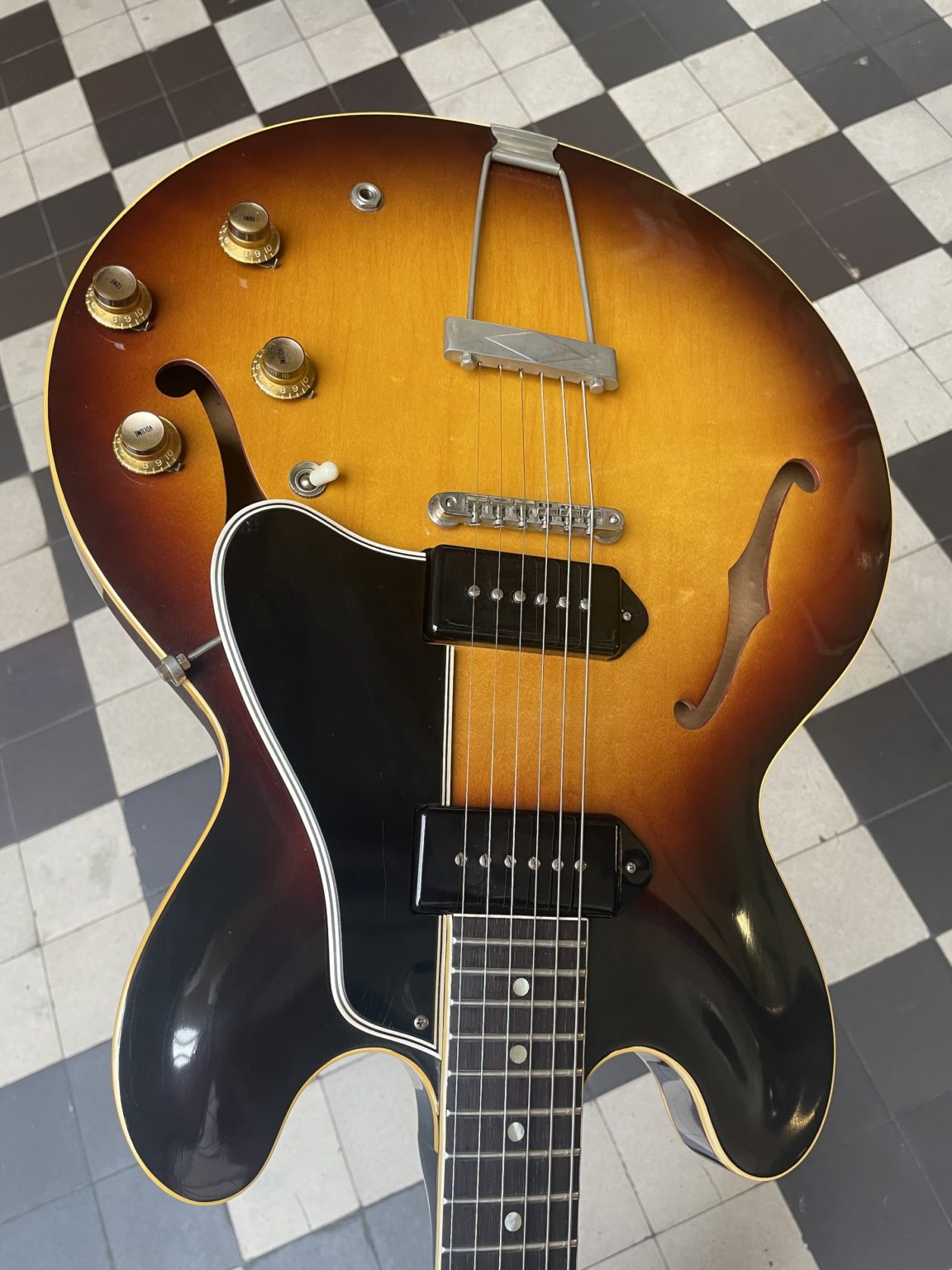 The example presented here comes from the first generation running from 1959 to 1962, more precisely from the second year of complete production (the ES-330TD appeared in the Gibson catalog in 1960). It condenses all of the model’s original features, which include a rosewood fingerboard with dot inlays, the rounded double cutaway that earned the body the nickname of “Mickey Mouse”, and its two original P-90 pickups with their black plastic covers (these will be replaced the following year by metallic covers). The dark sunburst still has the taste of the 1950s, and the serial number printed on the back of the headstock remains below 40,000, indicating the first months of use of the new serialisation system initiated by Gibson between February and March of the same year.