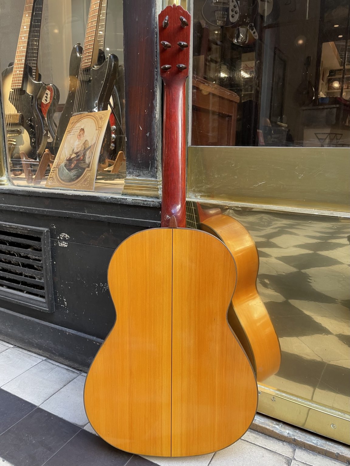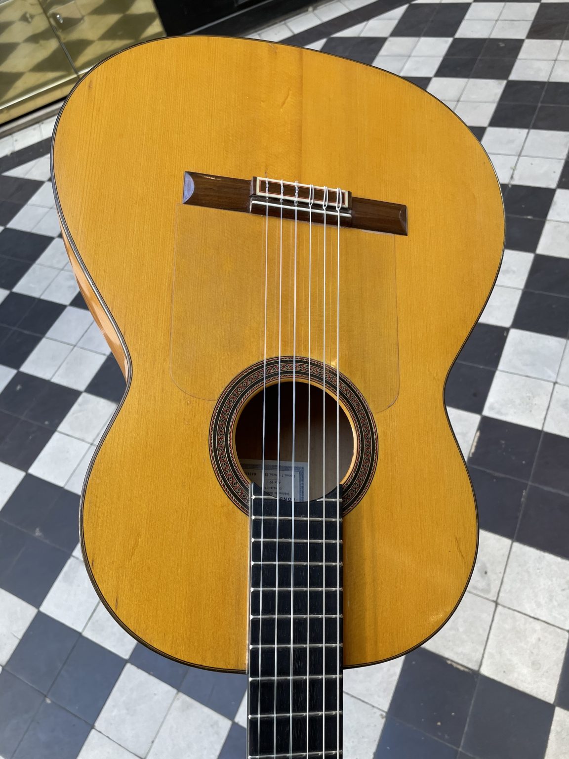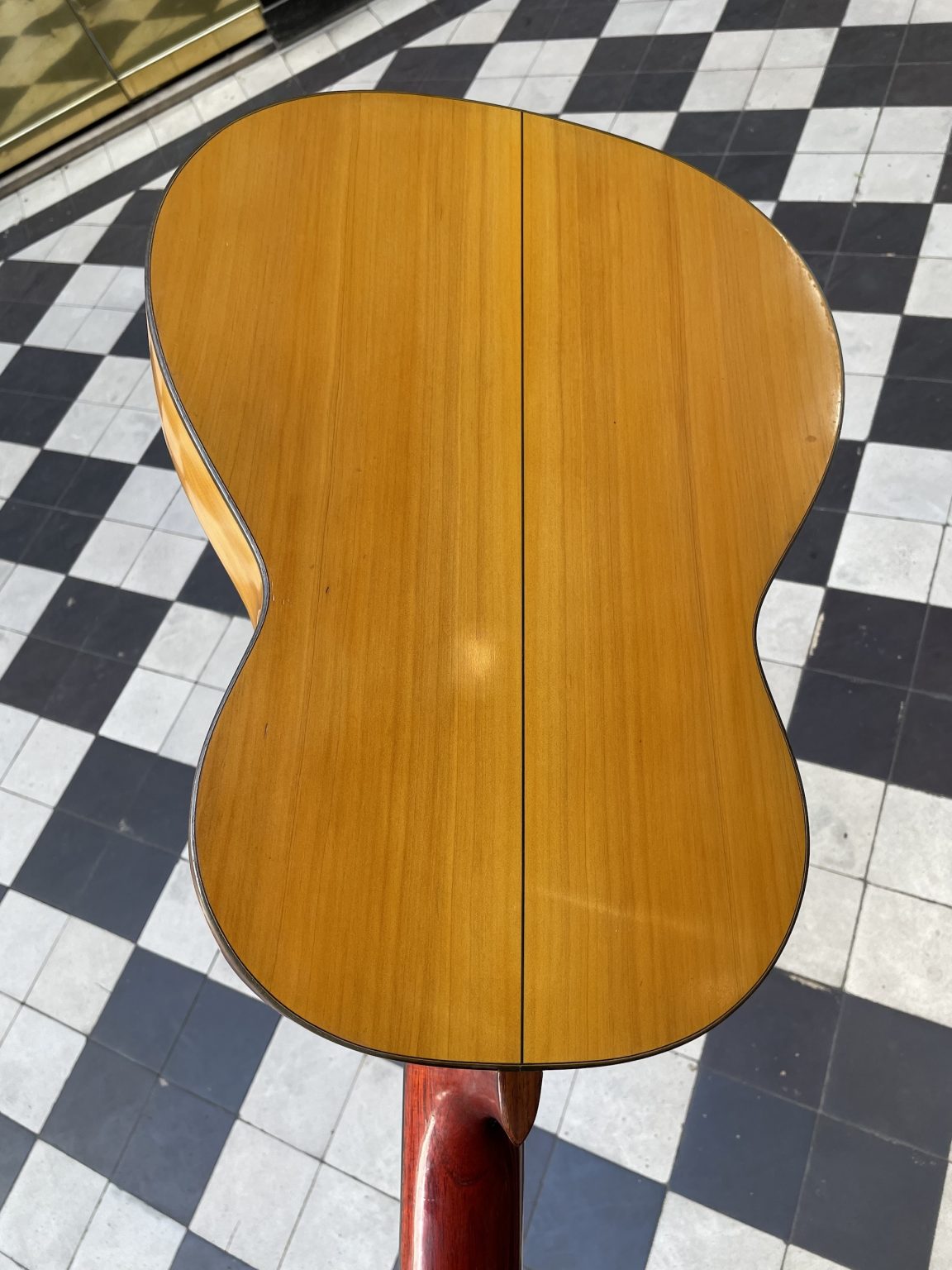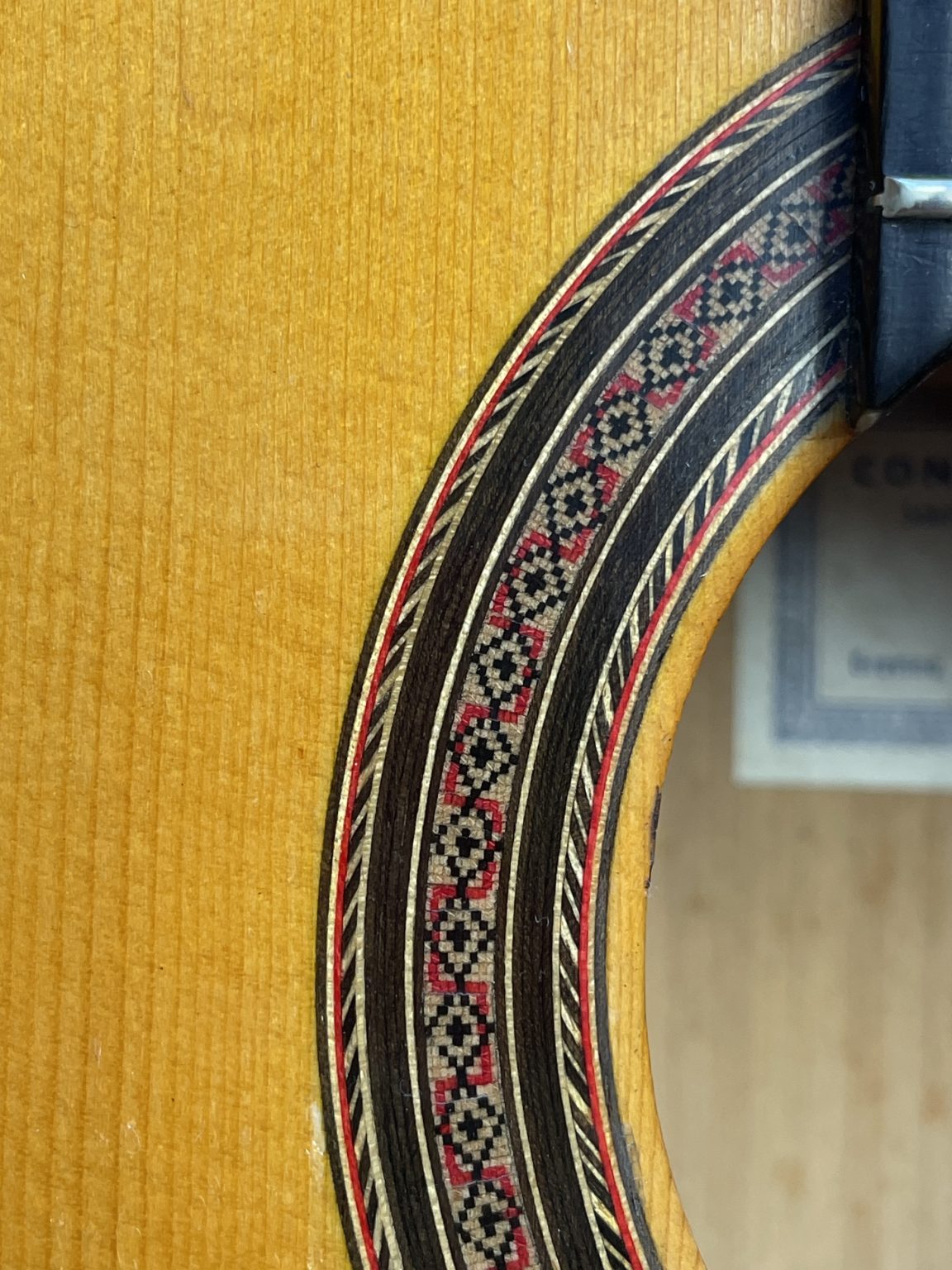 This guitar remains, fifty-five years after its construction, in excellent condition. The soundboard is free of cracks or repairs, and the instrument shows only minor playing wear. A double golpeador was installed on the soundboard for flamenco playing. We have thoroughly set up this guitar in our workshop, including fret levelling and polishing, action and intonation adjustment at the nut and bridge saddle, tuning pegs greased and fitted, and string st up, to ensure the perfect playing condition of the instrument.