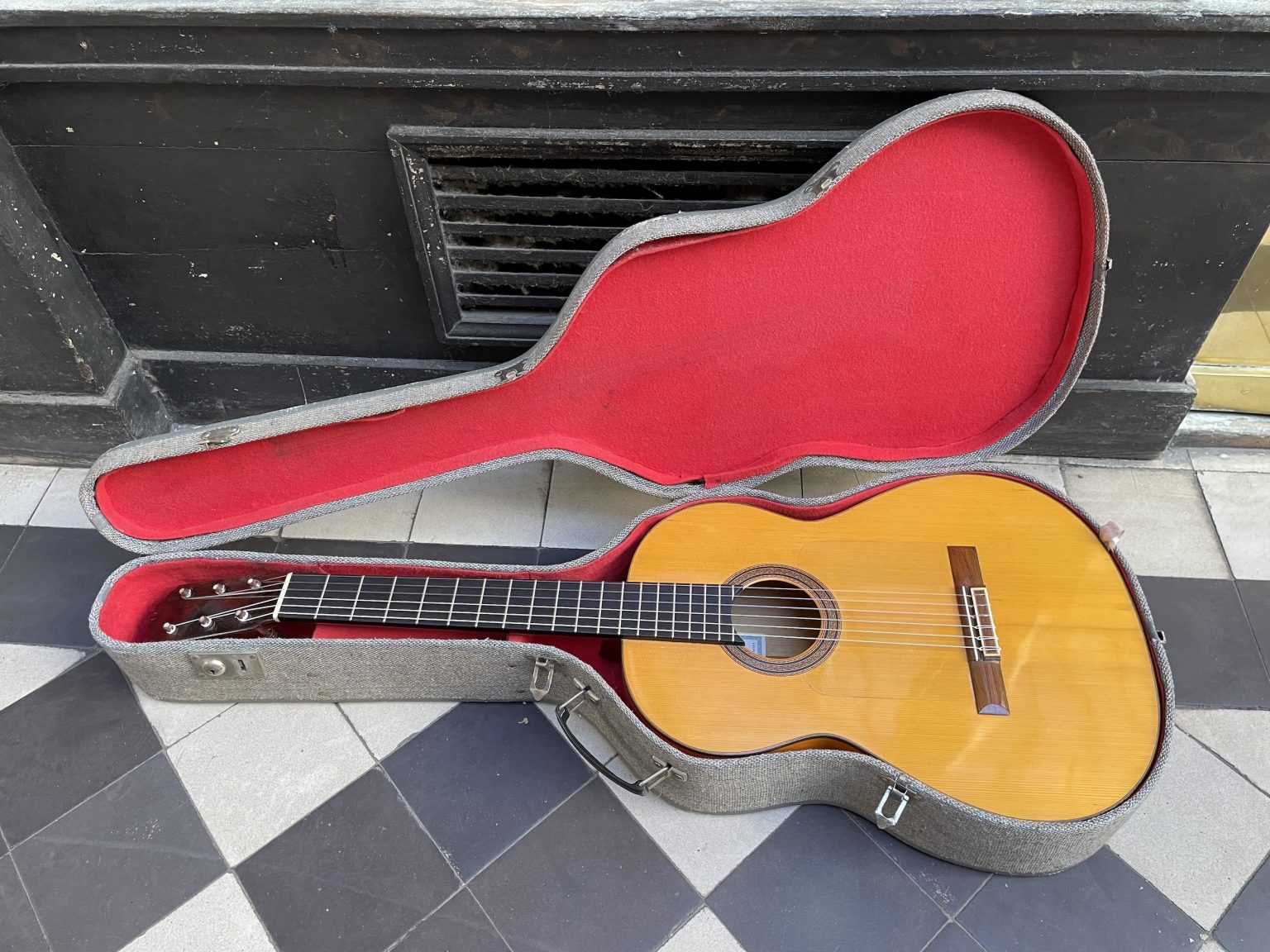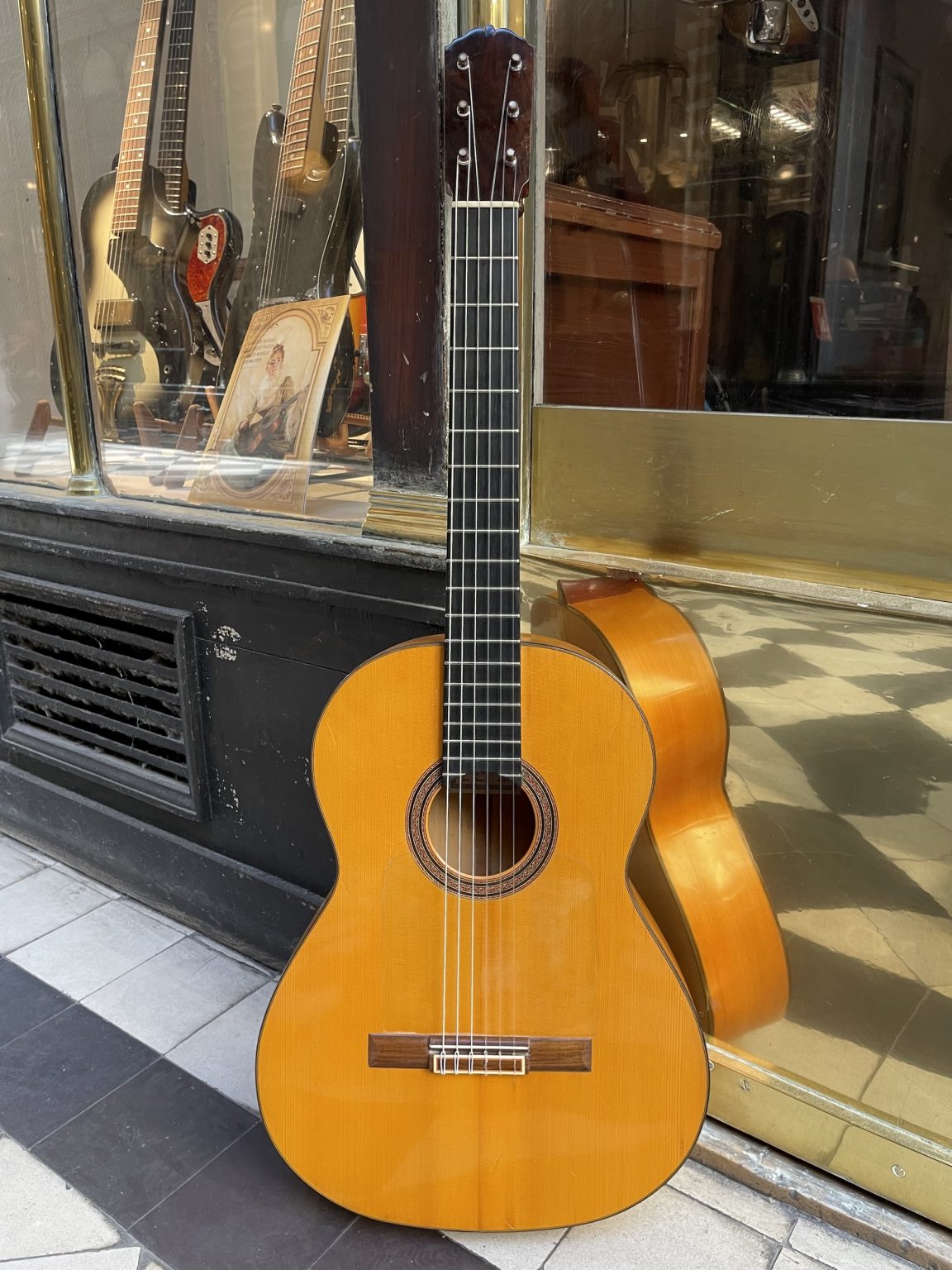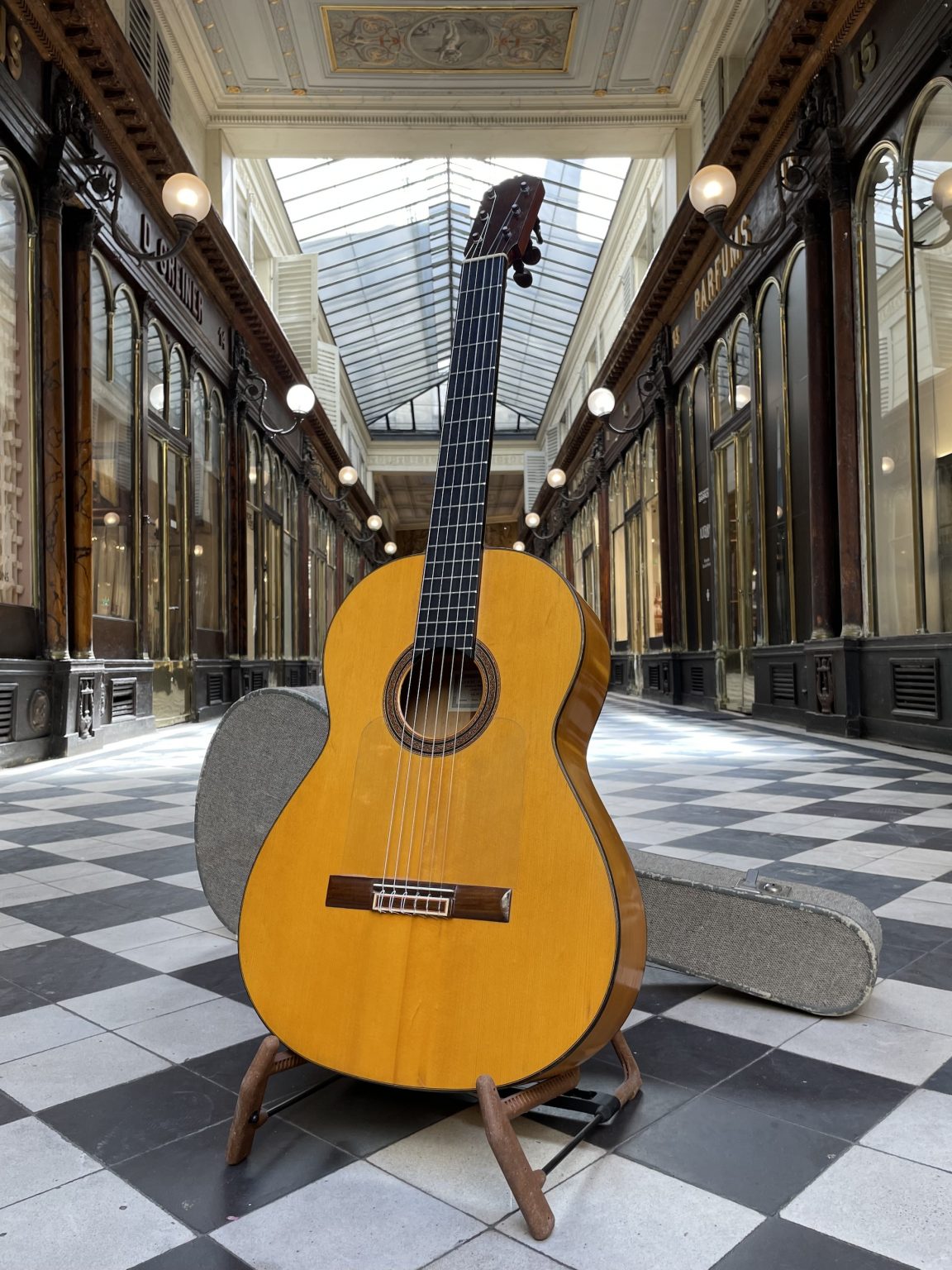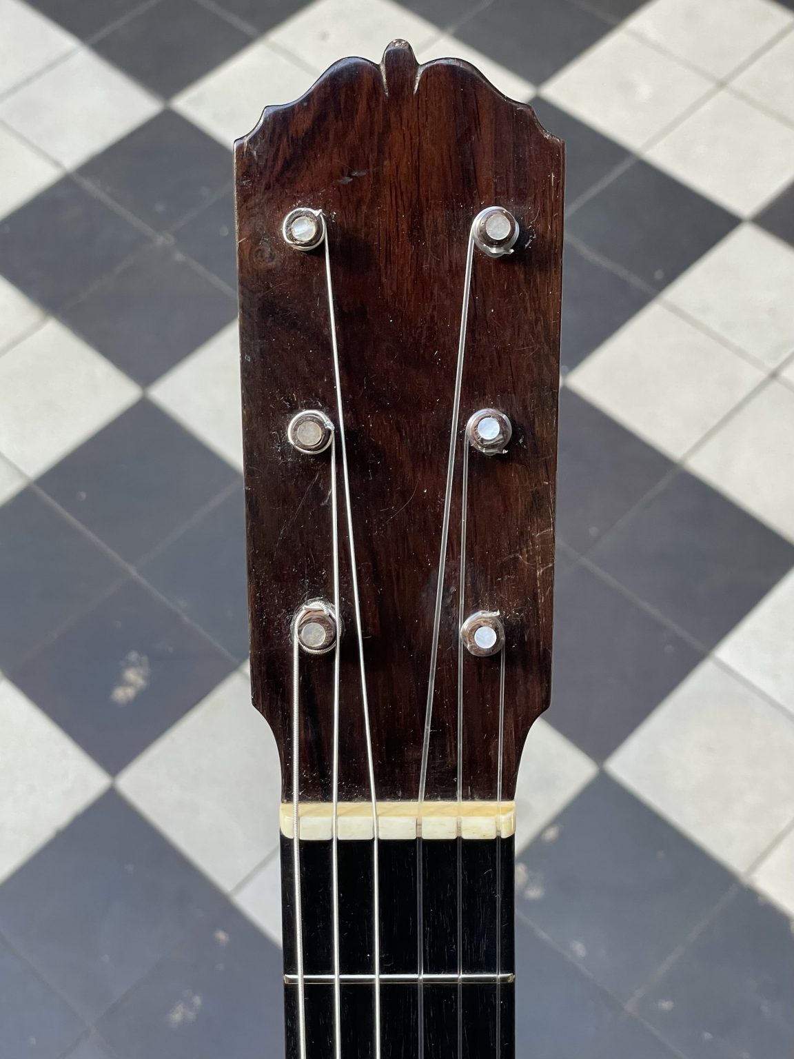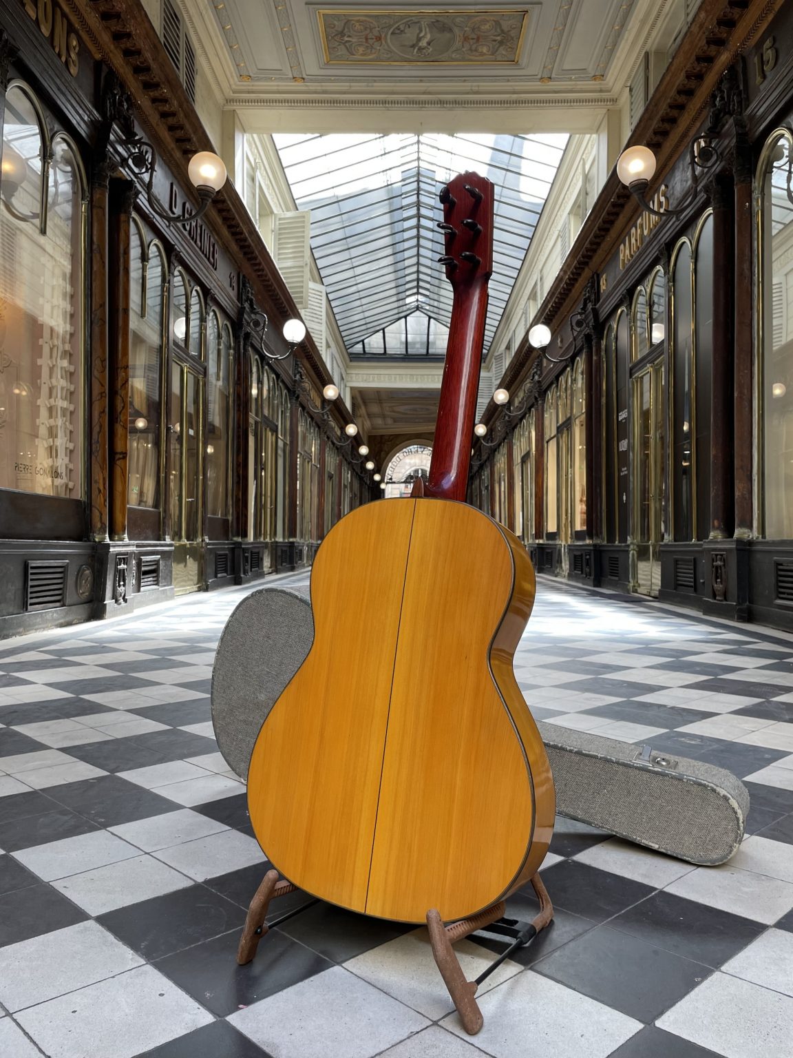 This guitar remains, fifty-five years after its construction, in excellent condition. The soundboard is free of cracks or repairs, and the instrument shows only minor playing wear. A double golpeador was installed on the soundboard for flamenco playing. We have thoroughly set up this guitar in our workshop, including fret levelling and polishing, action and intonation adjustment at the nut and bridge saddle, tuning pegs greased and fitted, and string st up, to ensure the perfect playing condition of the instrument.