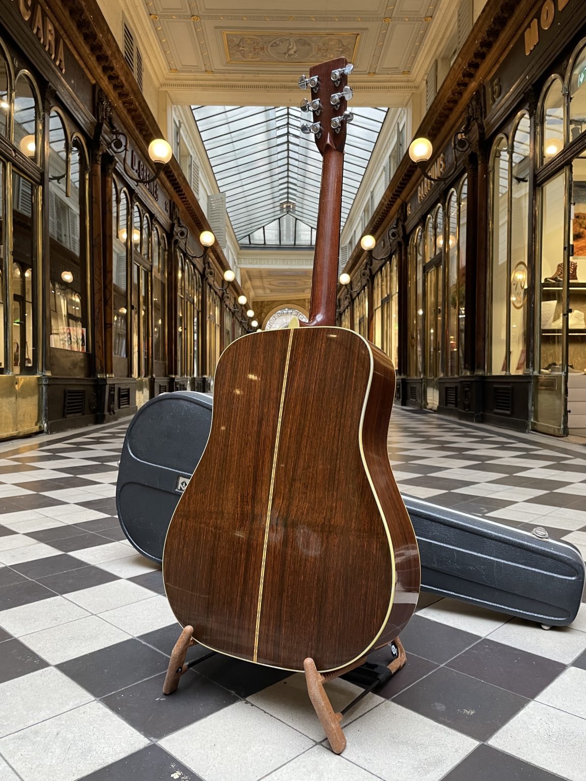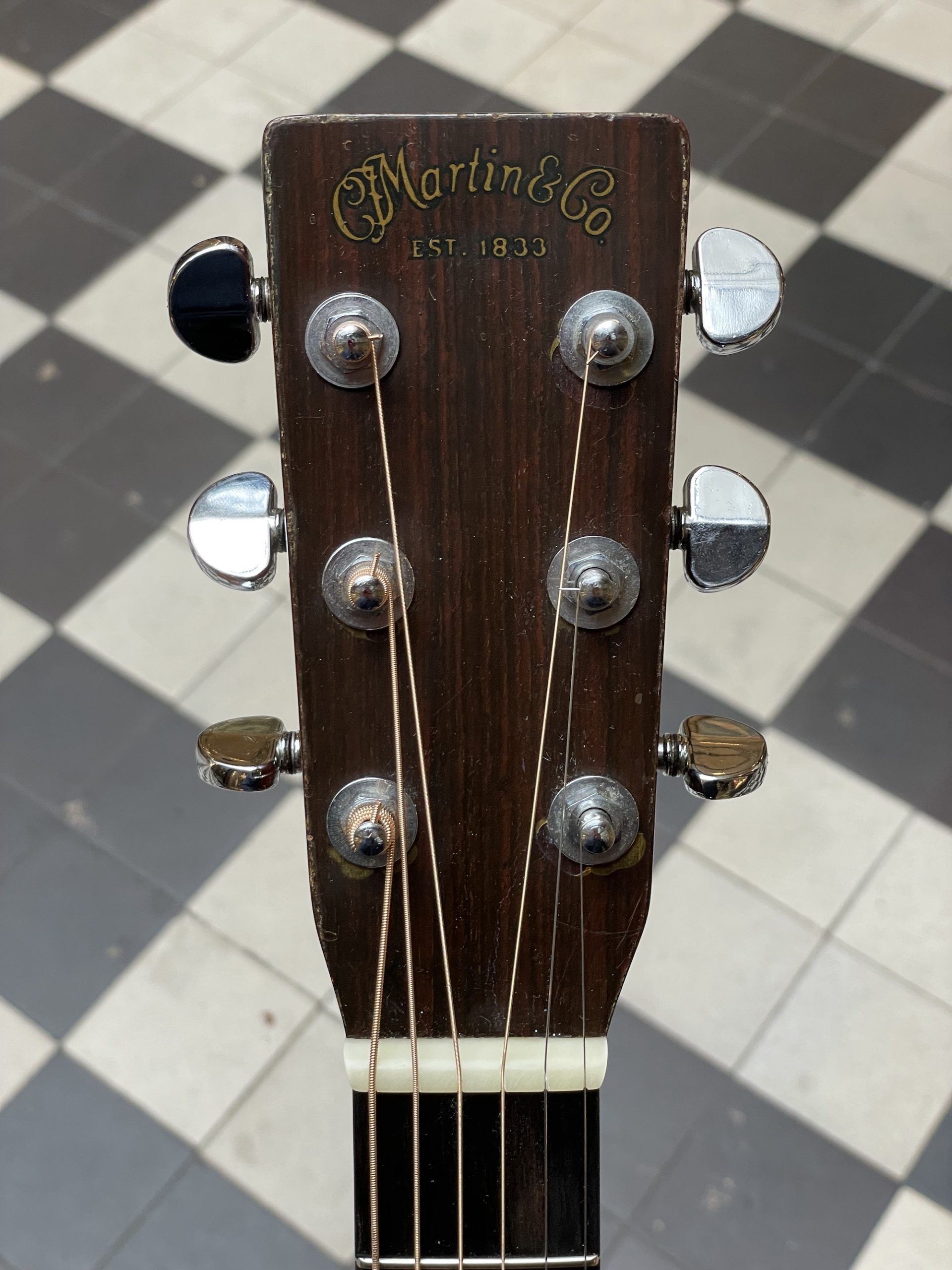 The rosewood models from the late 1960s/early 1970s also reflect the shift from Brazilian rosewood, historically used for the back and sides since Martin’s early days, to Indian rosewood. As is the case with this guitar, the first Indian rosewood models boasted very high-quality wood with a regular and beautifully figured grain. The guitar also displays all the typical features of the era: a soundboard with a lovely amber natural finish and 6-ply celluloid binding, an ebony bridge with a short nut, and a black celluloid pickguard. The mahogany neck is topped with an ebony fingerboard. An interesting detail is that the headstock has much better-defined corners than those of late 1960s models. This is due to the routing jigs Martin used to shape the headstock, which, after decades of use, became increasingly rounded until they were replaced in the early 1970s—roughly around when the model presented here was built.
