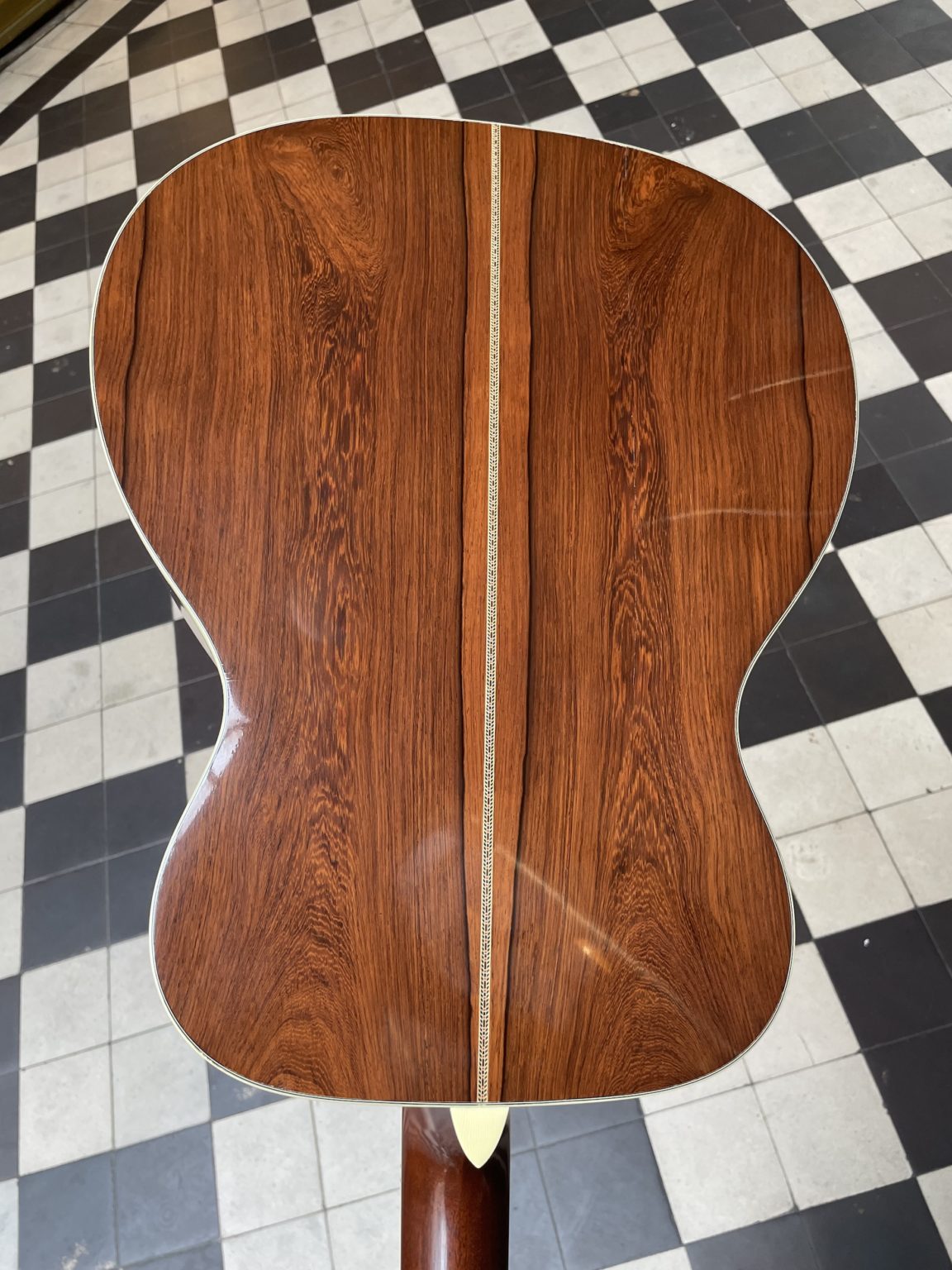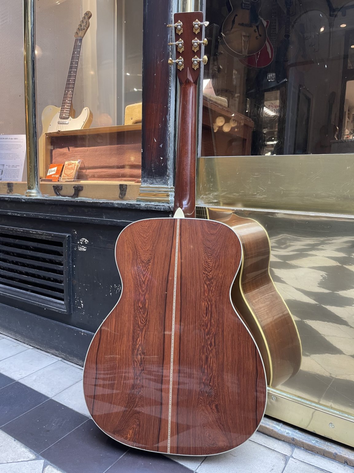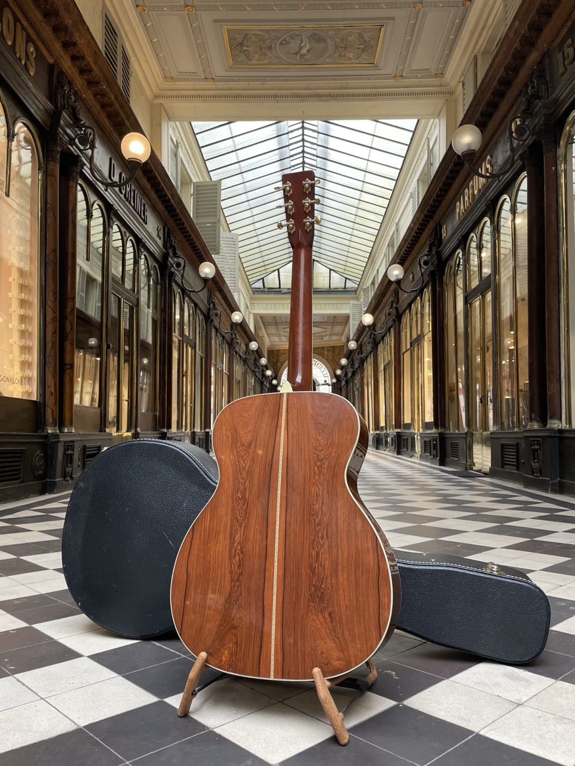 This model is part of a limited series of less than 200 instruments produced between 2008 and 2011, signed by the hand of country-blues musician Stefan Grossman. The instrument condenses construction and finishing elements characteristic of high-end guitars produced in Nazareth, notably those of styles 28 and 40 to 45: tight-grain Sitka spruce top; back, sides and headstock veneer in a superbly figured Madagascar rosewood, ebony fingerboard and bridge, snowflake style fingerboard inlays, rosette surrounded by mother-of-pearl purfling, top binding with herringbone patterns (borrowed from the style 28 of the 30s and 40s), Martin logo inlaid in mother-of-pearl on the headstock in accordance with style 45… hence the choice of an intermediate number, 38! The format of the instrument is not the most conventional either: J for Jumbo, this size is in reality similar to that of the F archtops produced by Martin from 1935 to 1942 with the exception of the body depth which is increased to reach that of a dreadnought. As a result, the guitar develops an impressive sonic power, without losing precision across the entire frequency range. Add to that a long scale and a nut width of 1 3/4 inch and we obtain an instrument exceptionally well suited to finger picking or flat picking!