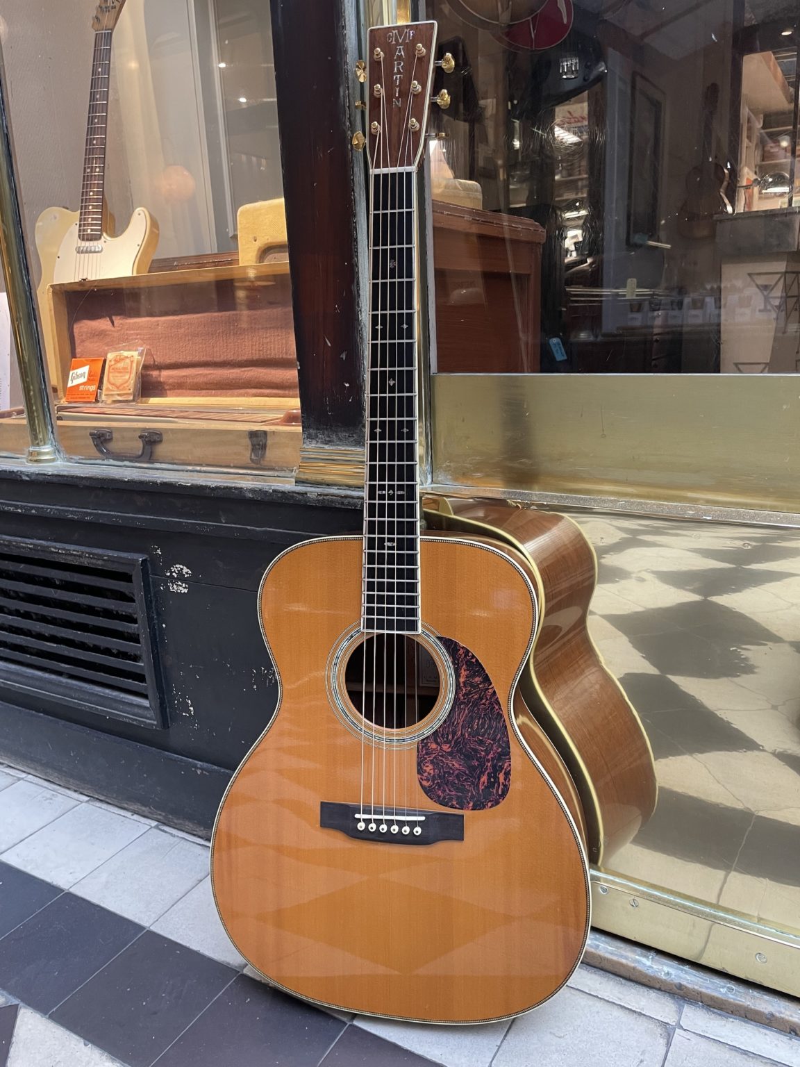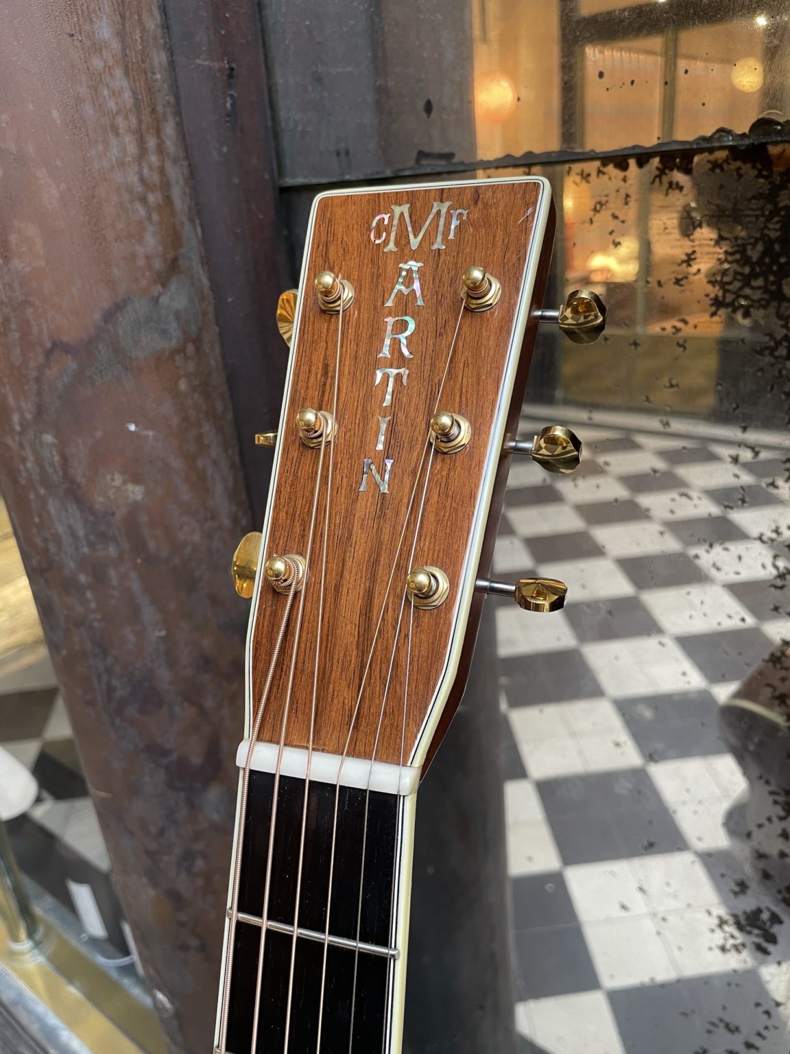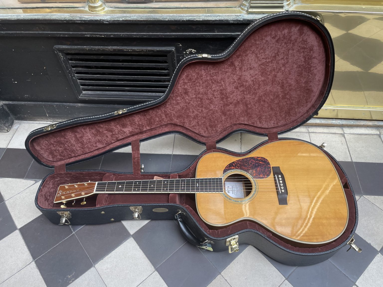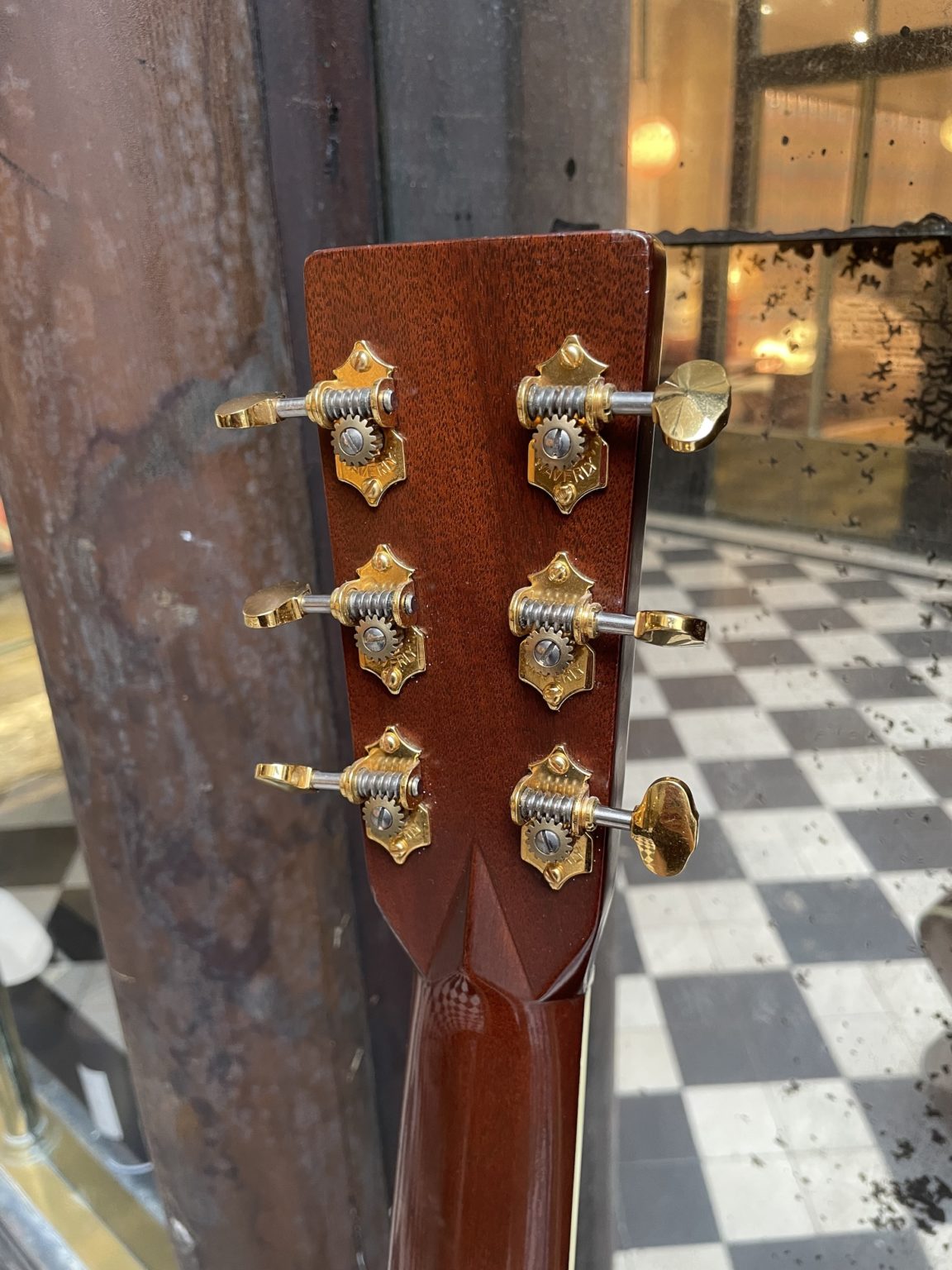 This model is part of a limited series of less than 200 instruments produced between 2008 and 2011, signed by the hand of country-blues musician Stefan Grossman. The instrument condenses construction and finishing elements characteristic of high-end guitars produced in Nazareth, notably those of styles 28 and 40 to 45: tight-grain Sitka spruce top; back, sides and headstock veneer in a superbly figured Madagascar rosewood, ebony fingerboard and bridge, snowflake style fingerboard inlays, rosette surrounded by mother-of-pearl purfling, top binding with herringbone patterns (borrowed from the style 28 of the 30s and 40s), Martin logo inlaid in mother-of-pearl on the headstock in accordance with style 45… hence the choice of an intermediate number, 38! The format of the instrument is not the most conventional either: J for Jumbo, this size is in reality similar to that of the F archtops produced by Martin from 1935 to 1942 with the exception of the body depth which is increased to reach that of a dreadnought. As a result, the guitar develops an impressive sonic power, without losing precision across the entire frequency range. Add to that a long scale and a nut width of 1 3/4 inch and we obtain an instrument exceptionally well suited to finger picking or flat picking!
