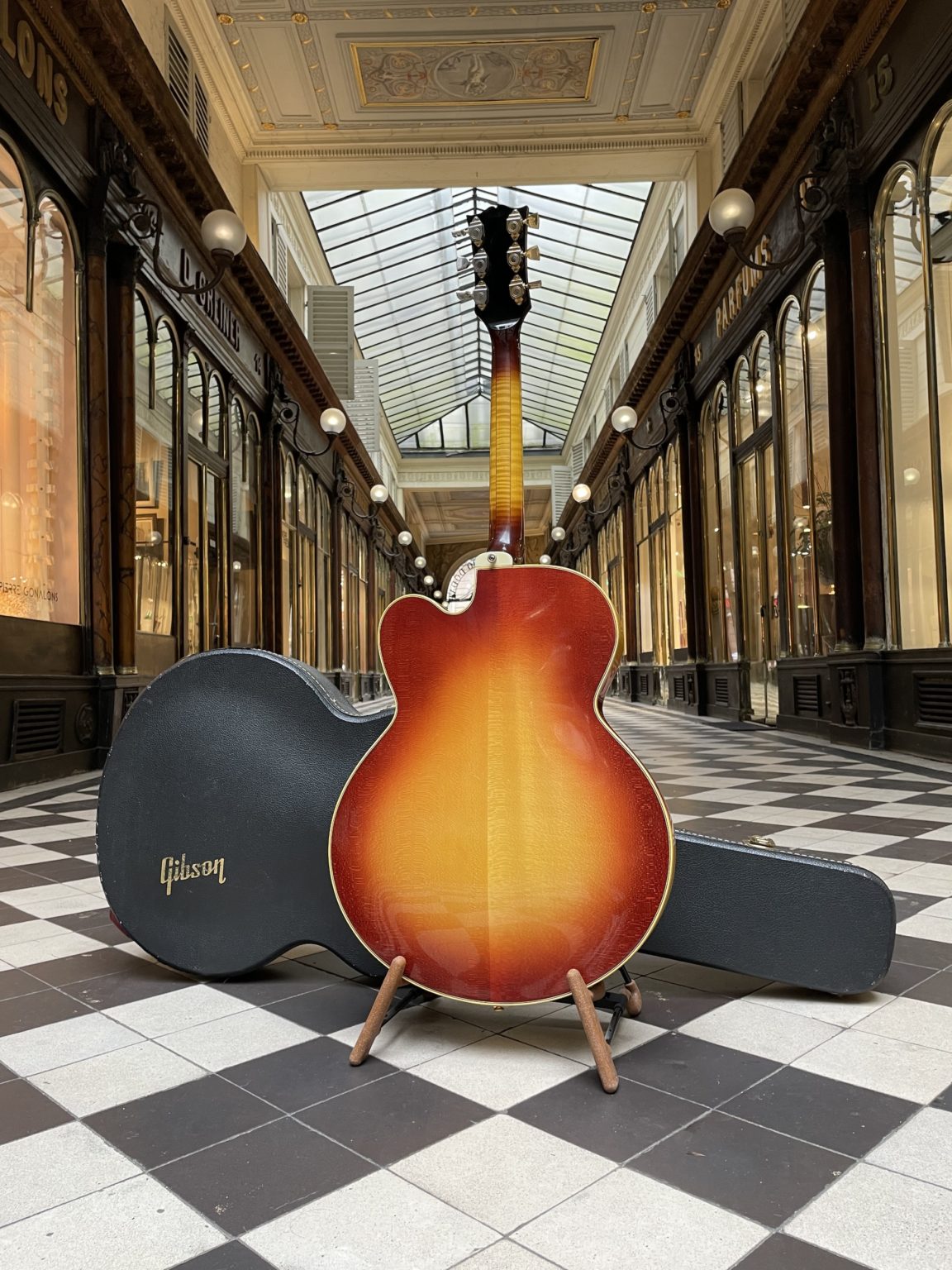 For the rest, the guitar has all the characteristics of the most high-end instruments manufactured by Gibson: carved spruce top, maple back and sides, flamed maple neck topped with an ebony fingerboard, numerous mother-of-pearl inlays – block-shaped on the fingerboard, the flowerpot on the headstock as well as the name of the brand, gold hardware, tailpiece engraved with the name of the model… The instrument is in excellent condition, entirely original with the exception of its pickguard: it is common for the plastic materials used at the time to have decomposed, releasing a gas that oxidizes the metal parts of the instrument. We thus note a loss of gold on the treble side tuners, and the original Patent No. pickup covers have been repolished.