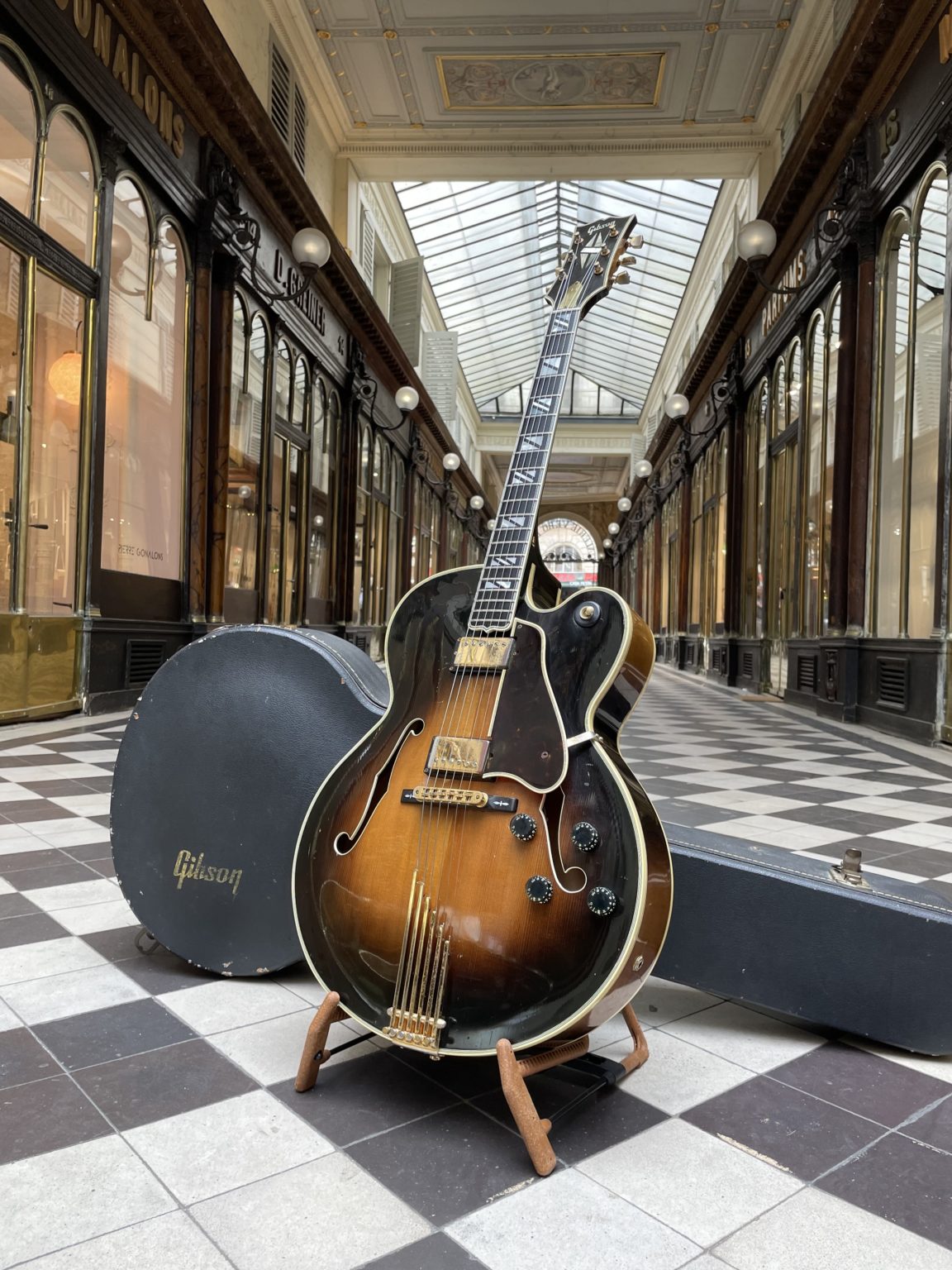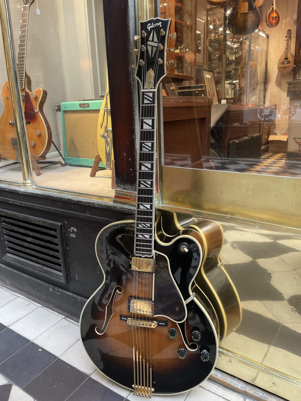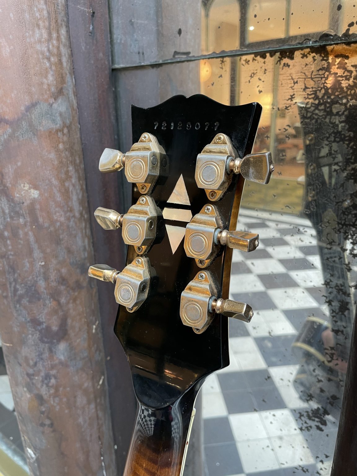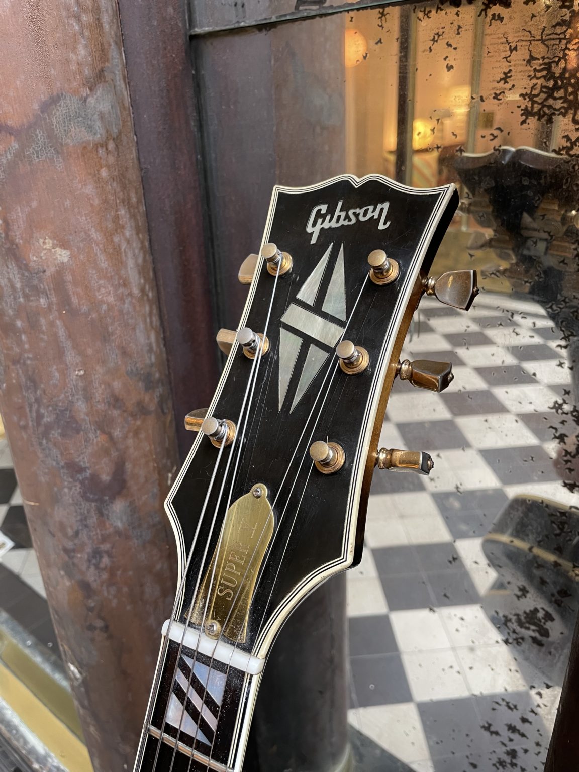 Introduced to the Gibson catalog in 1978, the Super V CES is a beautiful archtop model condensing the attributes of two classics of the kind. On one side, the curly maple neck with an ebony fingerboard decorated with segmented parallelogram inlays, on top of which sits a large headstock featuring the diamond inlays on the front and back, is directly borrowed from the Gibson Super 400. The size of the body comes from the L-5, 17″ in width and 21″ inches which surely for many makes the format more manageable than that of an imposing Super 400. The guitar is equipped from its two Patent No. humbucking pickups, offering a wide range of sounds to work on with the volume and tone controls. The particularity of the Super V CES consists of its micro-ajustable finger tailpiece, allowing each of the strings to be adjusted separately.