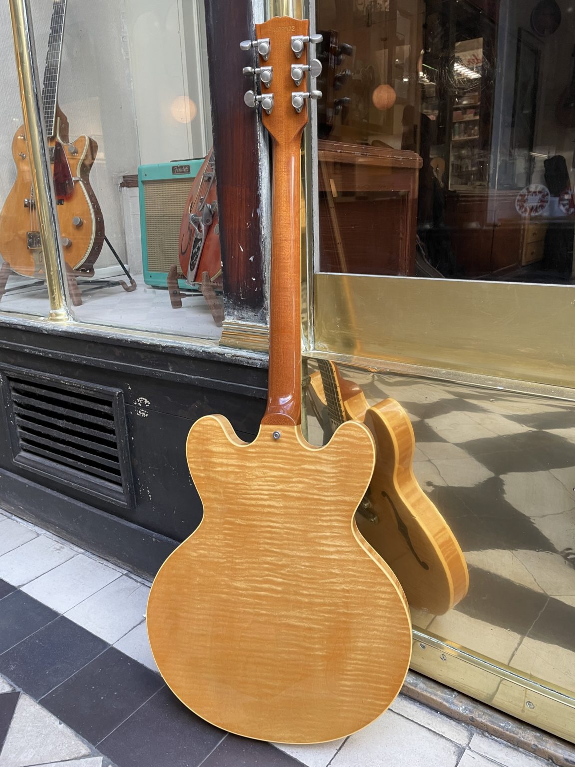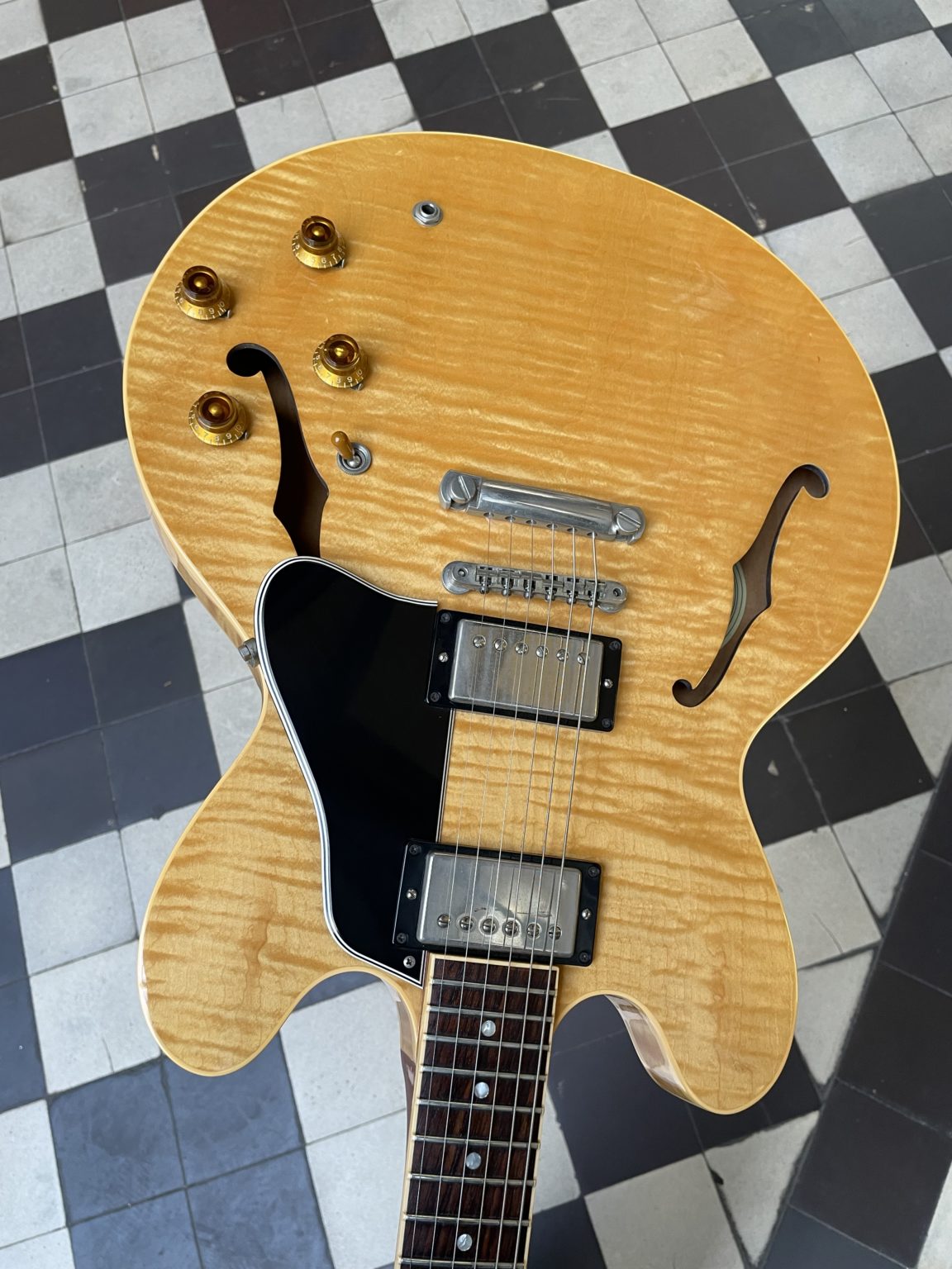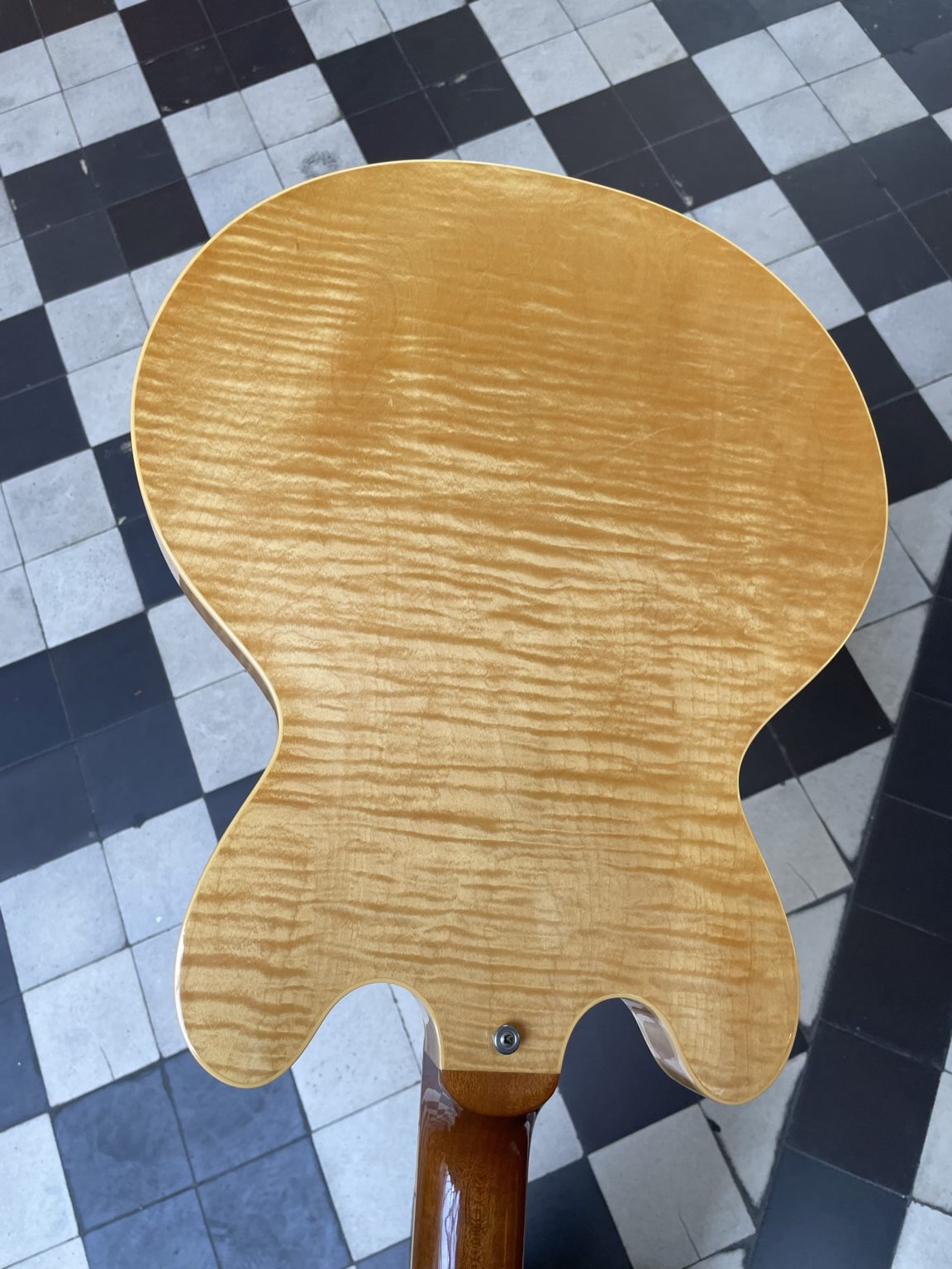 Here is a modern interpretation of the iconic semi-hollowbody model launched in 1958 – this guitar is all in all perfectly faithful to its lineage: “dot” style fingerboard inlays, hardtail bridge, two Gibson PAF type pickups, hard to get any closer to the source! Add to that the splendid Natural finish, revealing an exquisite flamed maple of exceptional grain and quality on the top, sides and back, what more could you ask for… Complete professional setup done in our workshop, ready to play.