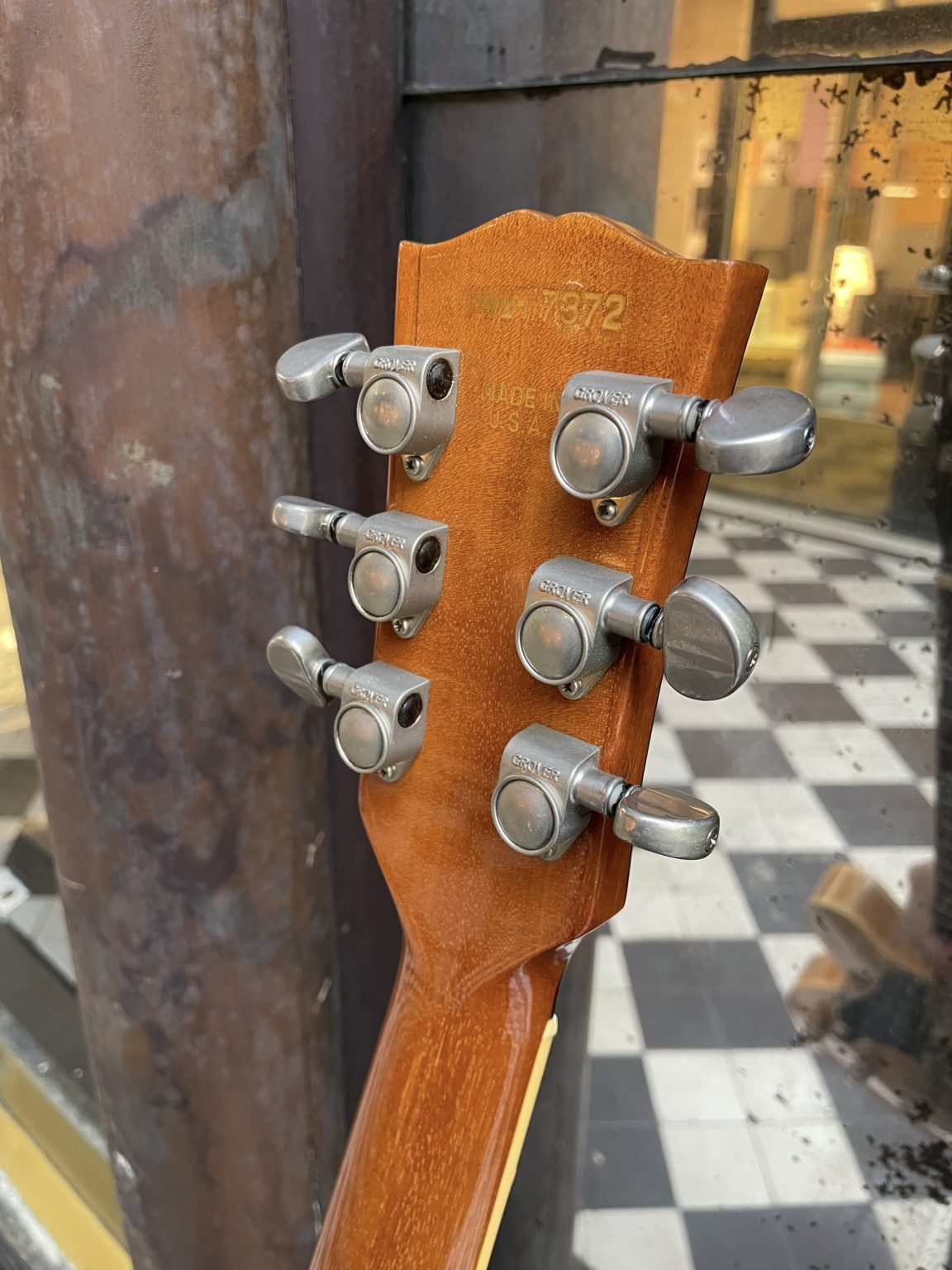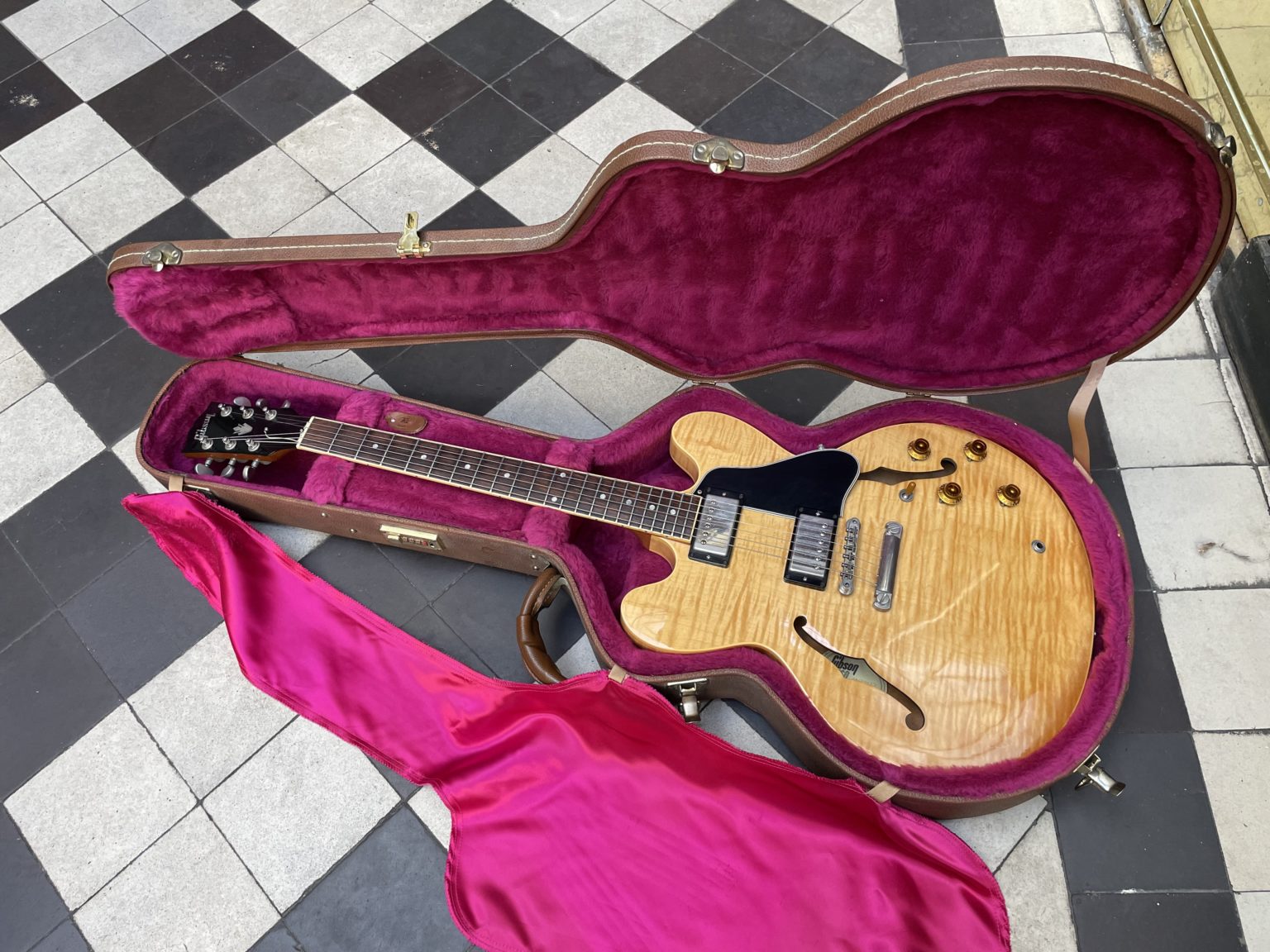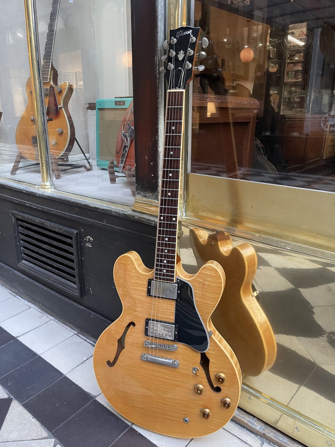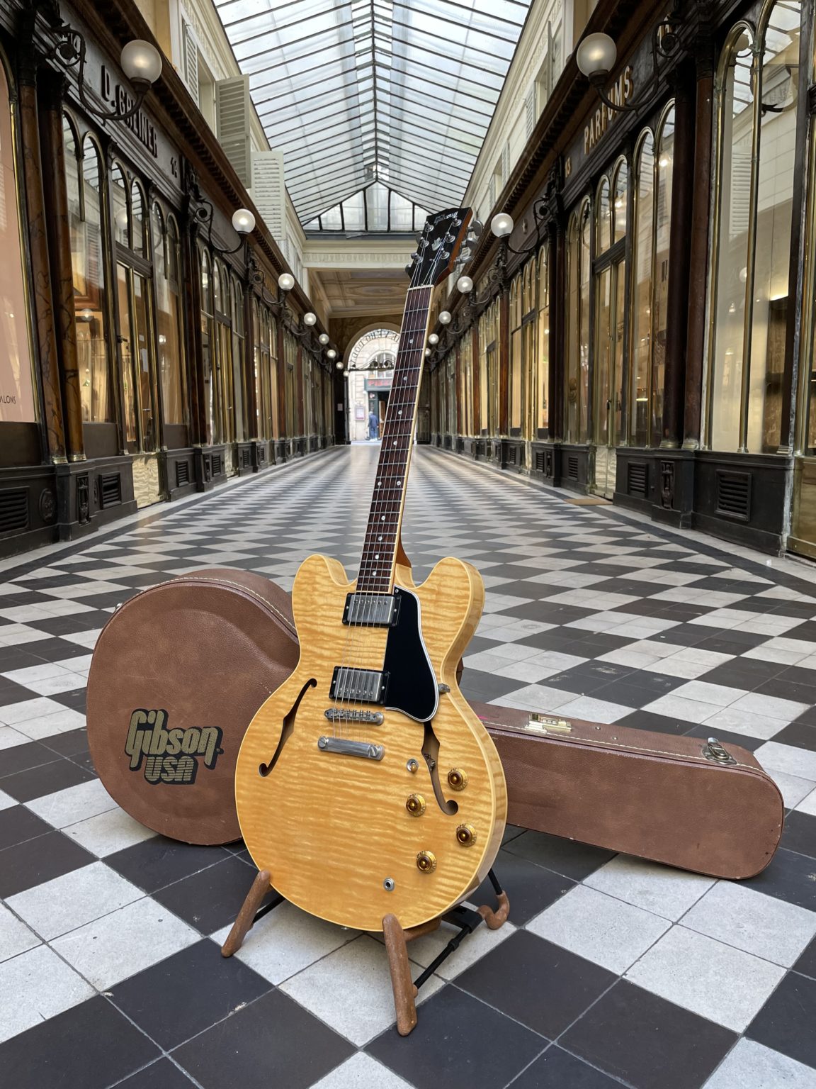 Here is a modern interpretation of the iconic semi-hollowbody model launched in 1958 – this guitar is all in all perfectly faithful to its lineage: “dot” style fingerboard inlays, hardtail bridge, two Gibson PAF type pickups, hard to get any closer to the source! Add to that the splendid Natural finish, revealing an exquisite flamed maple of exceptional grain and quality on the top, sides and back, what more could you ask for… Complete professional setup done in our workshop, ready to play.