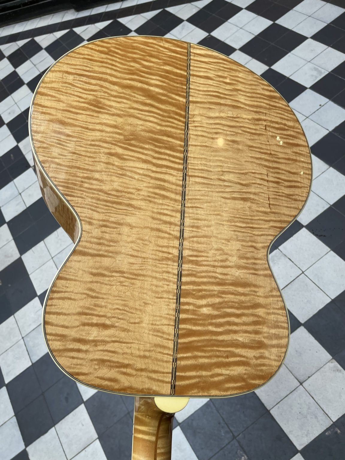 From its introduction just before World War II to the present day, the premise of this model has been simple: offering a flat-top guitar that is as luxurious as possible, combining exquisite materials and the skills of the finest luthiers. This early-millennia example is no exception: the top is made of a beautiful, tight-grained spruce; the back, sides and neck are covered in intensely figured flamed maple; the fingerboard and signature moustache-shaped bridge with pearl inlays are made of Brazilian rosewood.