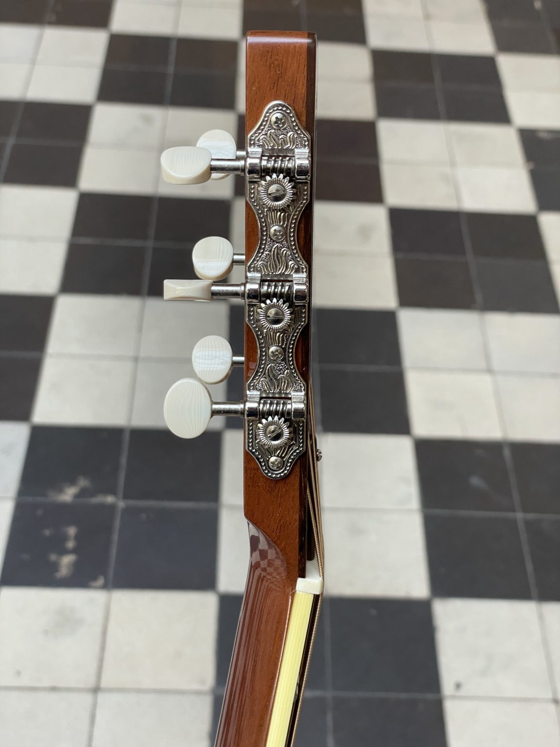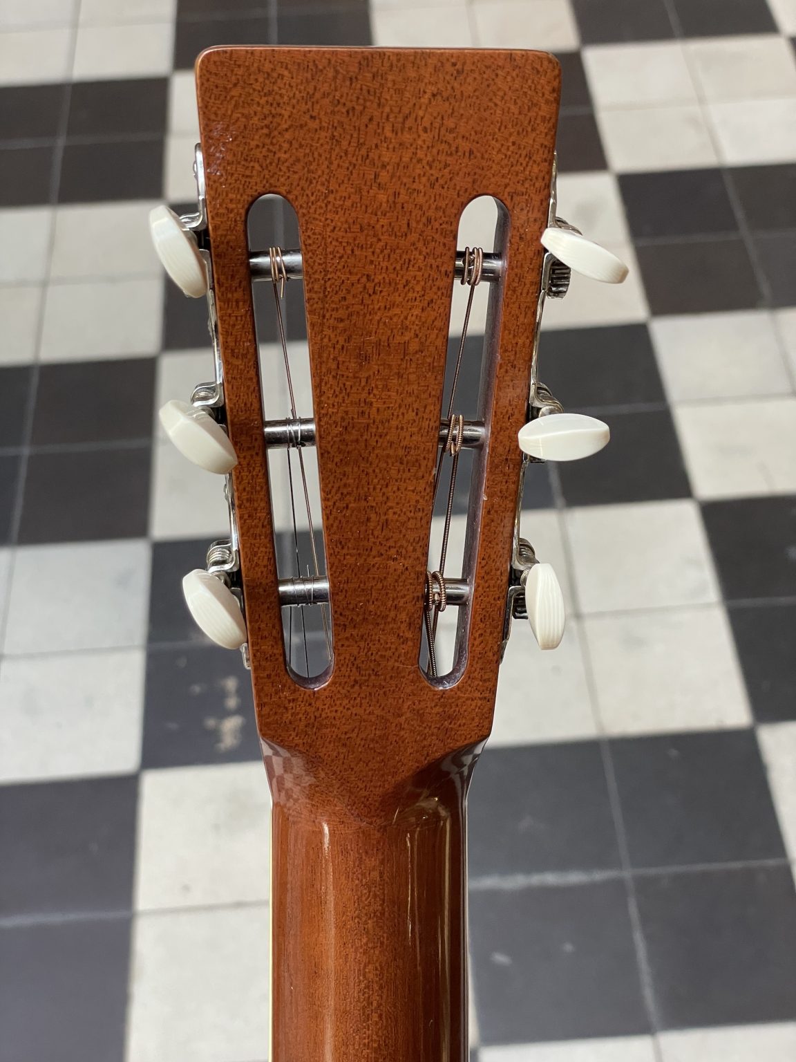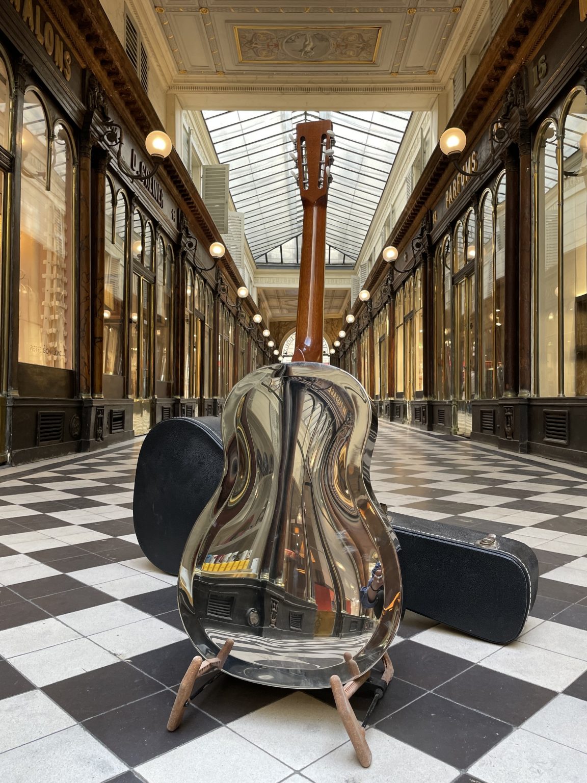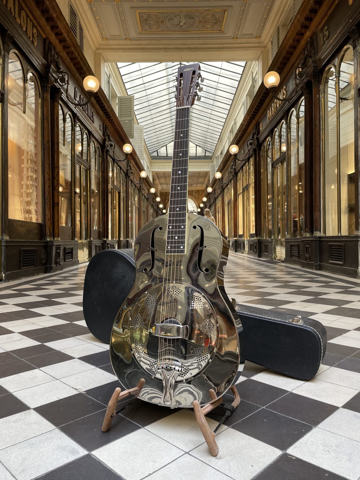 Mike Lewis is a British luthier, now based in the Paris region, specializing in the construction of resonator guitars as well as the restoration of original instruments, mostly produced in pre-war America by companies such as National and Dobro. The instrument presented here demonstrates his expertise, drawing on the iconic Style O model, here an interpretation of the version produced in the first half of the 1930s. It features a construction with a 12-fret neck; a round neck profile; the body features f-holes cut into the metal, not stamped and “rolled” inward as seen on Nationals after 1933. The guitar features a single, wide cone, in the center of which is mounted the biscuit where the strings rest. The instrument’s finish is discrete, with no engravings and nickel plating throughout the body. The neck is mahogany, and the fingerboard is ebony with a single white binding.