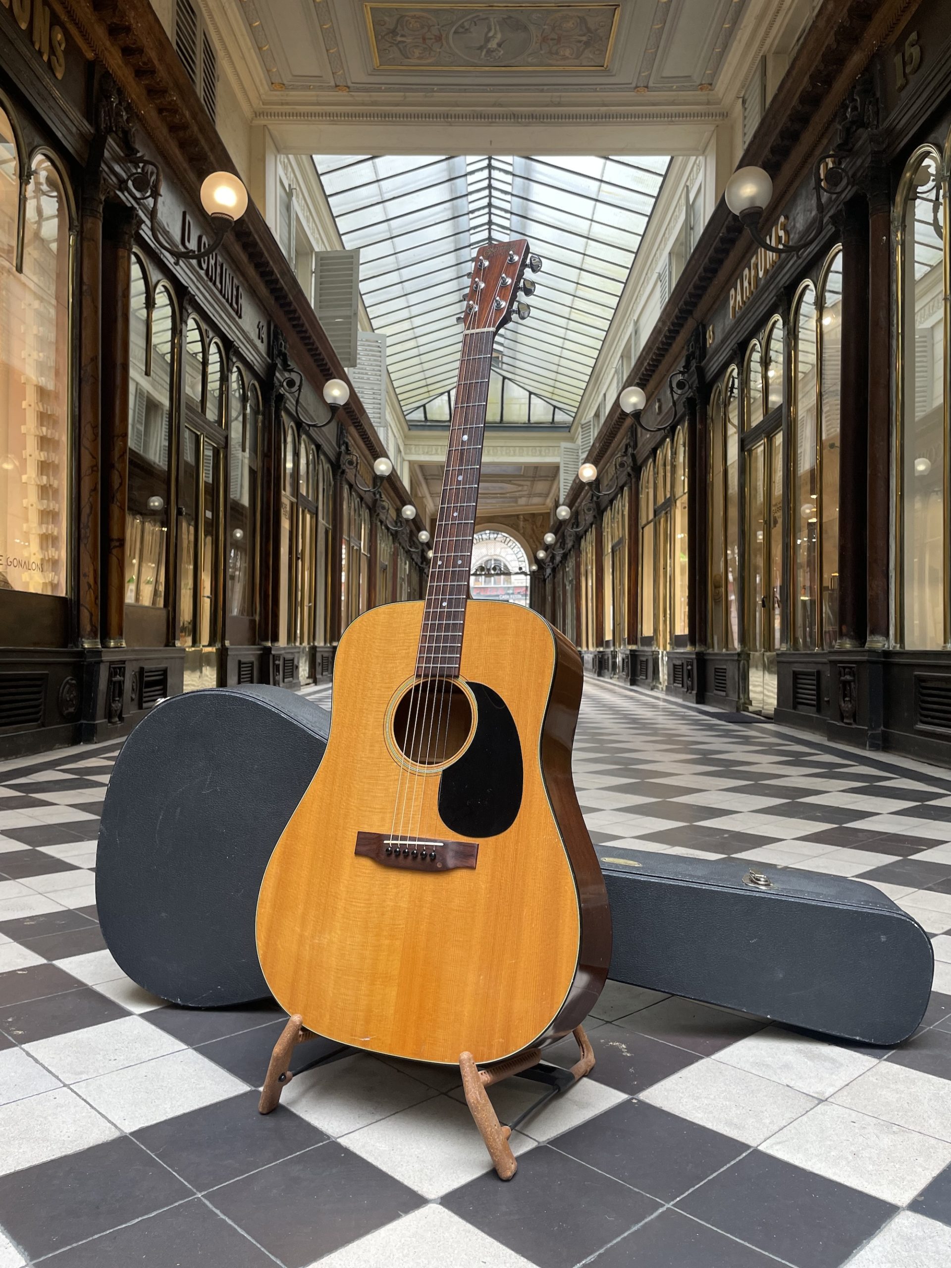 This D-18 dates from the dawn of the 1970s, when Martin dreadnoughts reigned among the most sought-after and used acoustic guitars in the world. Spruce top; mahogany back, sides and neck; rosewood fingerboard, bridge and headstock veneer. To this day, it has a beautiful patina and the usual marks of certain but careful use, and has been equipped with a piezo sensor installed under the bridge saddle, wired to a strap-on jack socket allowing it to be amplified for public performance. Aside from an older drill hole filled in on the bridge, the guitar is free of defects, breaks or restorations. We applied ourselves to refretting the guitar and making a new nut adjusted to the string gauge, followed by a complete setup in order to restore all the playing comfort and accuracy that is possible to obtain from such instruments. .