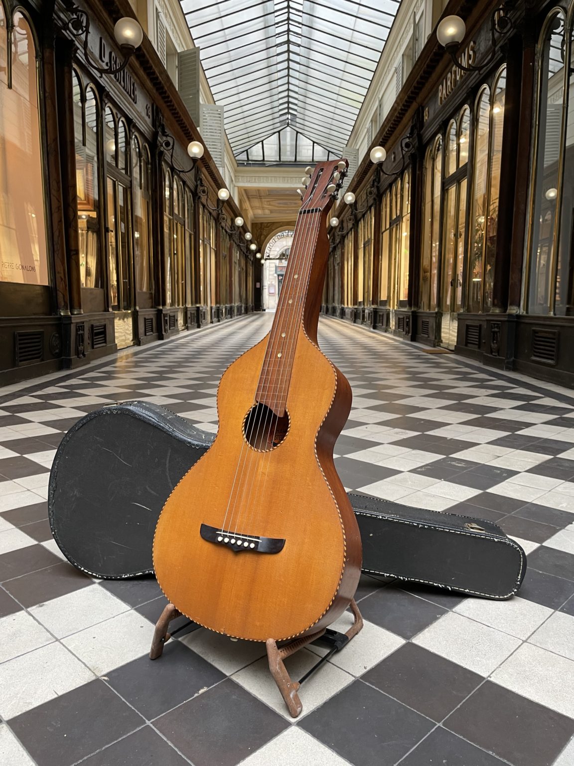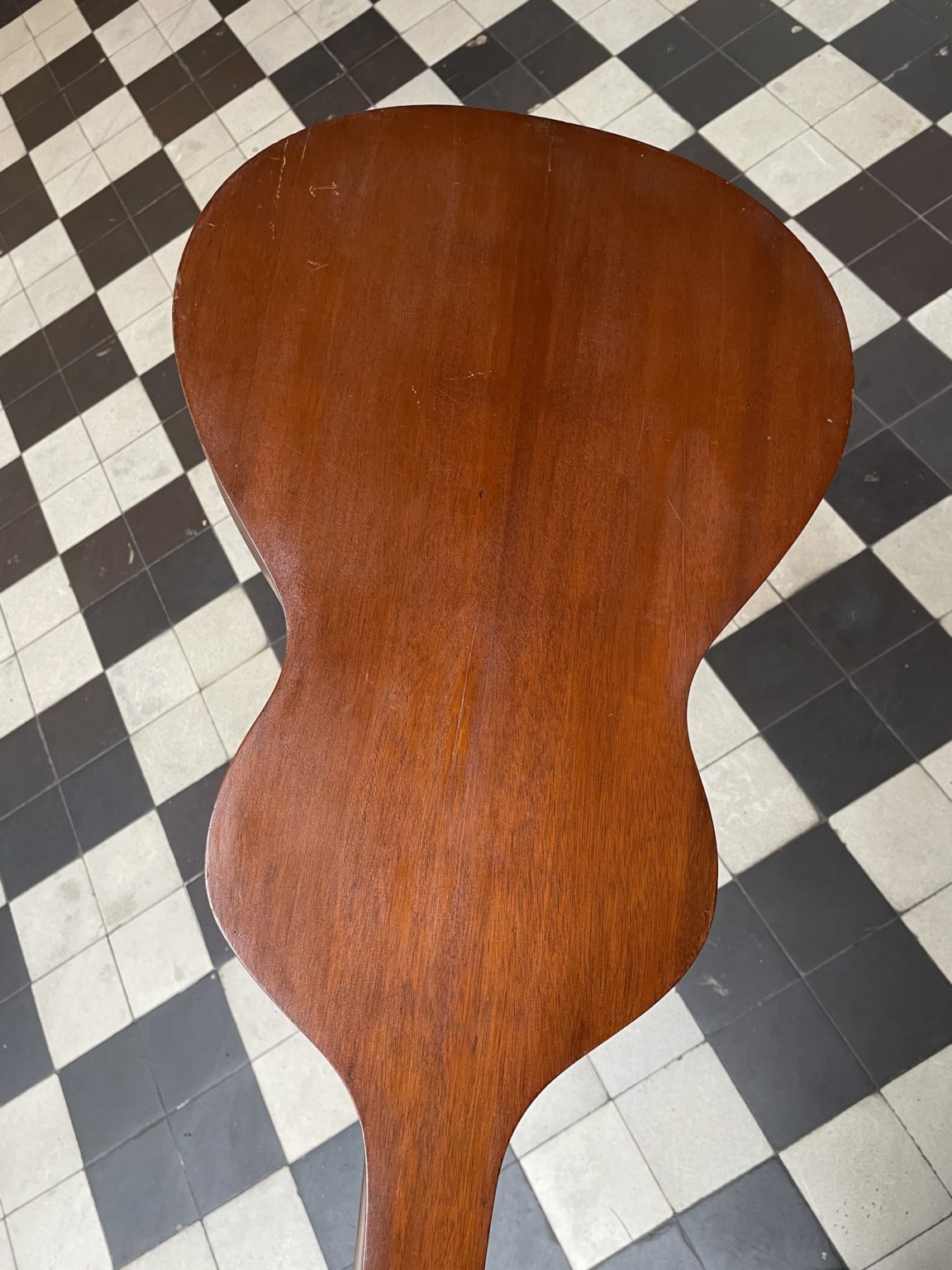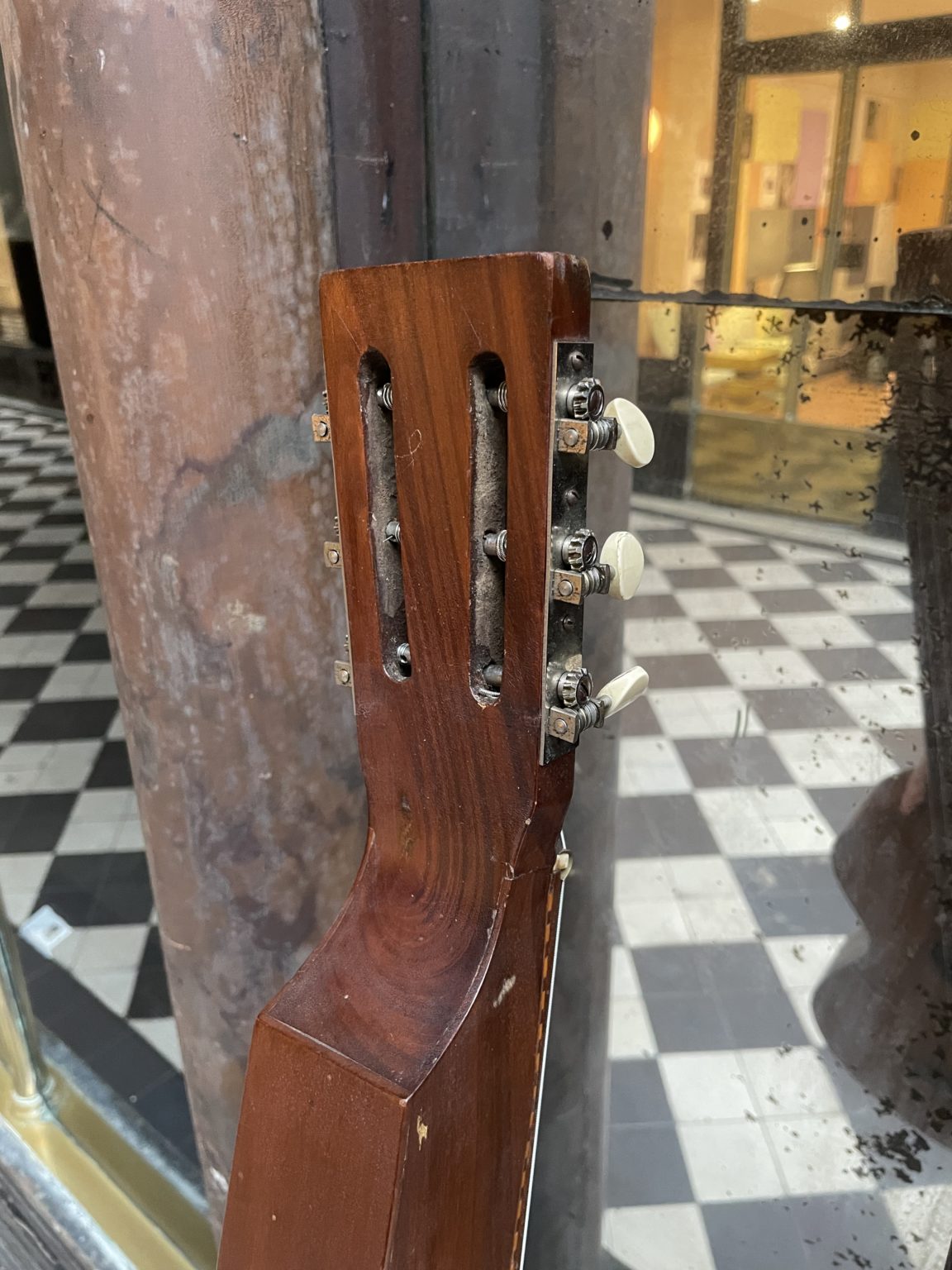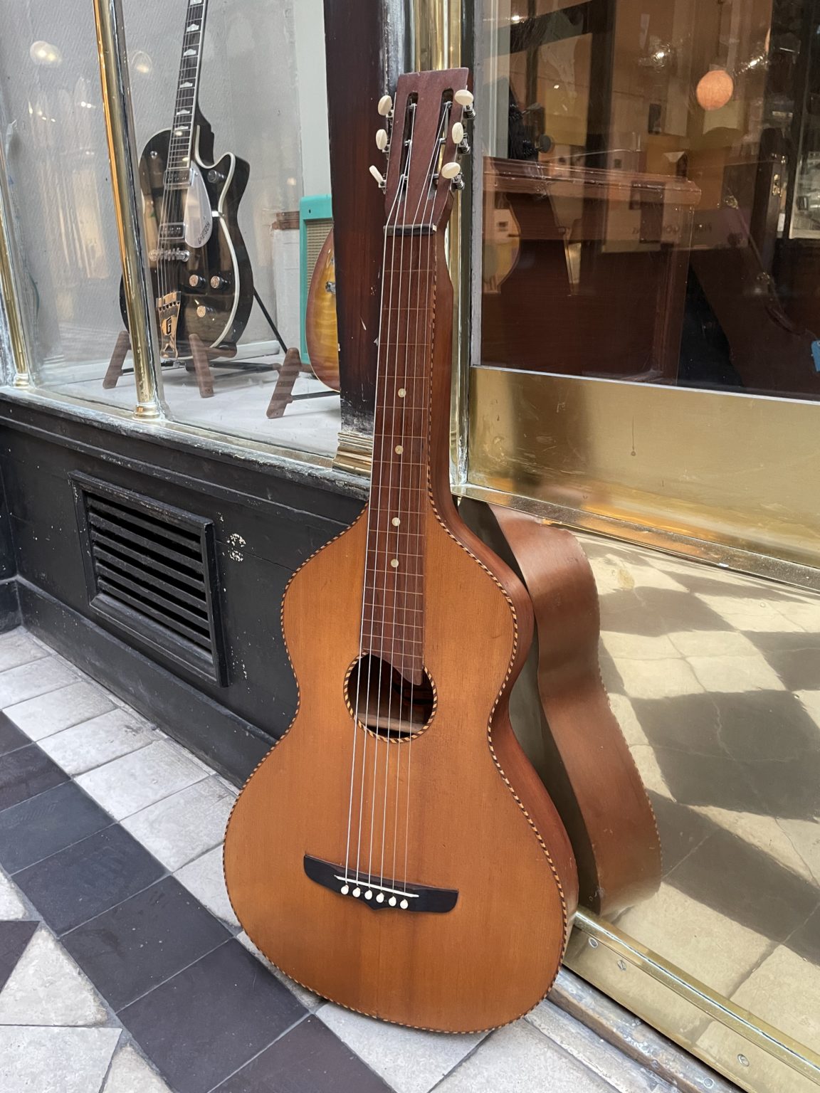 The present model is a Hilo style 640, relatively simply built, with a spruce top and mahogany sides and back. The fretboard has basic dot inlays, and there is a rope-style binding around the top of the instrument, which is inspired by Weissenborn guitars. Despite this apparent plainness, the guitar has a beautiful tone, with deep basses and long, rich sustain.